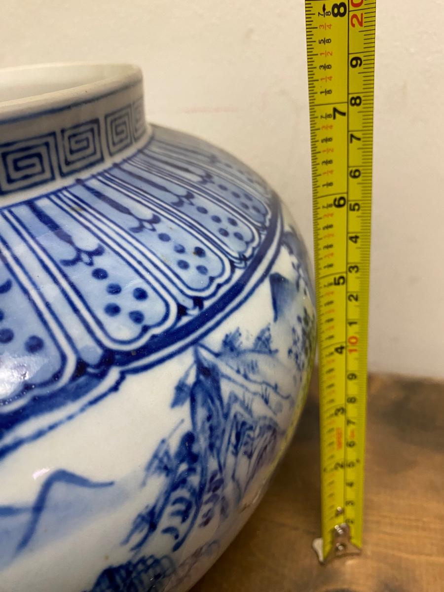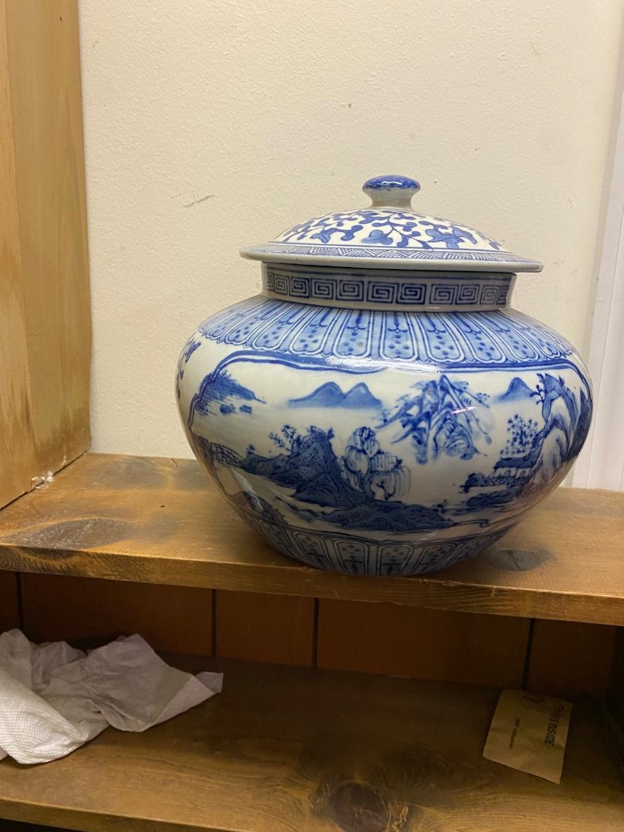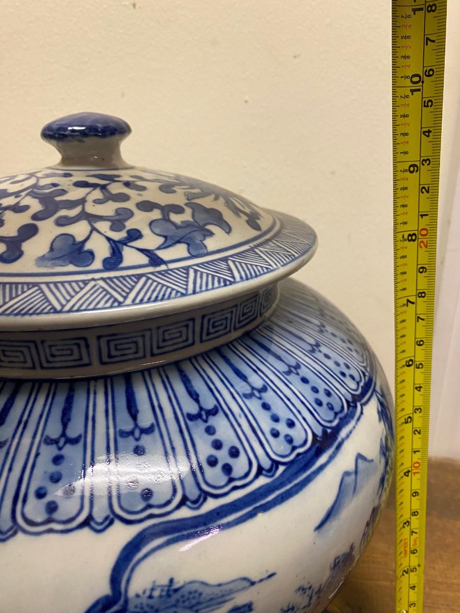 Mid 20th Century Chinese Blue and White Floral & Landscape Porcelain Lidded Urn. Makers mark on botom