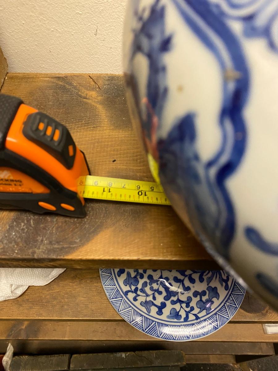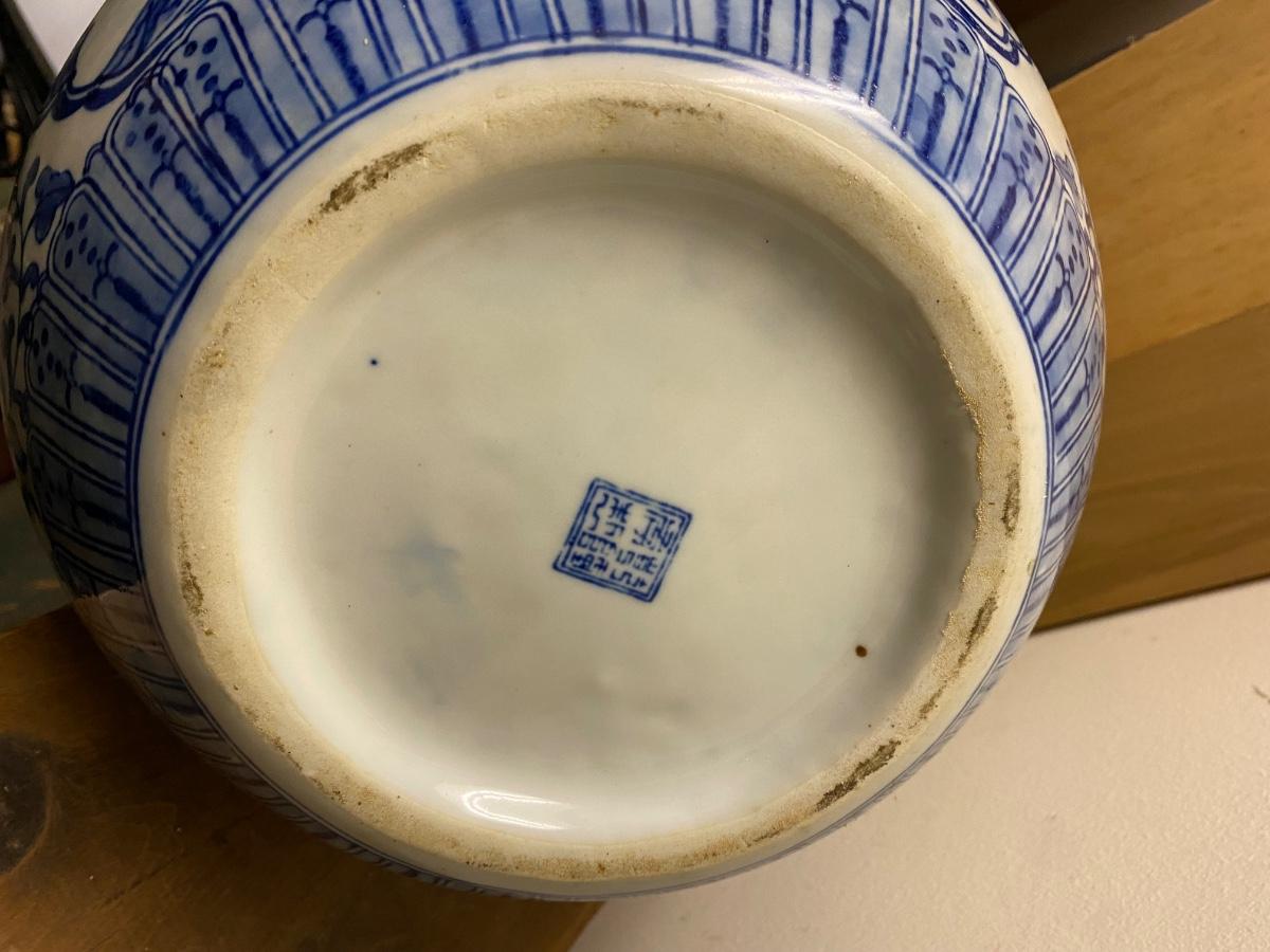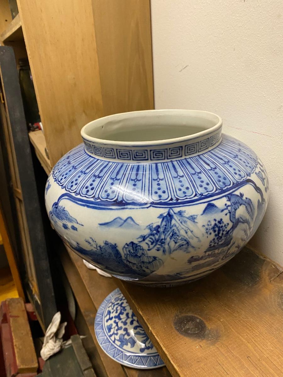 Mid 20th Century Chinese Blue and White Floral & Landscape Porcelain Lidded Urn. Makers mark on botom