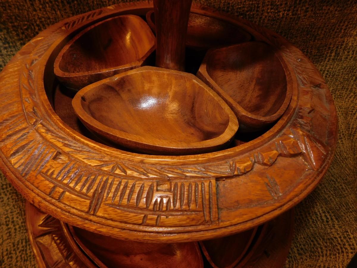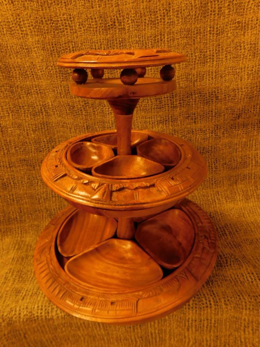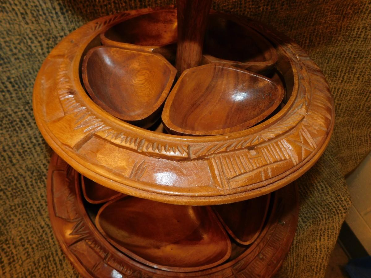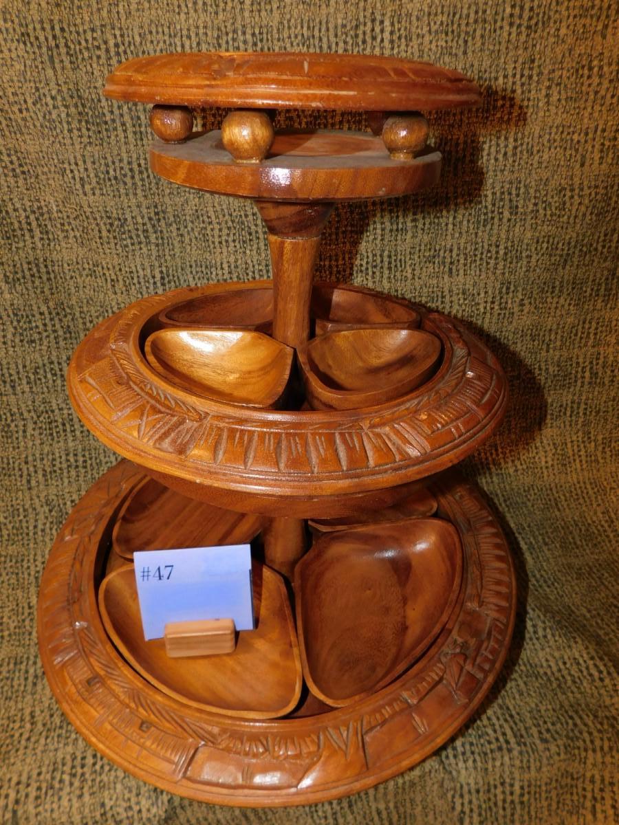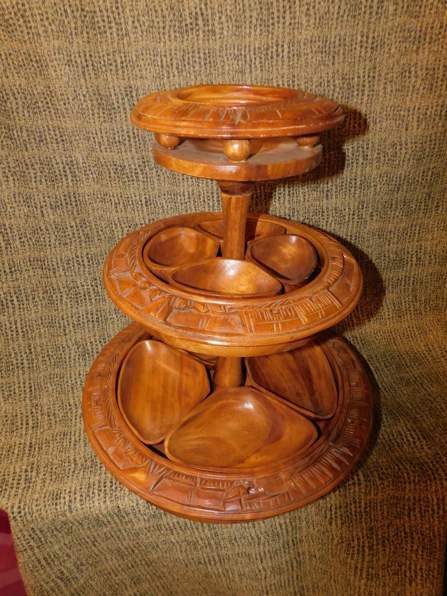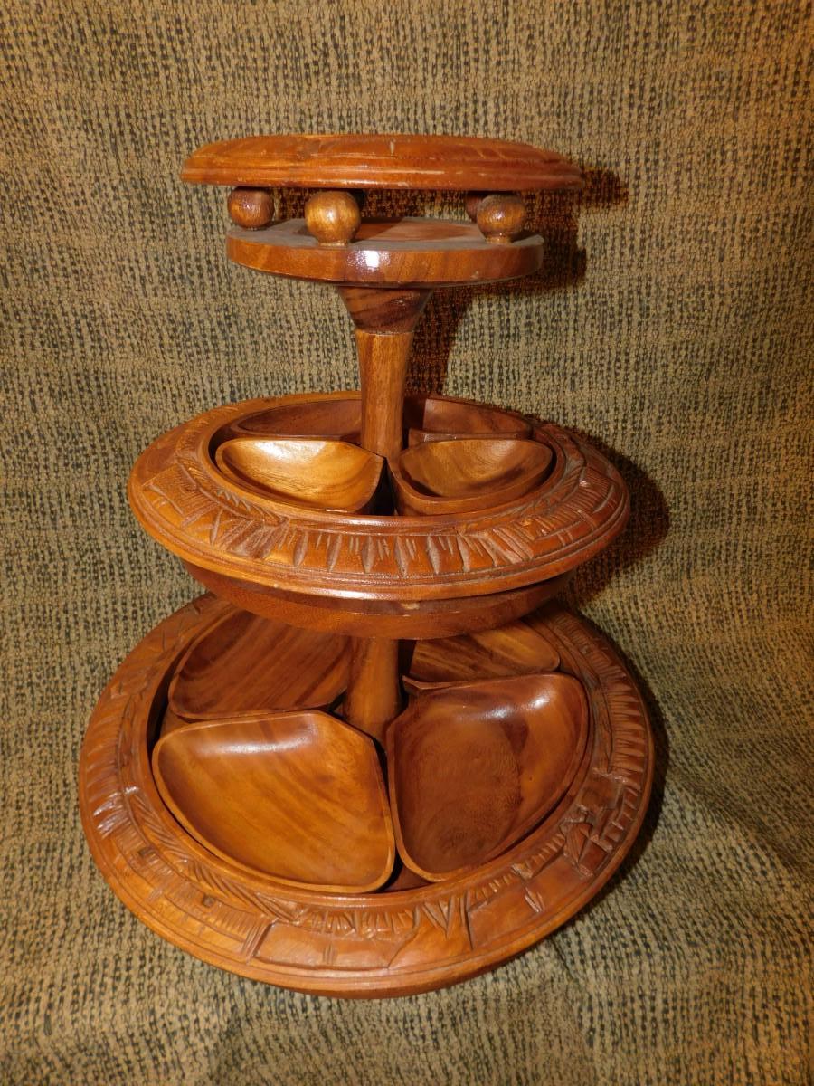 Mid 20th Century Monkey Pod 3 Tier Appetizer/Condiment Centerpiece