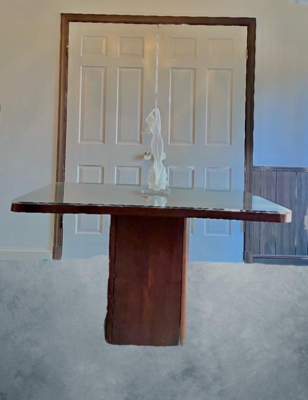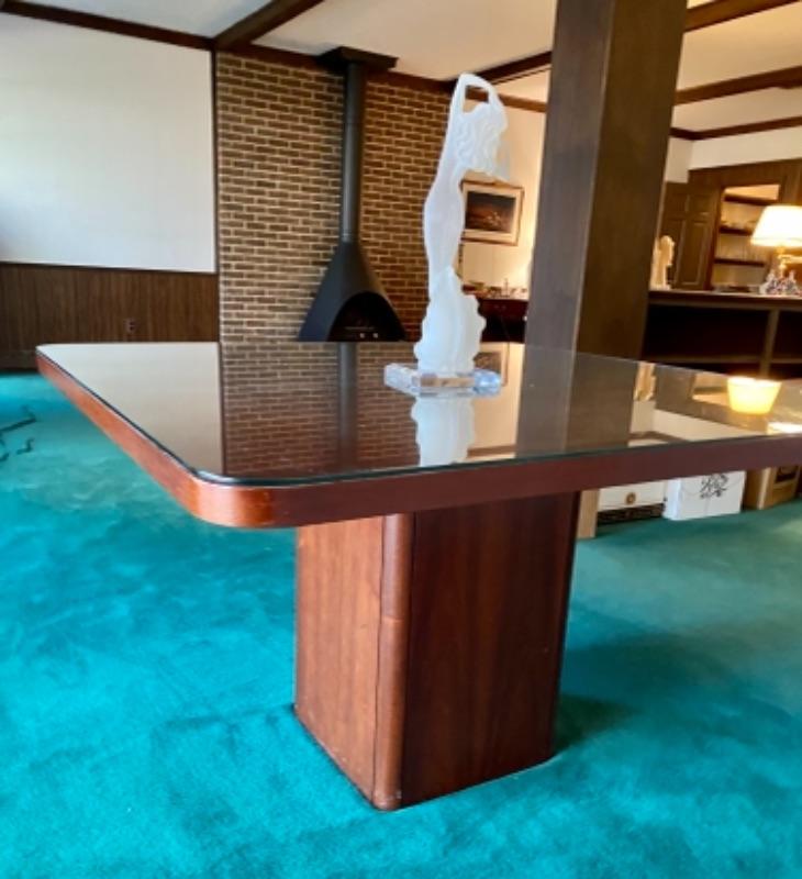 This piece was reportedly from old MCM Habitat store in Georgetown , fabulous mahogany with large rounded corner single solid base and heavy square tip with custom glass top to prevent wear .