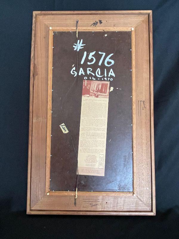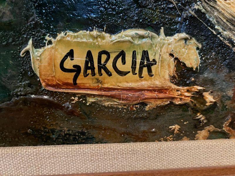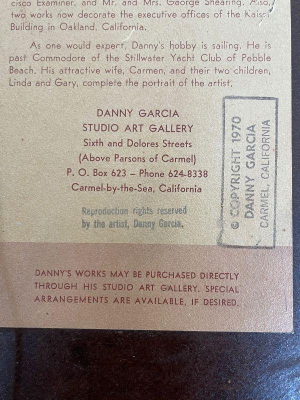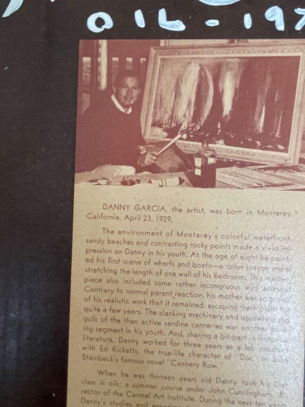 The subject item for auction sale is an original abstract oil painting on panel by noted California artist Danny Garcia. The festive environment of Monterey's Waterfront District and the treasures to be found there are most often the subjects of this artist's work. The scenes of wharves and boats, and the bounties of sail and sea make for colorful renderings of his meanderings.