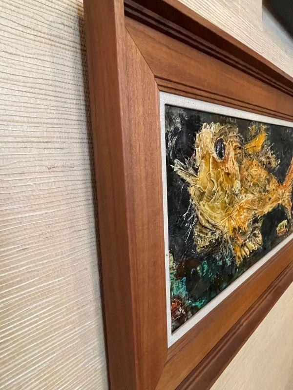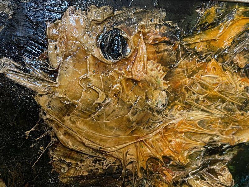 This painting, a slightly abstracted rendering of a large-eyed fish is laid down with oil on panel in with a heavy impasto application of bright yellow, orange and muted green.
