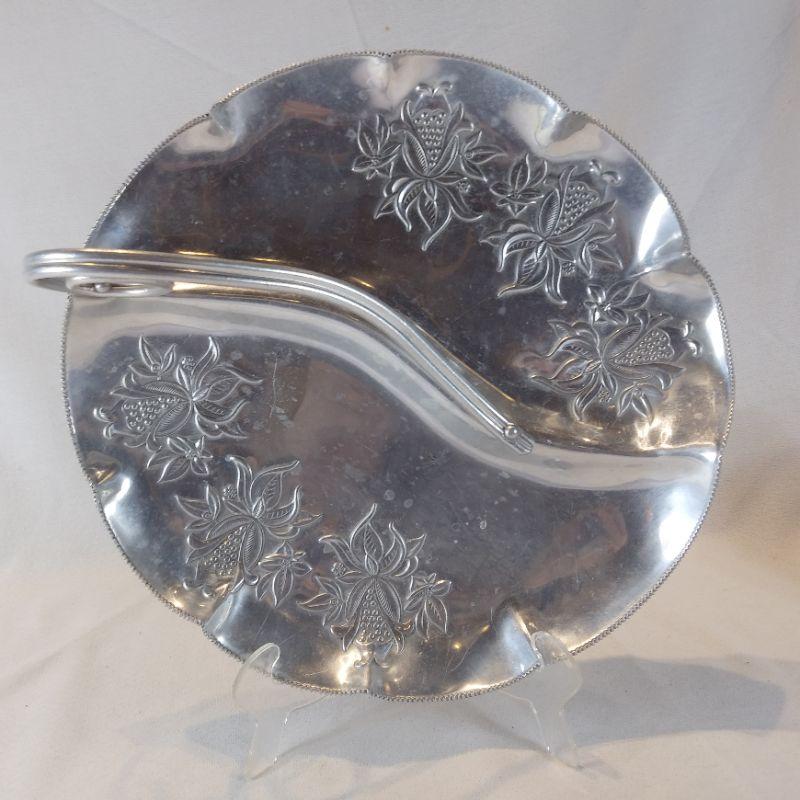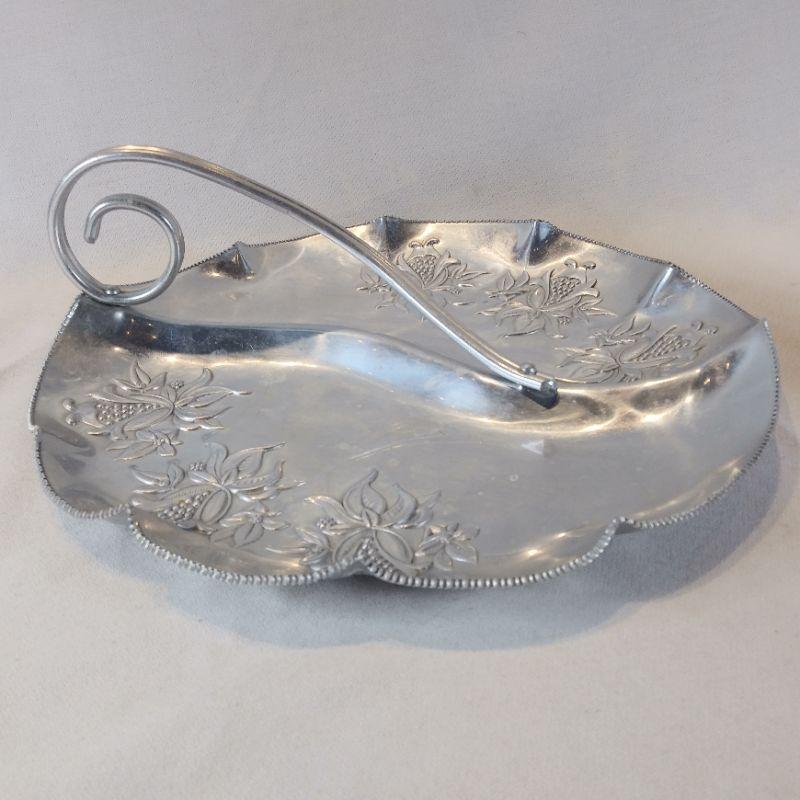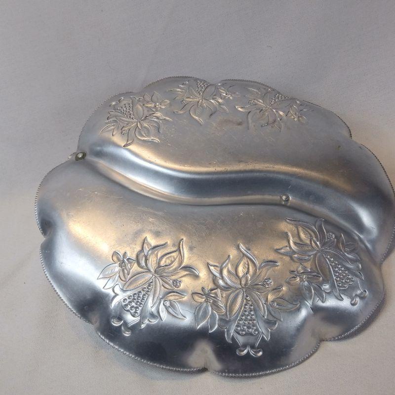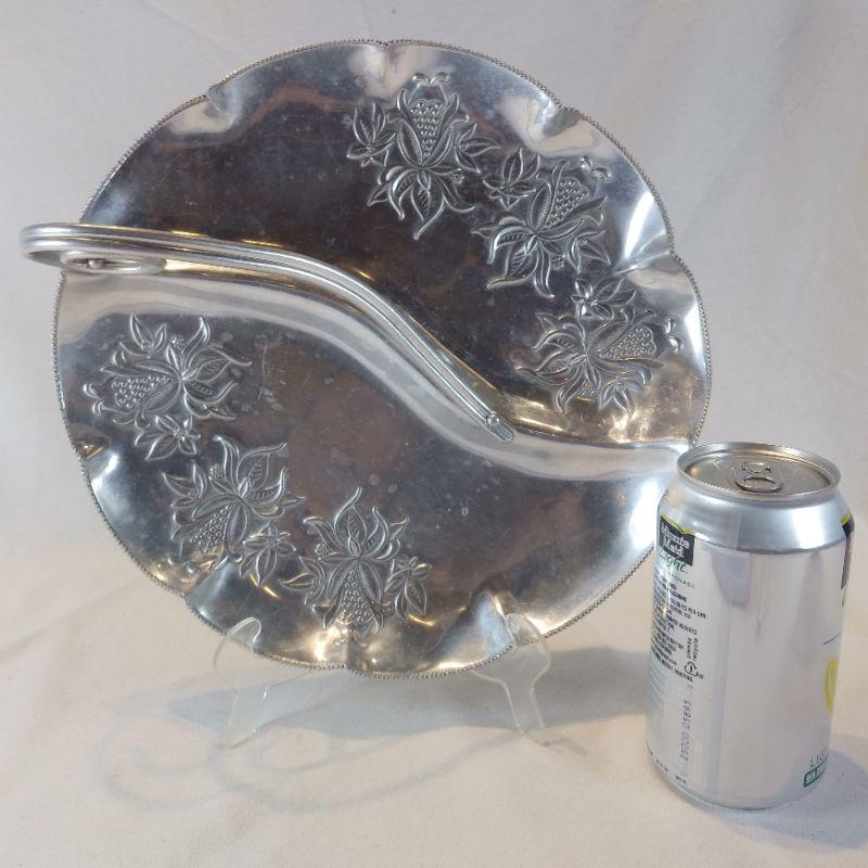 This is a very nice aluminum, stamped-design, divided tray - no maker marks. Looks like a water lily with the cool handle as a stem. It measures 10 1/2-inches in diameter X 3 1/4-inches tall with handle. Has some water marks and scratches consistent with light use and age.