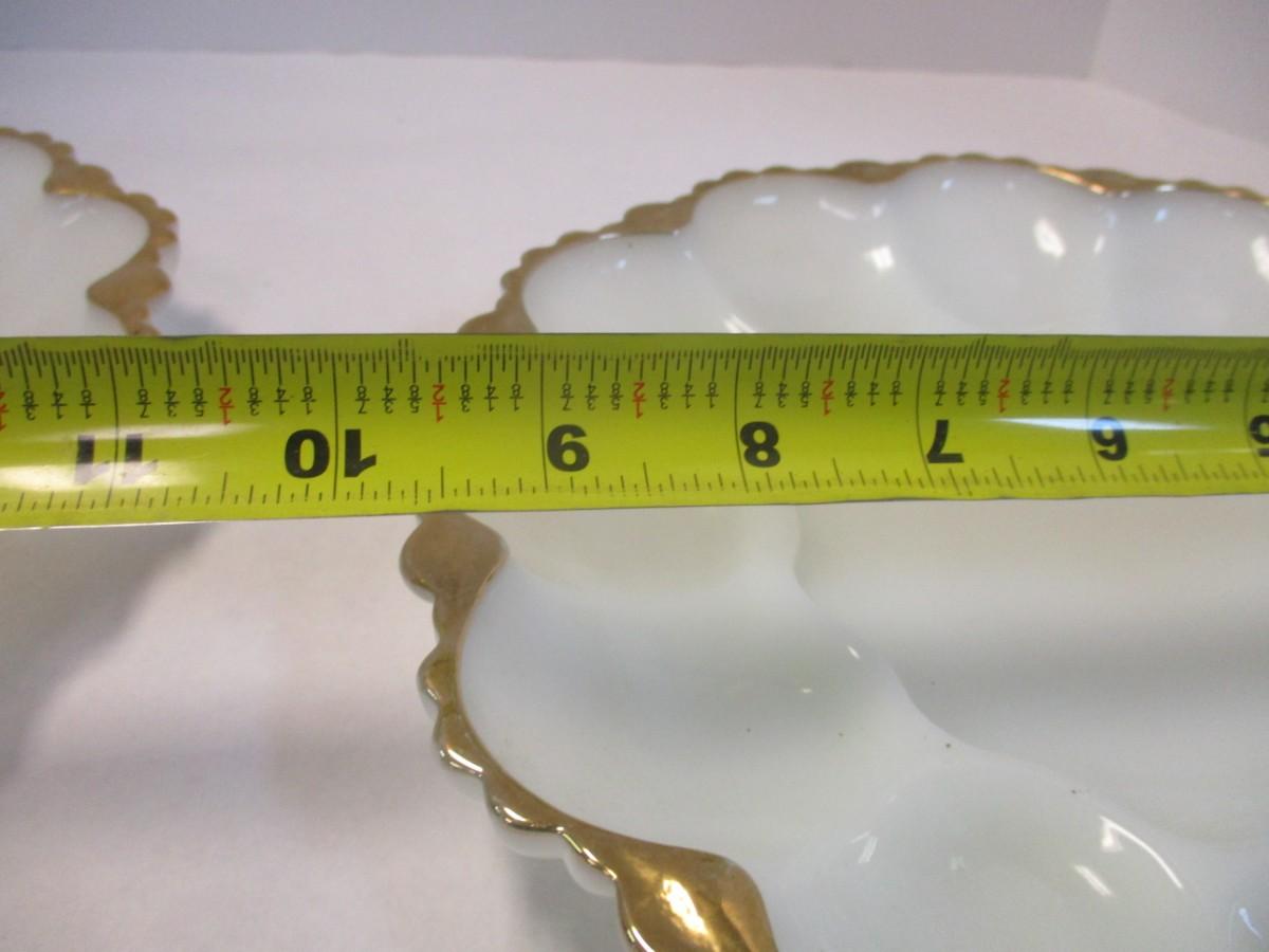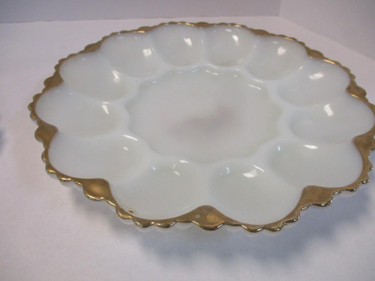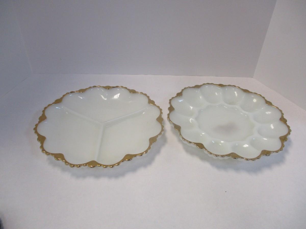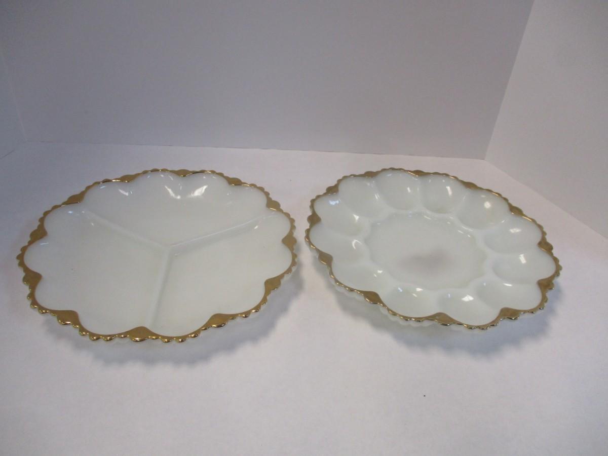 Mid Century Anchor Hocking Milk Glass Gilded Gold Edge Divided Platter & Deviled Egg Platter