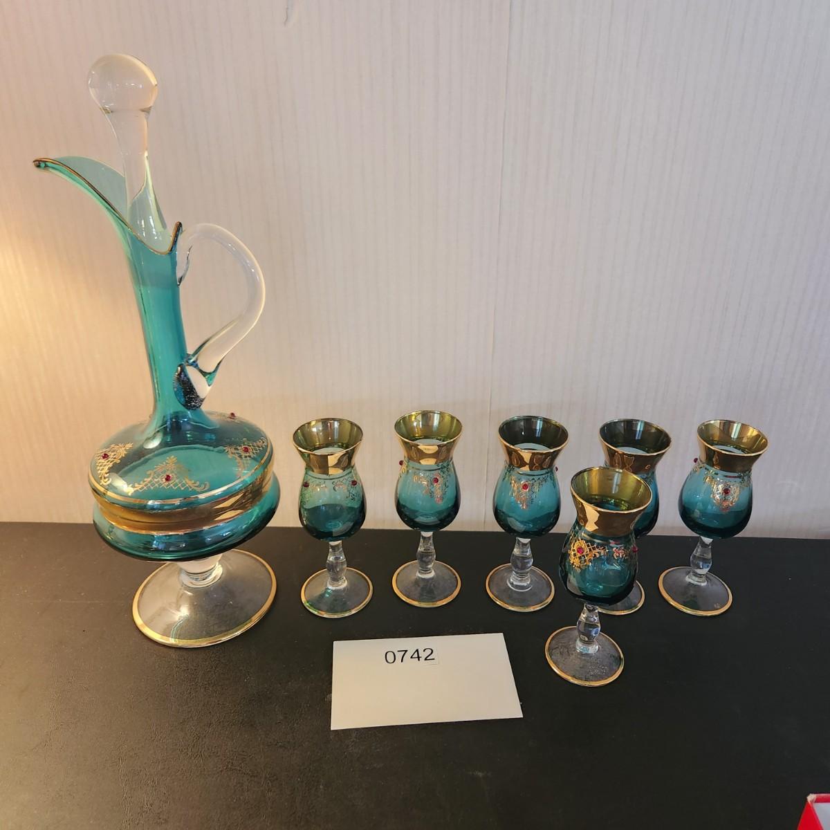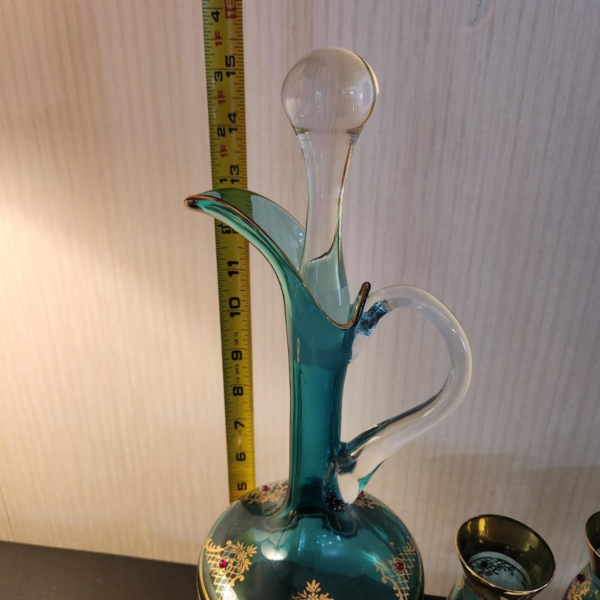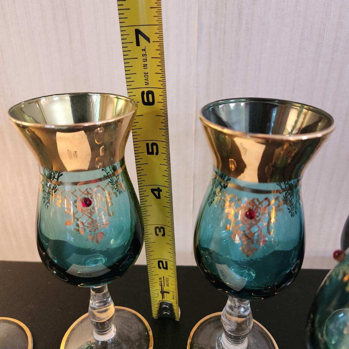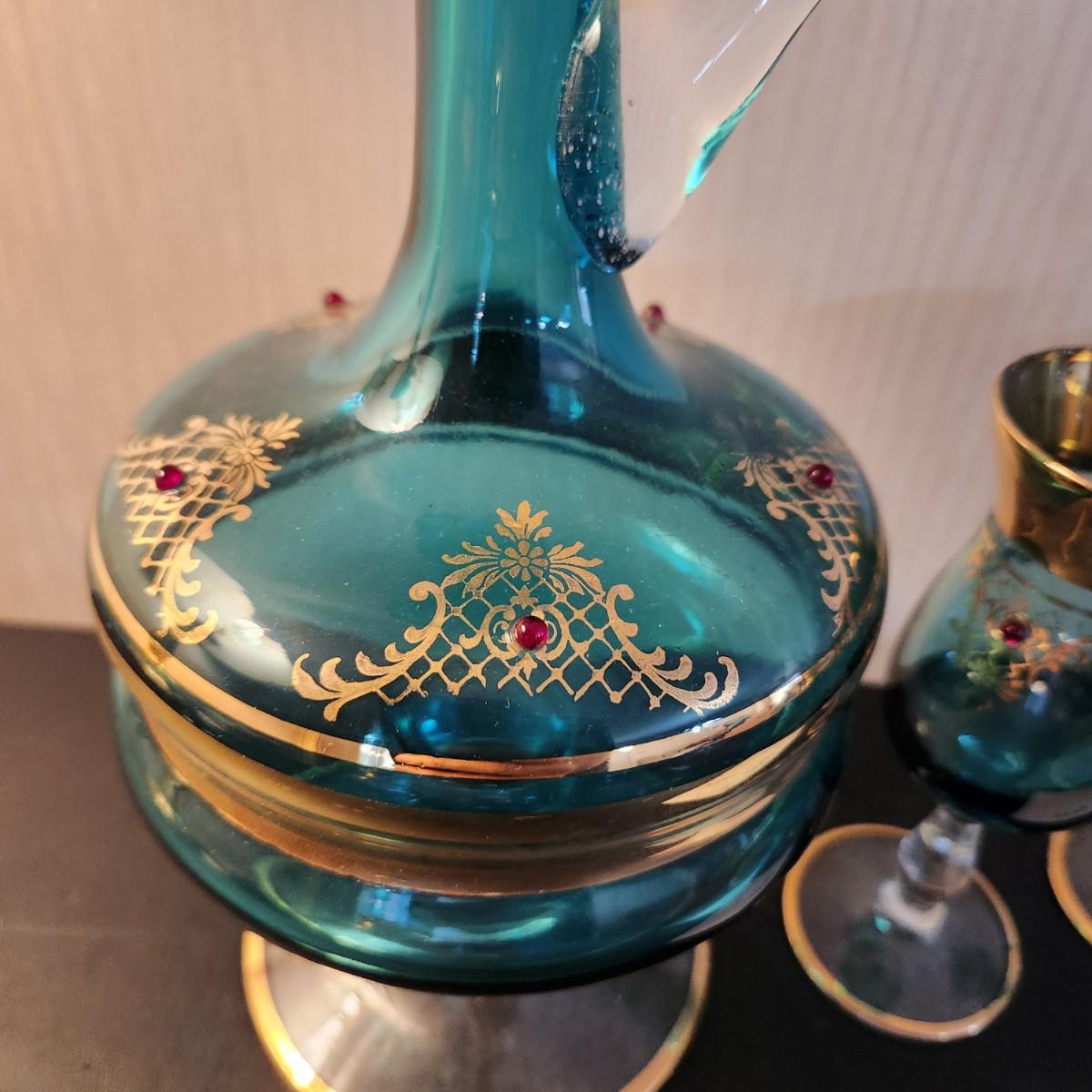 Mid Century Aqua Blue Gold Jewels Decanter w 6 Cordial Glasses