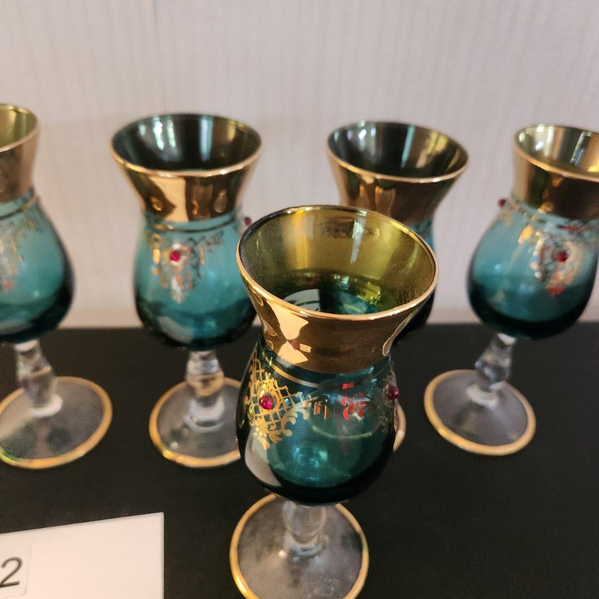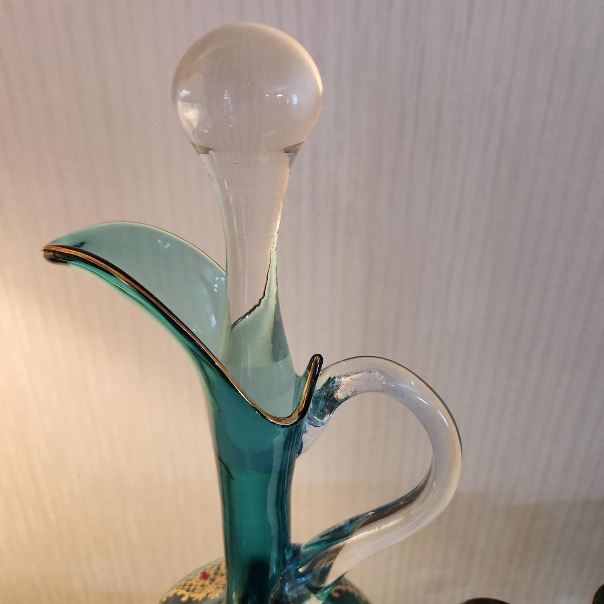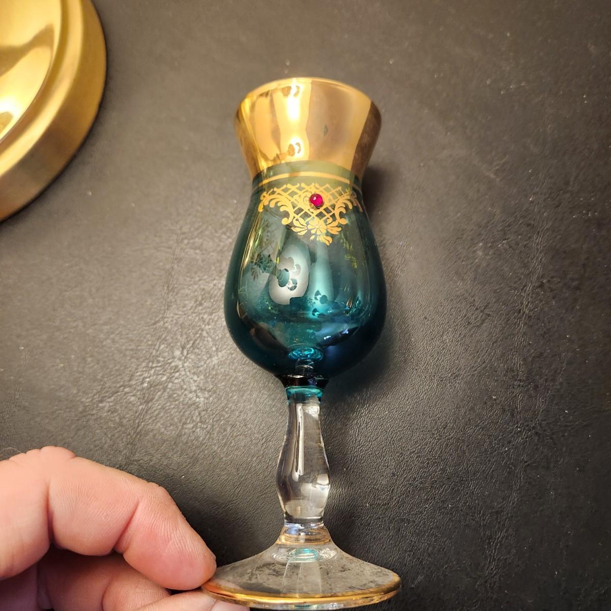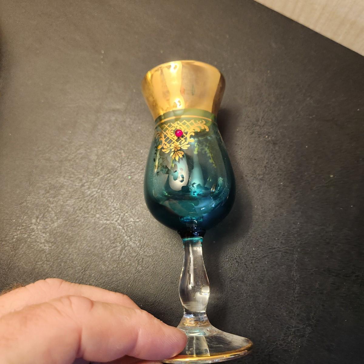 Mid Century Aqua Blue Gold Jewels Decanter w 6 Cordial Glasses