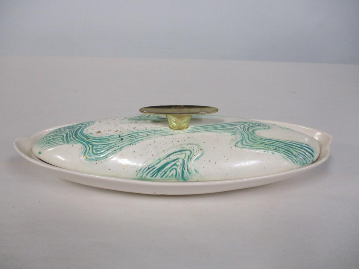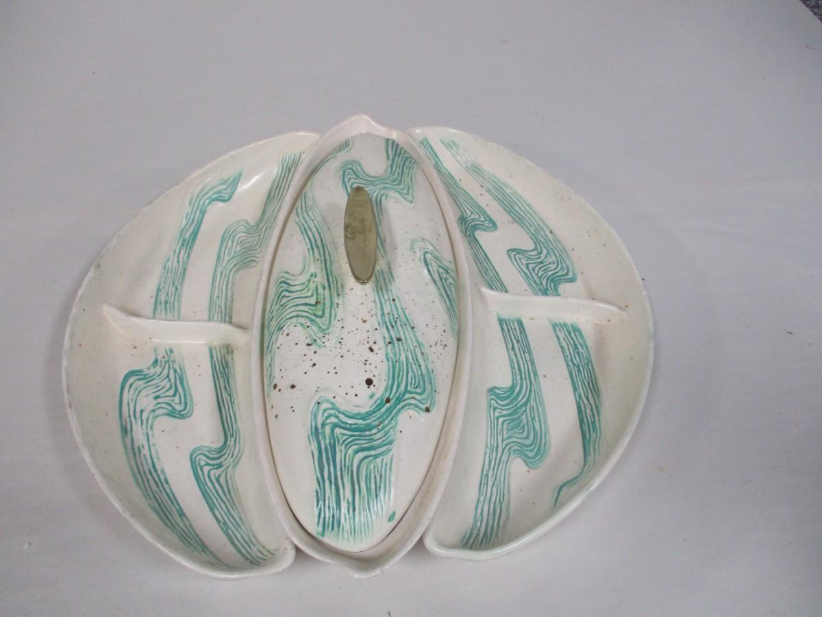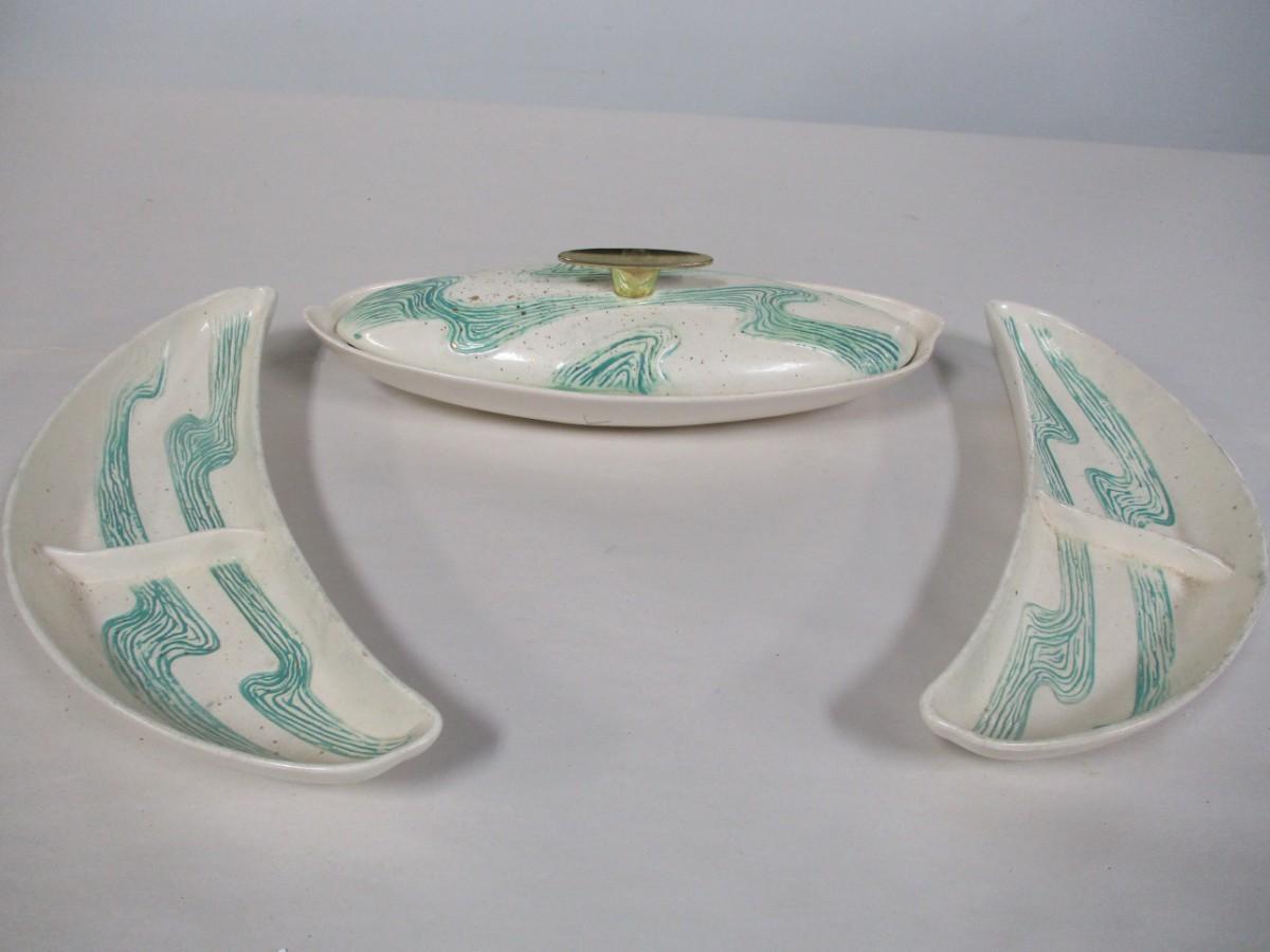 Mid Century Atomic Bell MFG. CO. No. 525 USA Turquoise Gold Glitter Serving Set