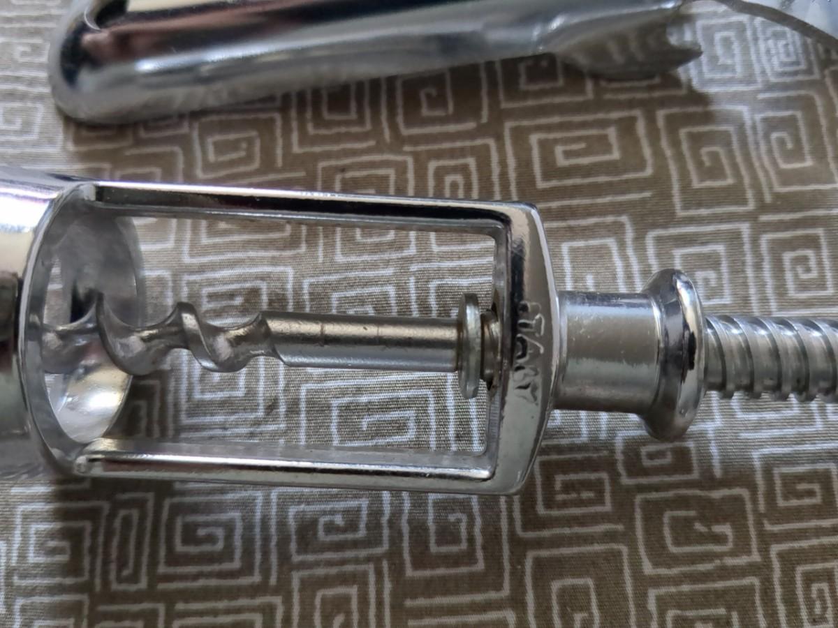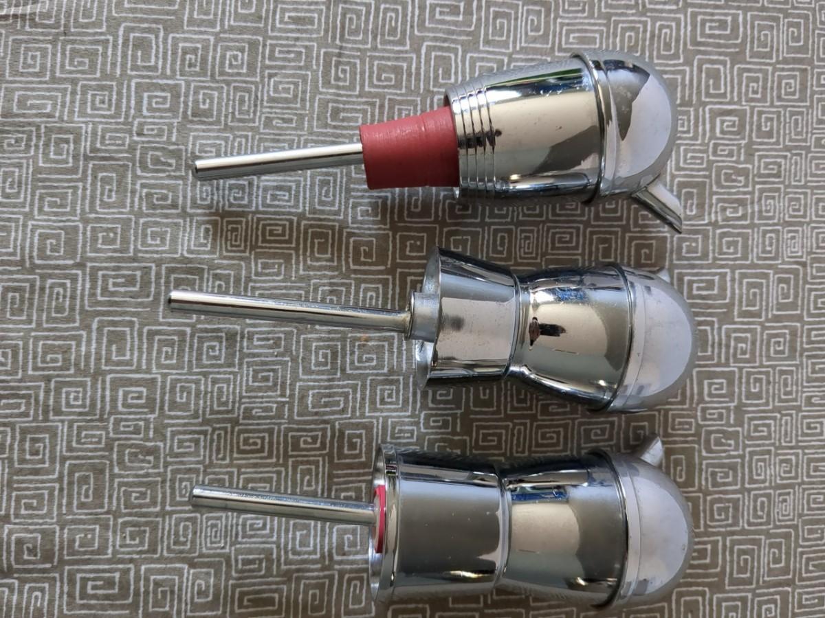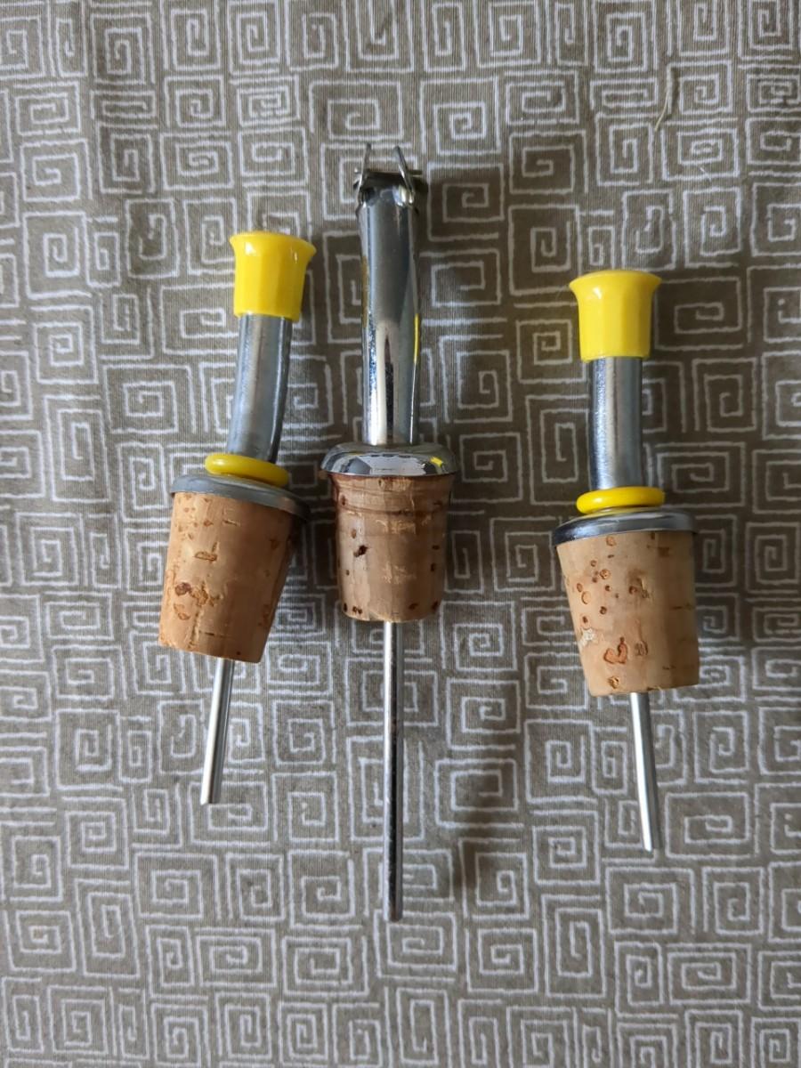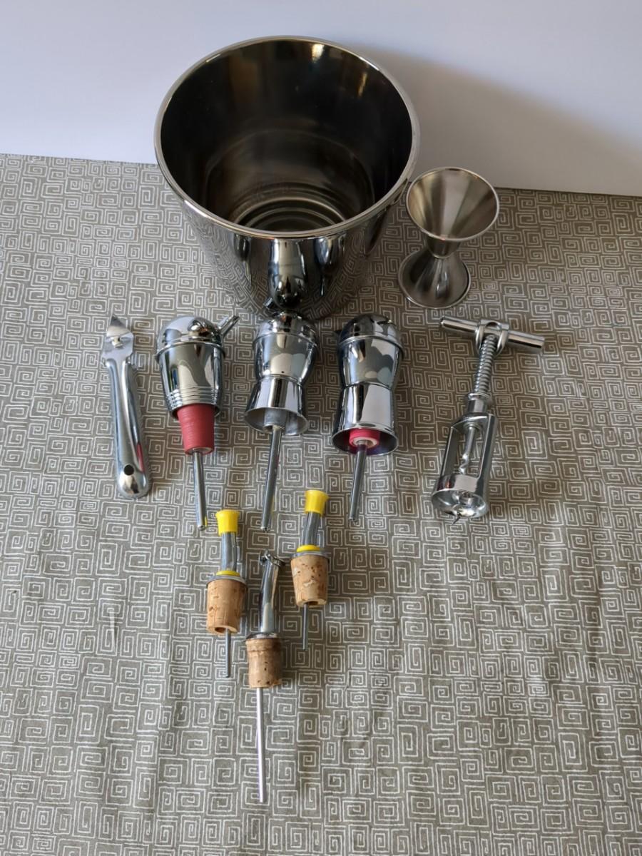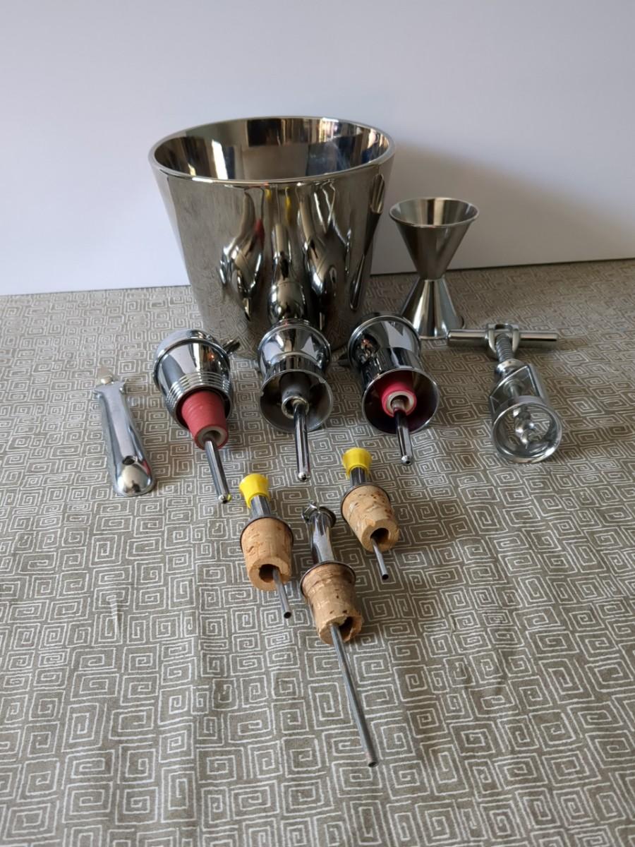 A STUNNING mid century bar set featuring a flawless 5.75" x 5" mercury glass ice bucket that is so breathtaking in person, and hefty! 3 dome shaped liquor pourers that are not matched but mated, please note one is missing rubber stopper and may not be functional, untested. 3 cork base speed pourers, one marked Spill Stop. Also includes jigger, bottle opener, and heavy duty Italian wine bottle opener.