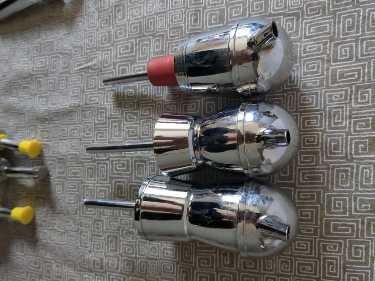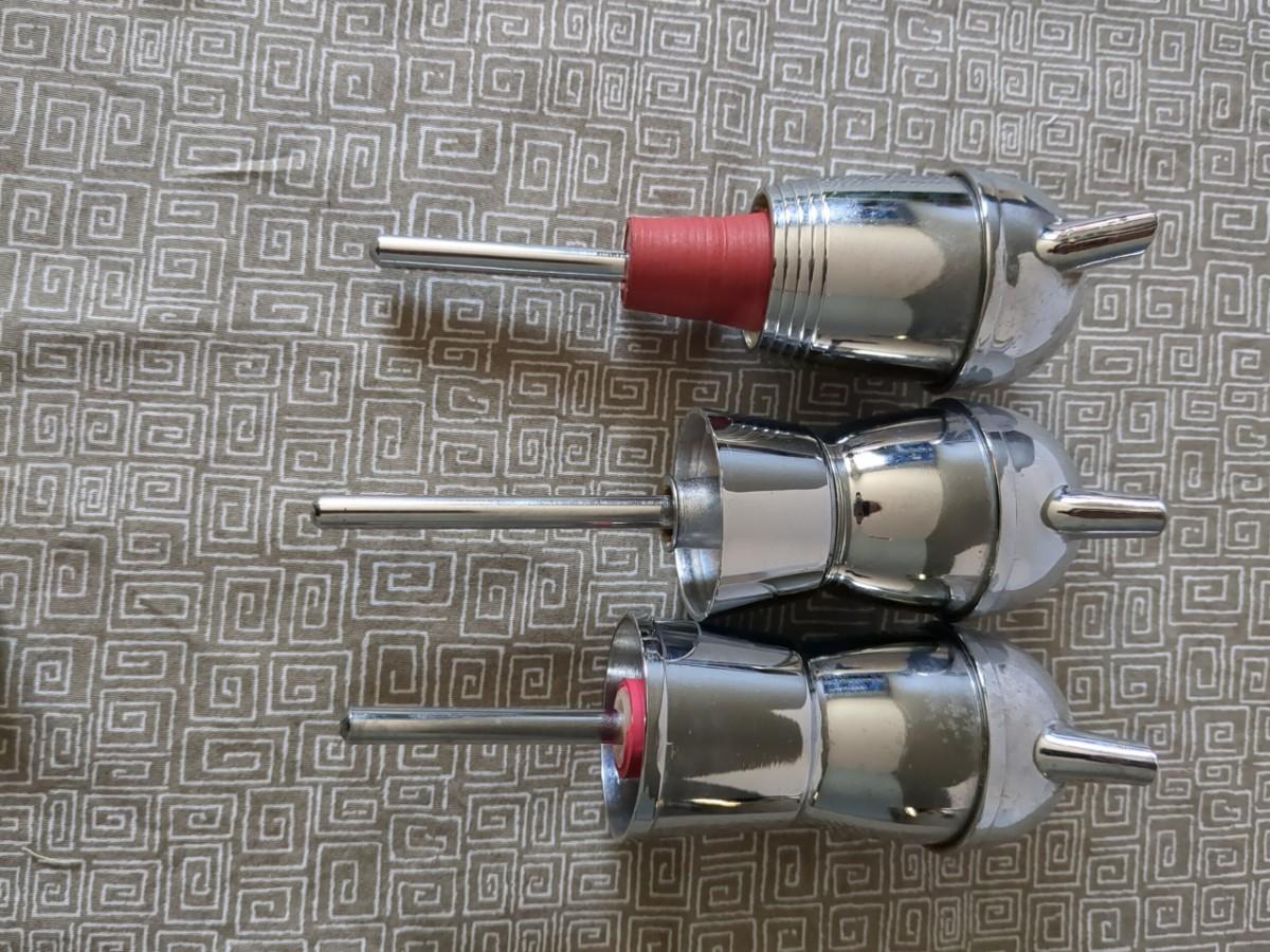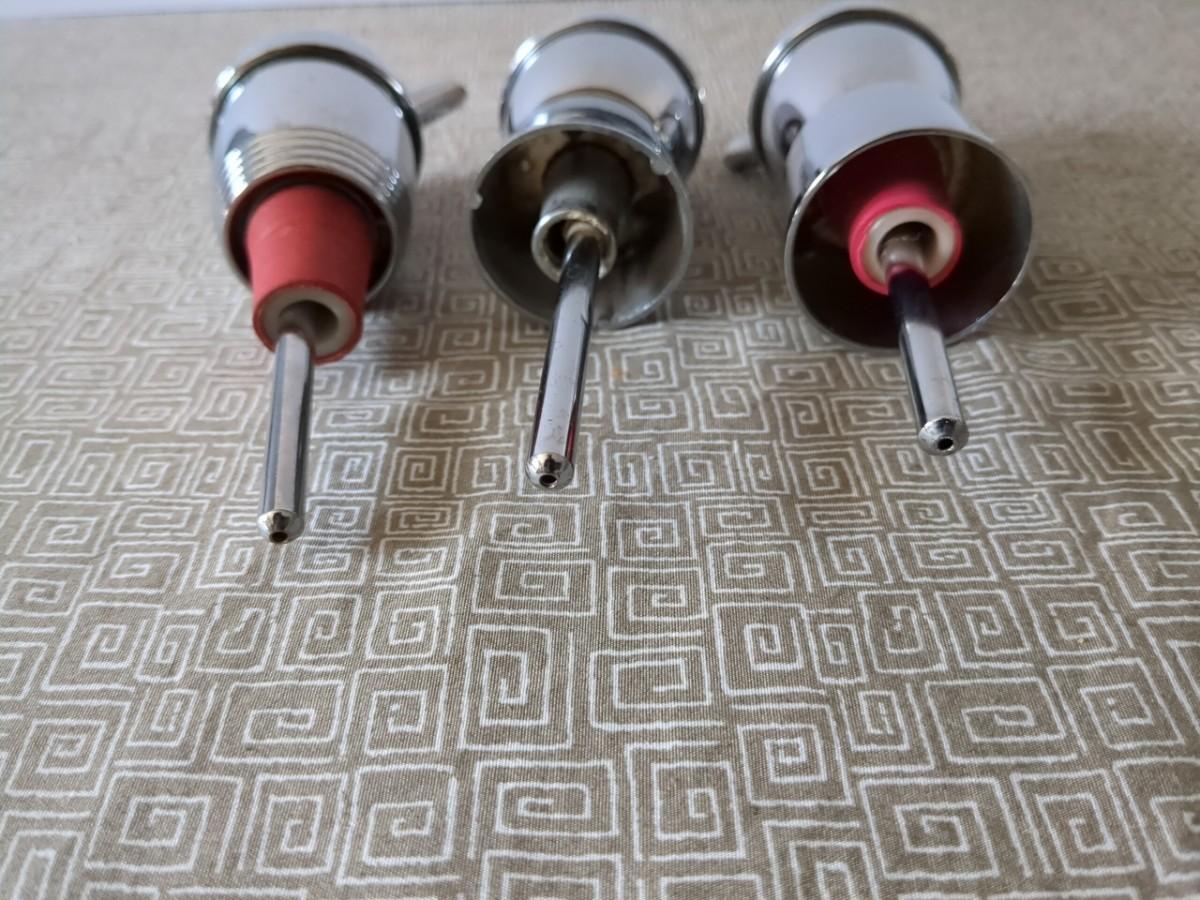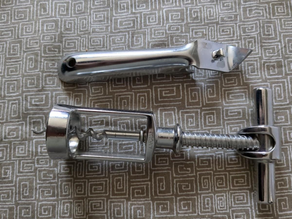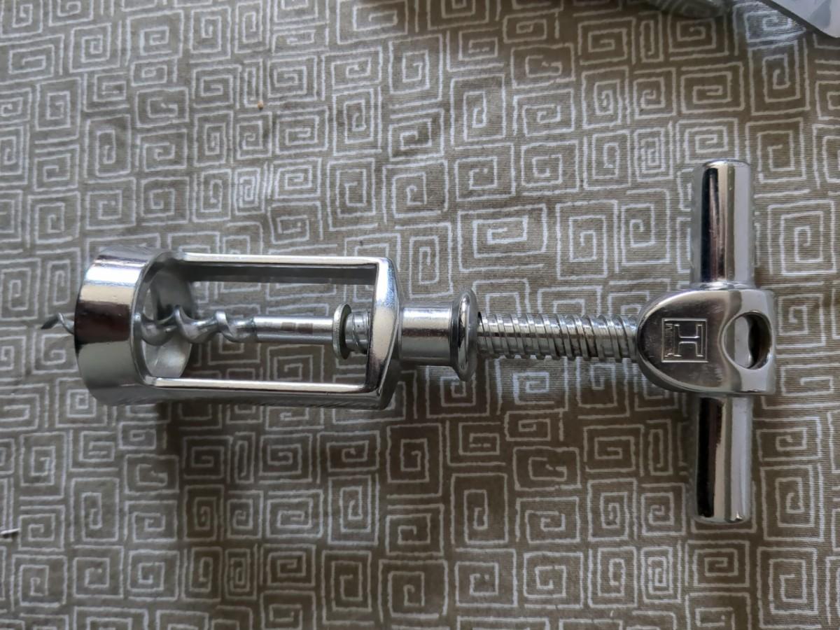 A STUNNING mid century bar set featuring a flawless 5.75" x 5" mercury glass ice bucket that is so breathtaking in person, and hefty! 3 dome shaped liquor pourers that are not matched but mated, please note one is missing rubber stopper and may not be functional, untested. 3 cork base speed pourers, one marked Spill Stop. Also includes jigger, bottle opener, and heavy duty Italian wine bottle opener.
