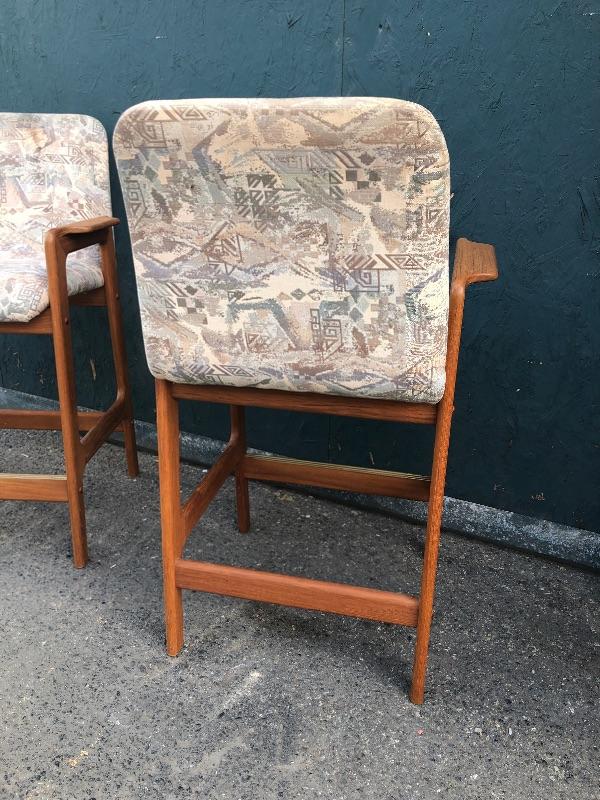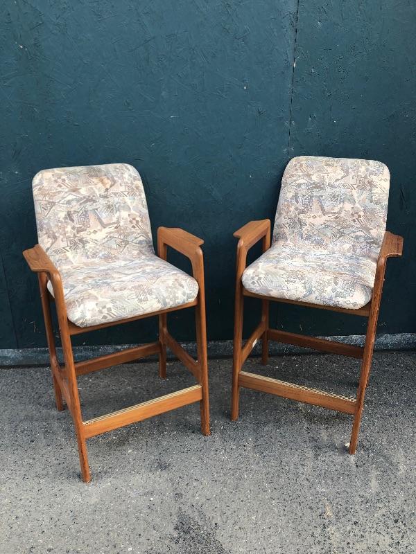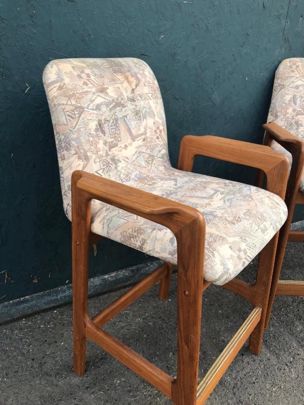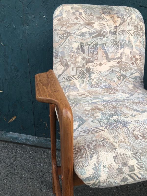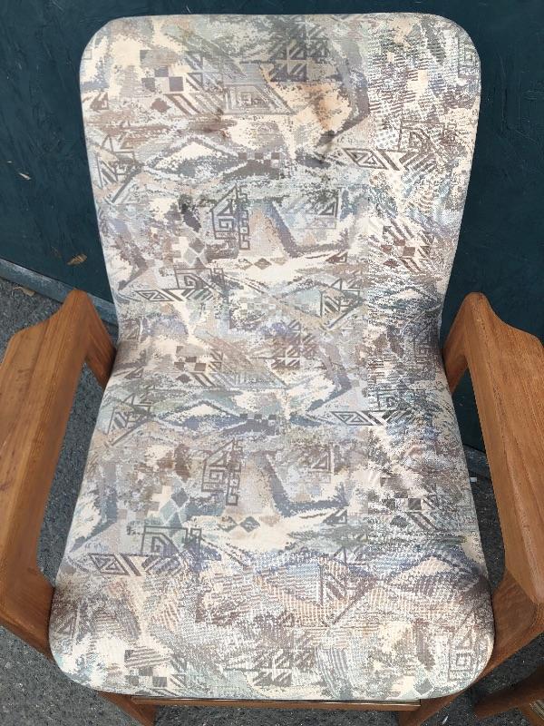 These chairs are in great condition and have a really fun and funky modern print! The wood base and arms are in excellent shape. There are some slight stains on the fabric as can be seen in the photos. Dimensions are 22.5"L x 18"W x 37''H