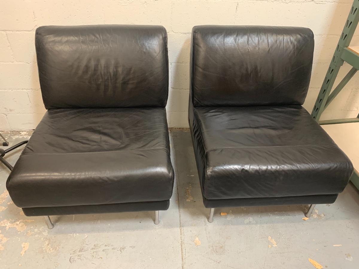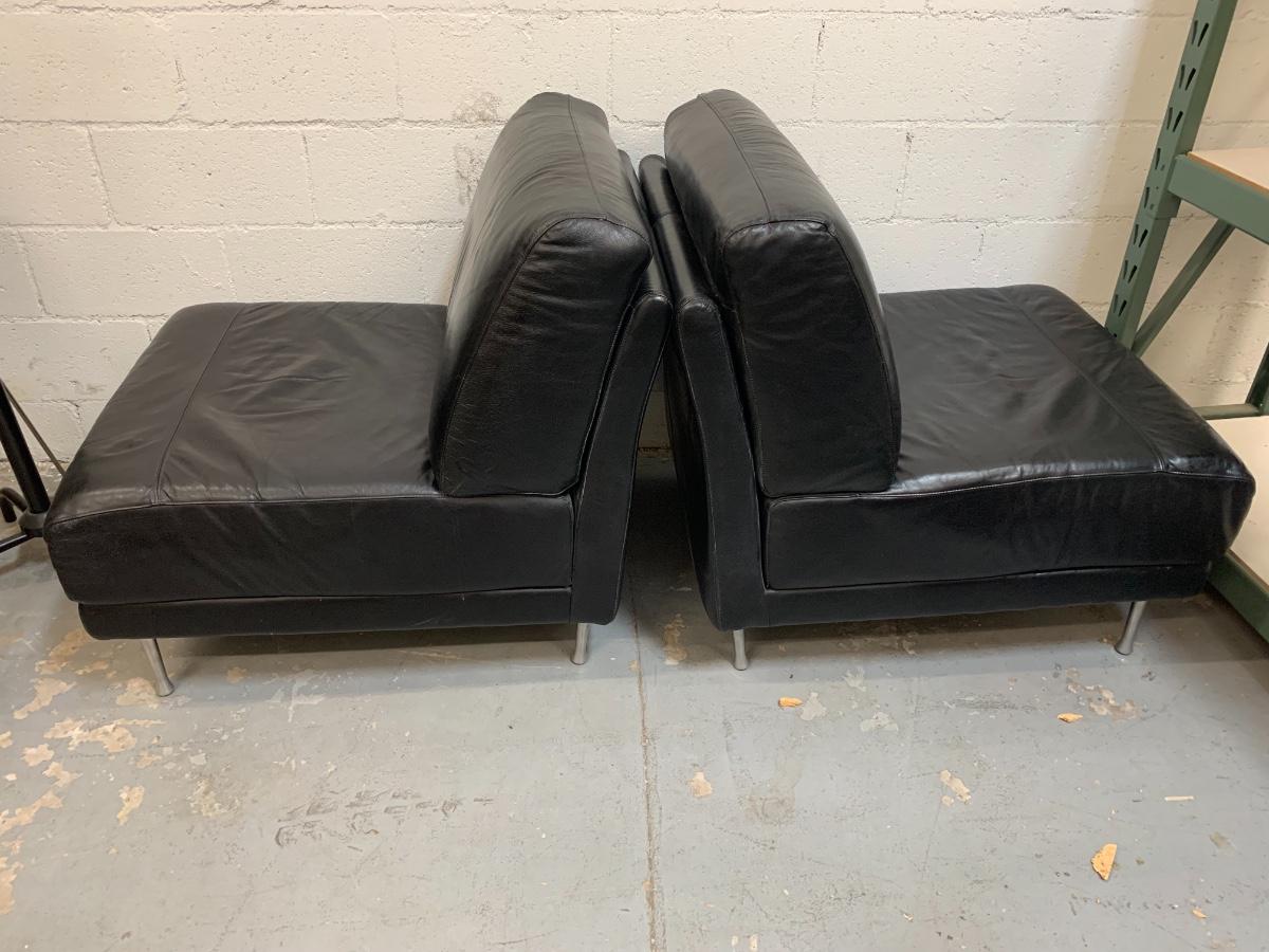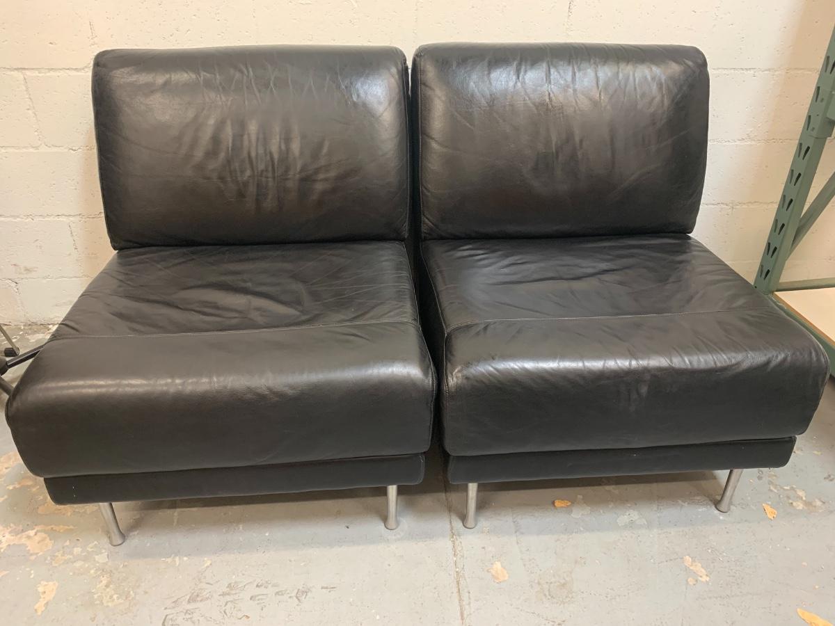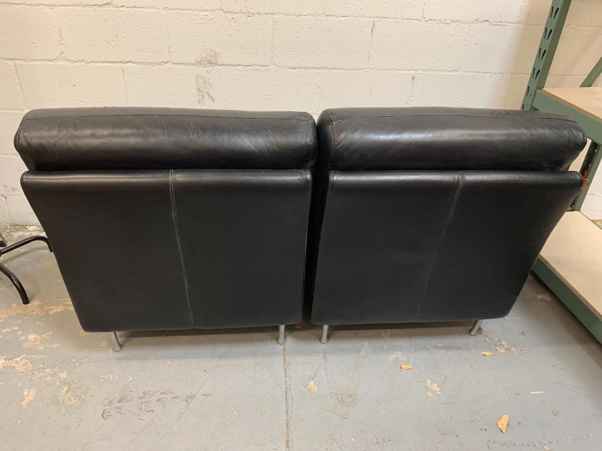 Two mid century black leather chairs. Can be sat together to make love seat. In good condition, no distress. Each seat is 28 inches in width, depth is 23 inches, back height is 34 inches.