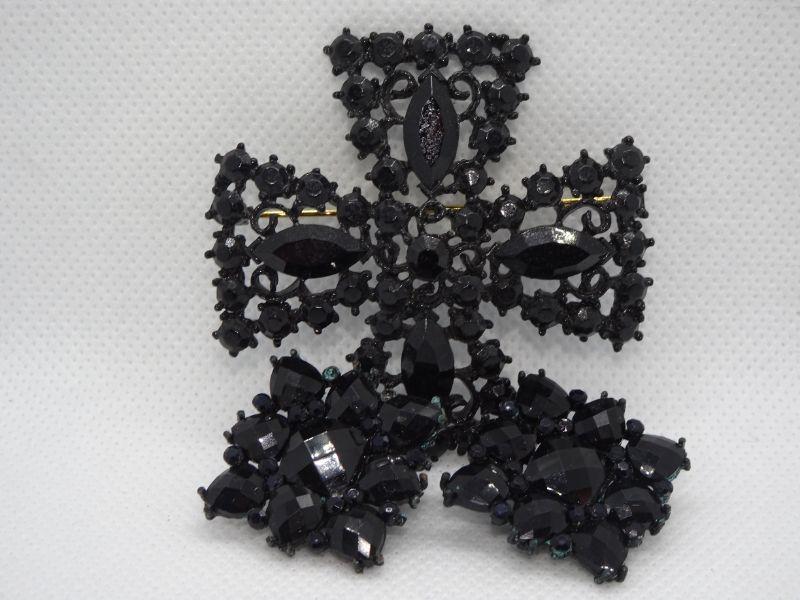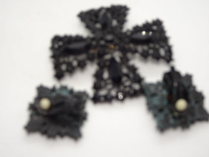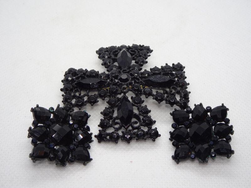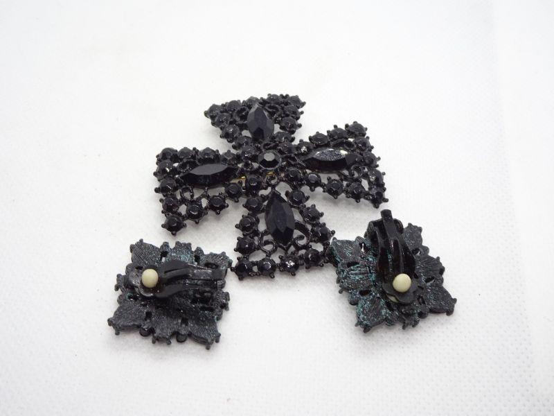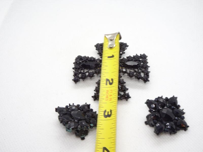 Mid Century Black Rhinestone Pendant & Clip Earrings