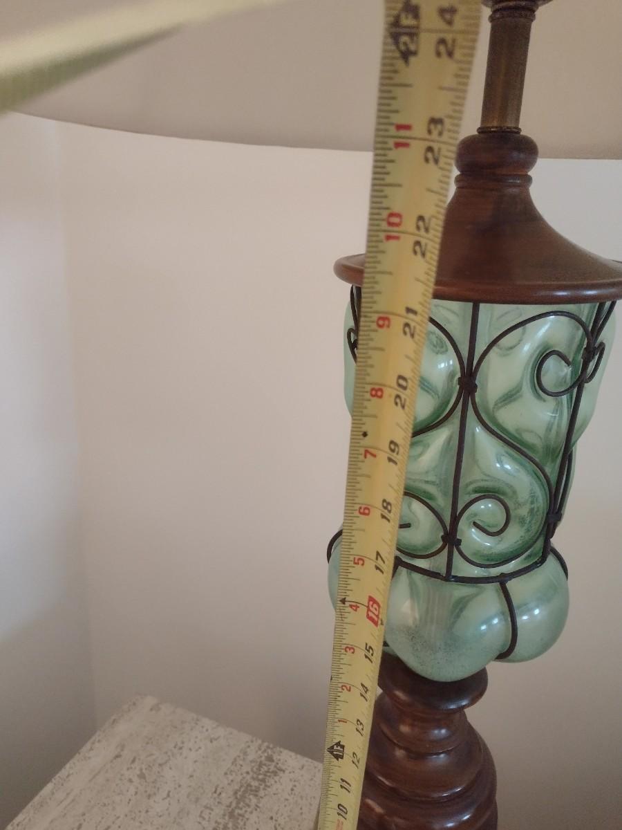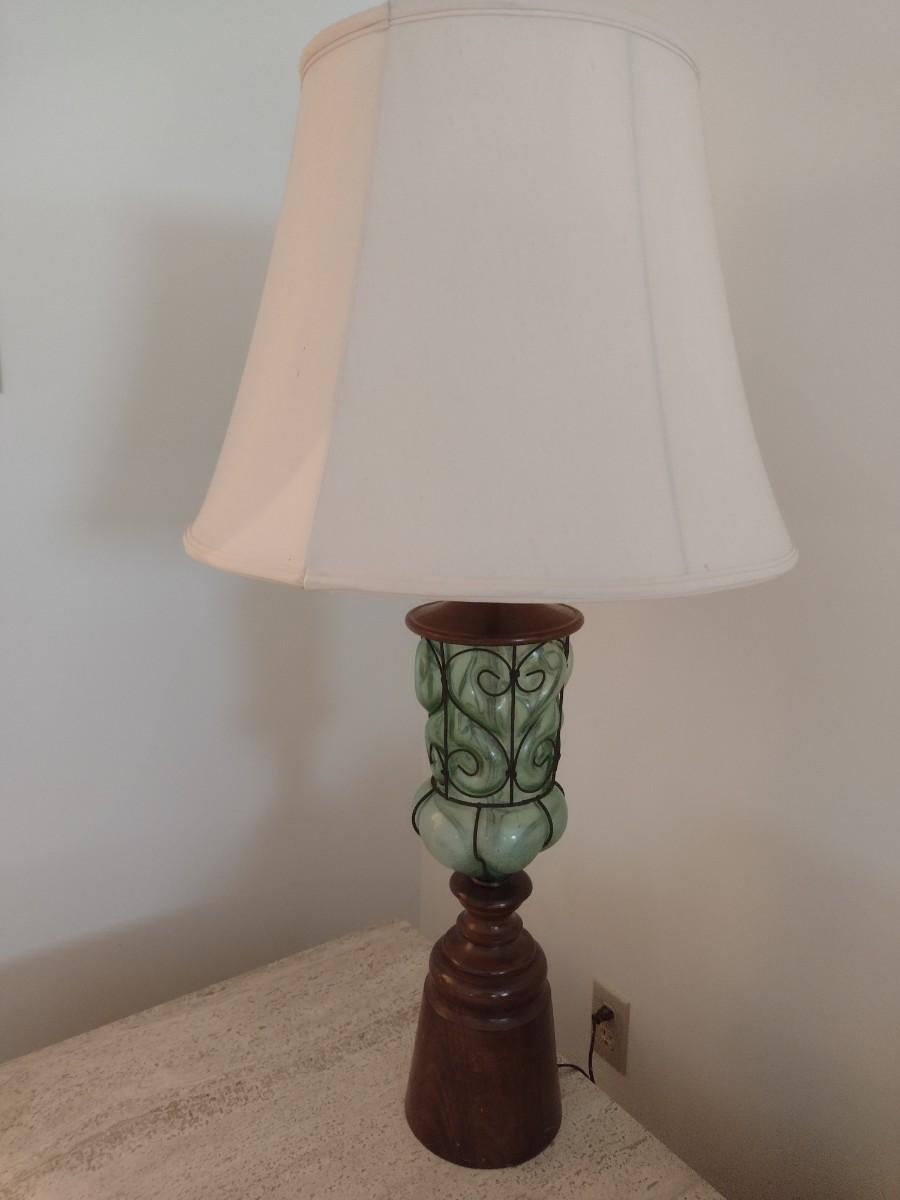 Mid Century Blown Shaped Glass Table Lamp with Wood Turned Base and Decorative Wrought Metal Accent--A