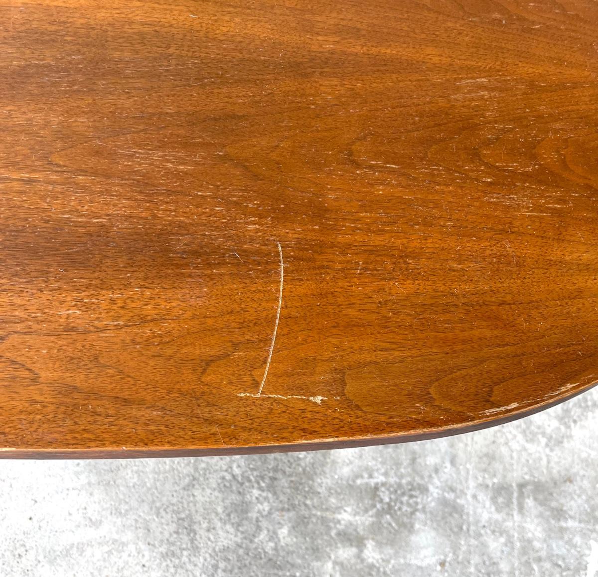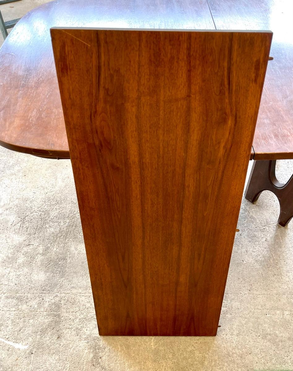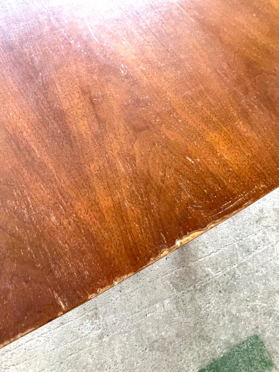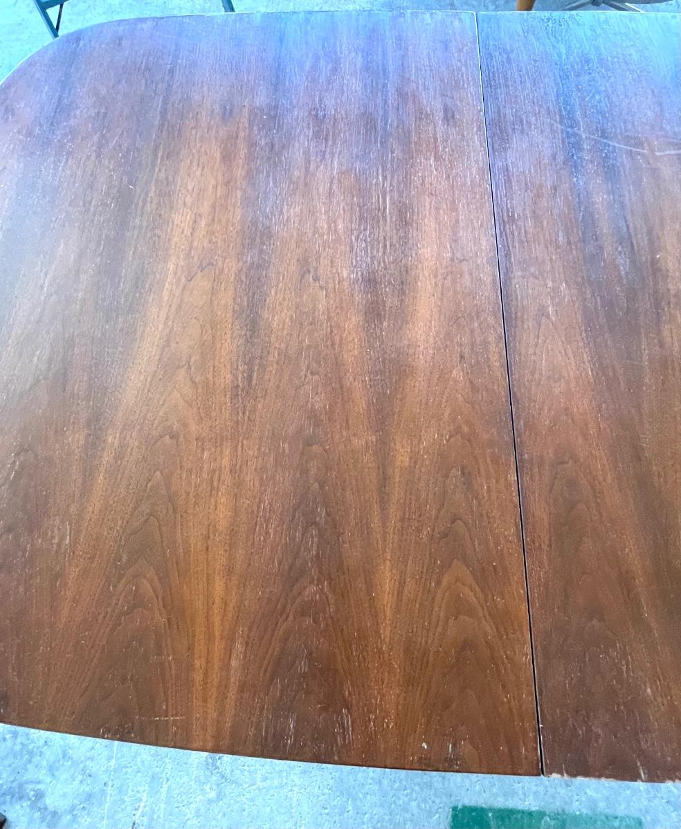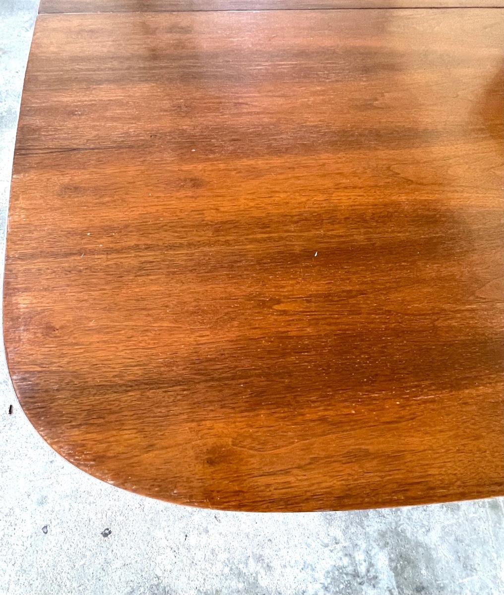 Wow, what a great MCM piece for MCM lovers! Get this for your mid century space and make a statement! This table has a few issues but could be used as is! The edge damage is not great but it’s really not terrible! There is also a scratch pictured. This table has been in storage for a very long time and I did nothing to it before taking pics. It’s possible that some oil could improve the appearance greatly and remedy the scratch a bit. Last 2 pics are pics of the leaf. The leaf also has a scratch. Despite the issues it’s a phenomenal piece of MCM decor. Don let this get away. You will regret it!