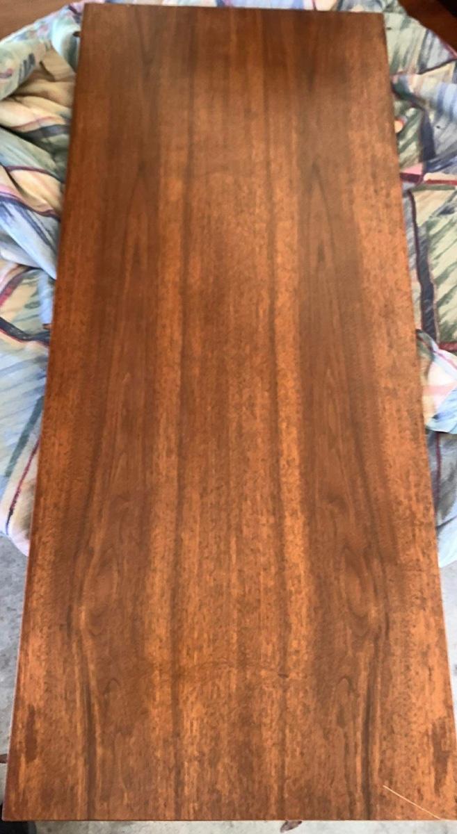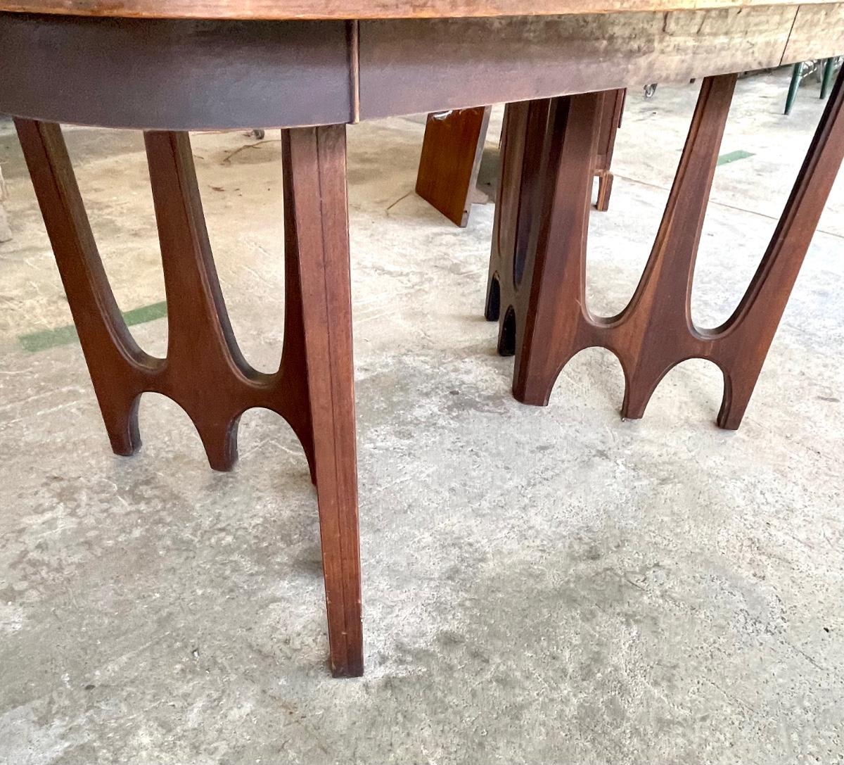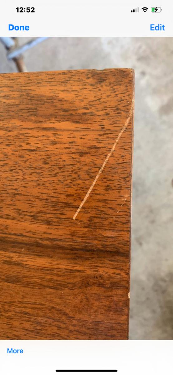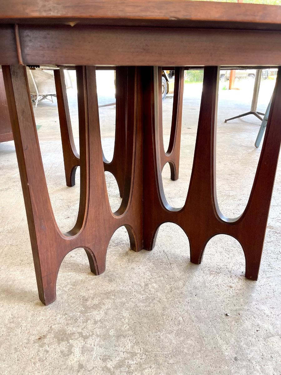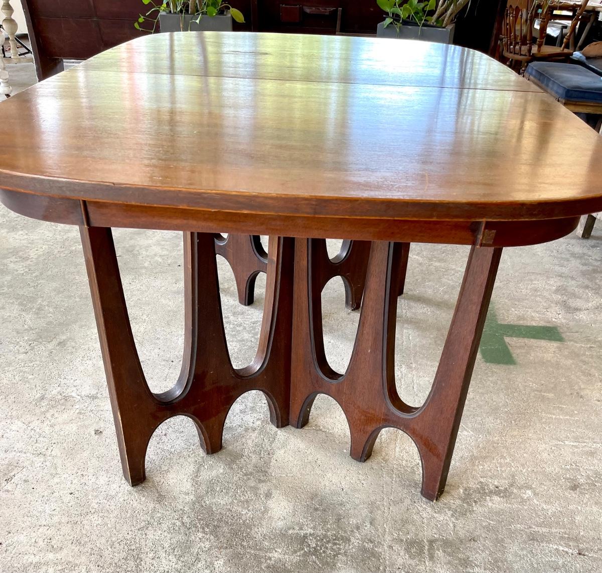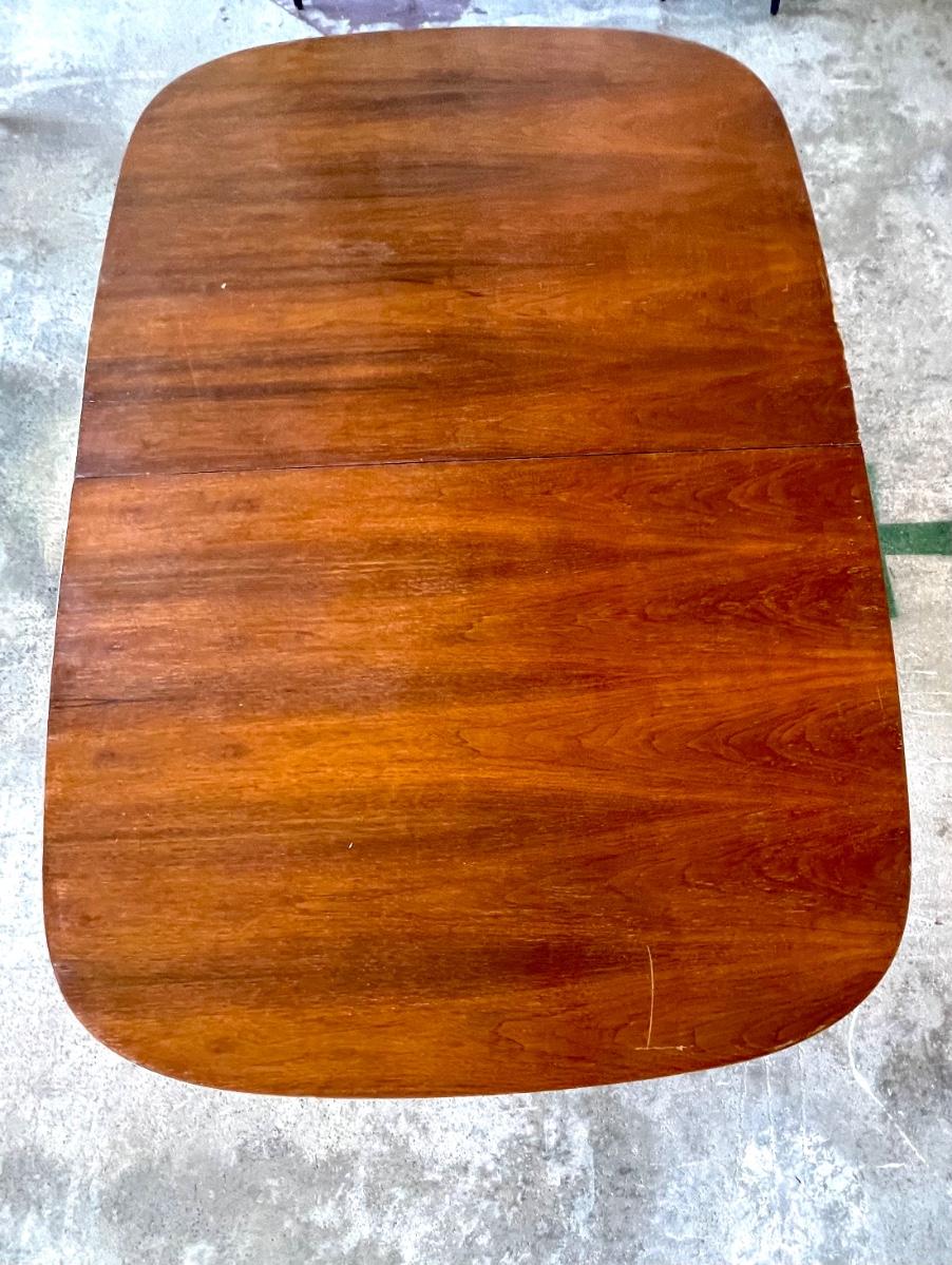 Wow, what a great MCM piece for MCM lovers! Get this for your mid century space and make a statement! This table has a few issues but could be used as is! The edge damage is not great but it’s really not terrible! There is also a scratch pictured. This table has been in storage for a very long time and I did nothing to it before taking pics. It’s possible that some oil could improve the appearance greatly and remedy the scratch a bit. Last 2 pics are pics of the leaf. The leaf also has a scratch. Despite the issues it’s a phenomenal piece of MCM decor. Don let this get away. You will regret it!