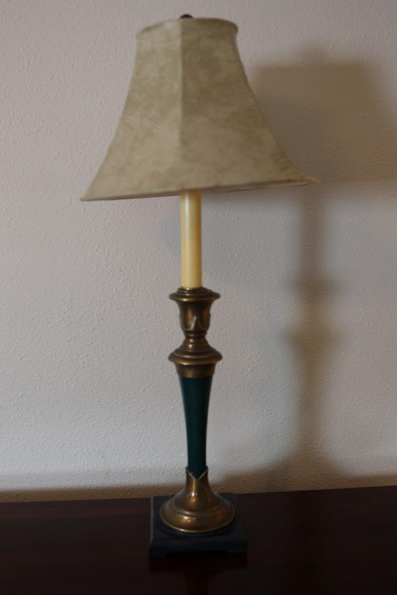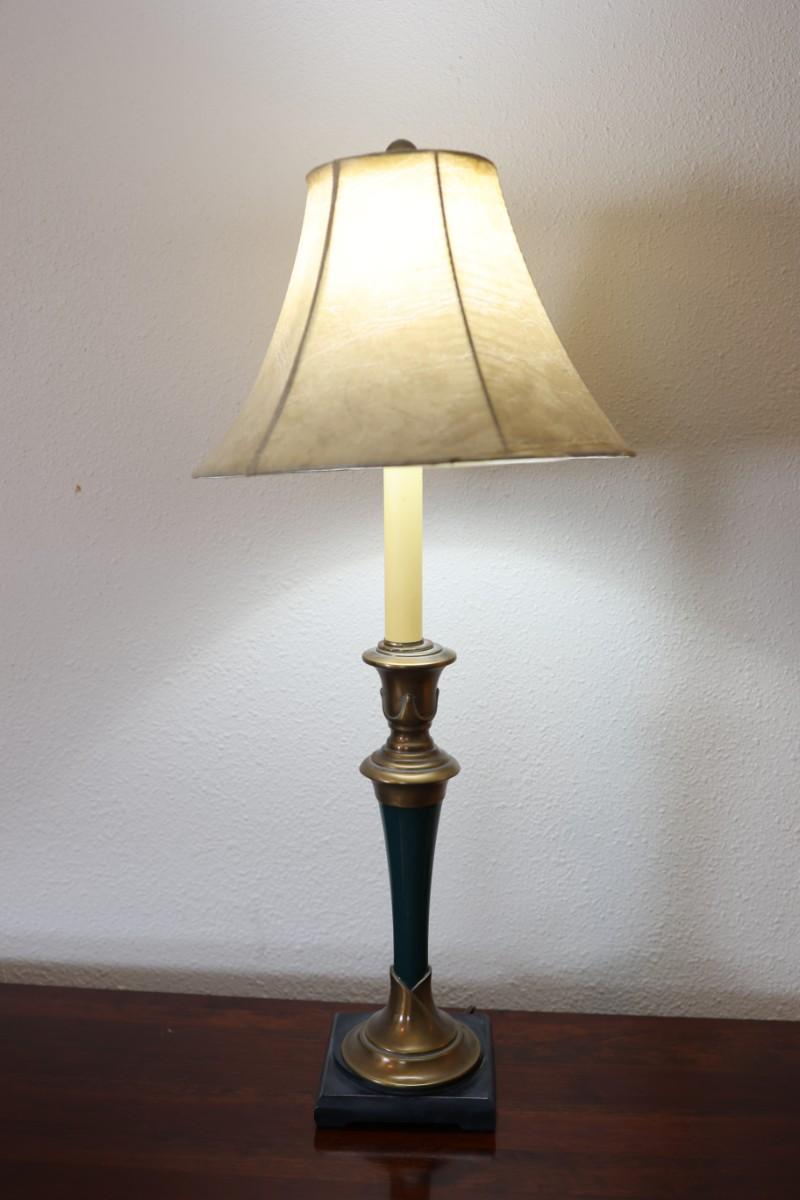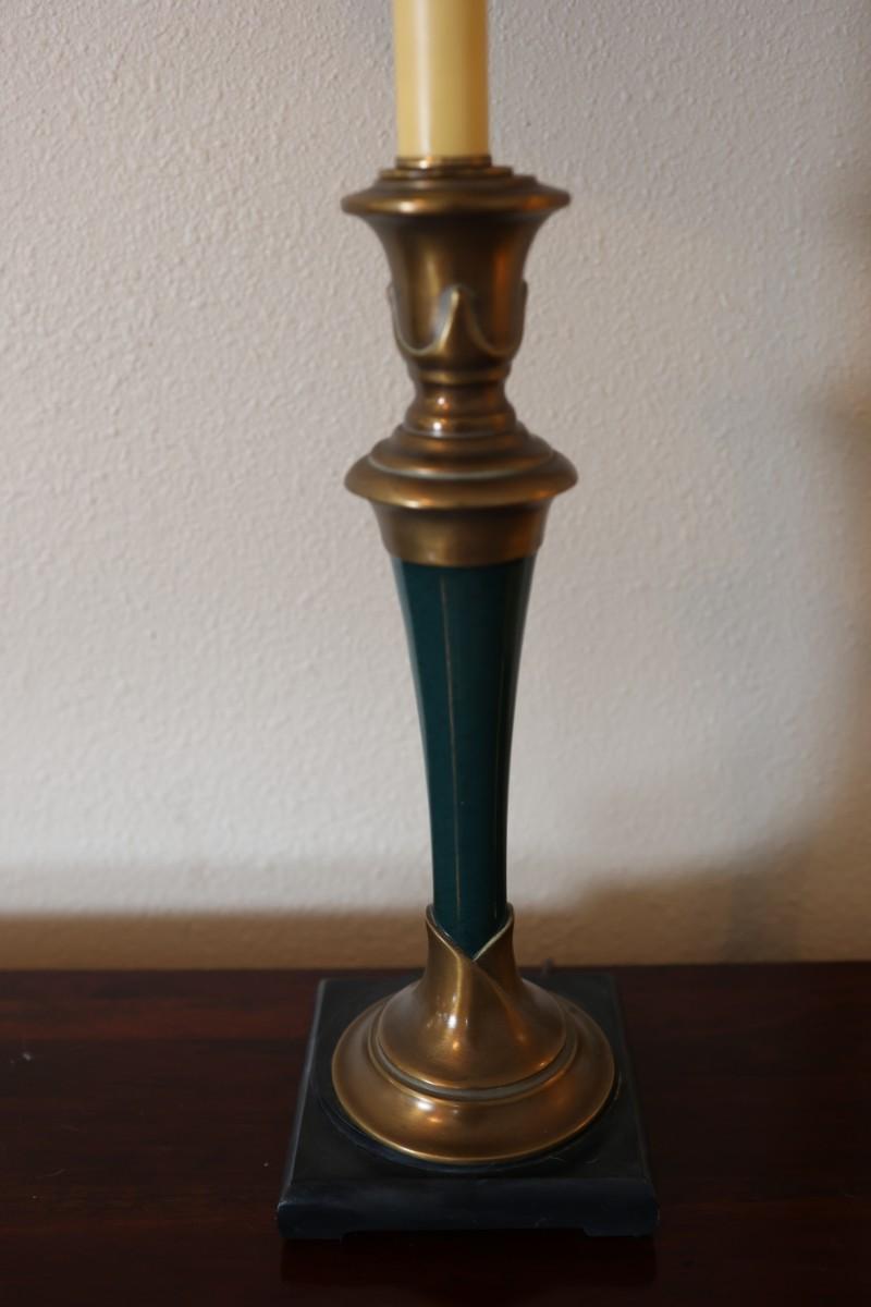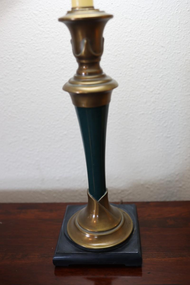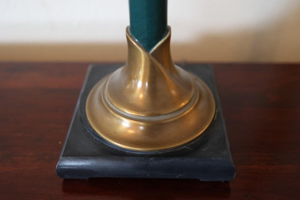 Vintage mid century brass column table lamp with blackened stem and art deco detailing. Brass column is mounted on a square wood base.