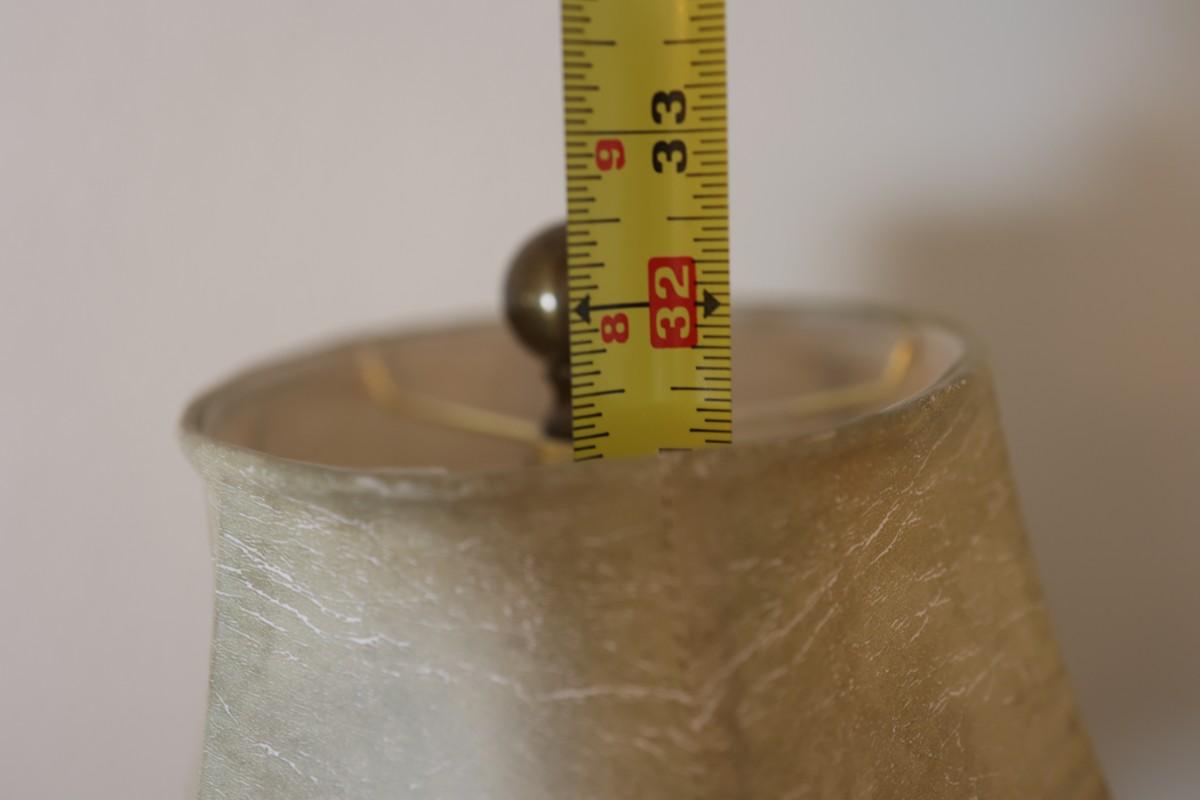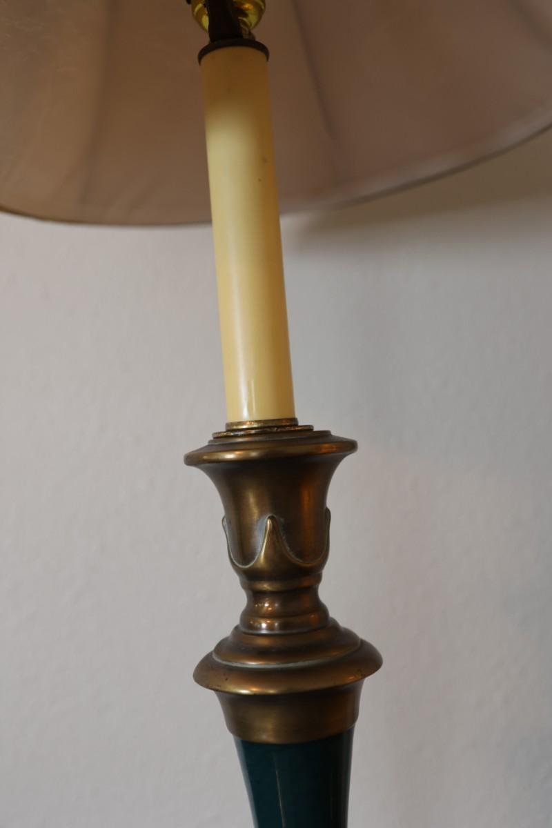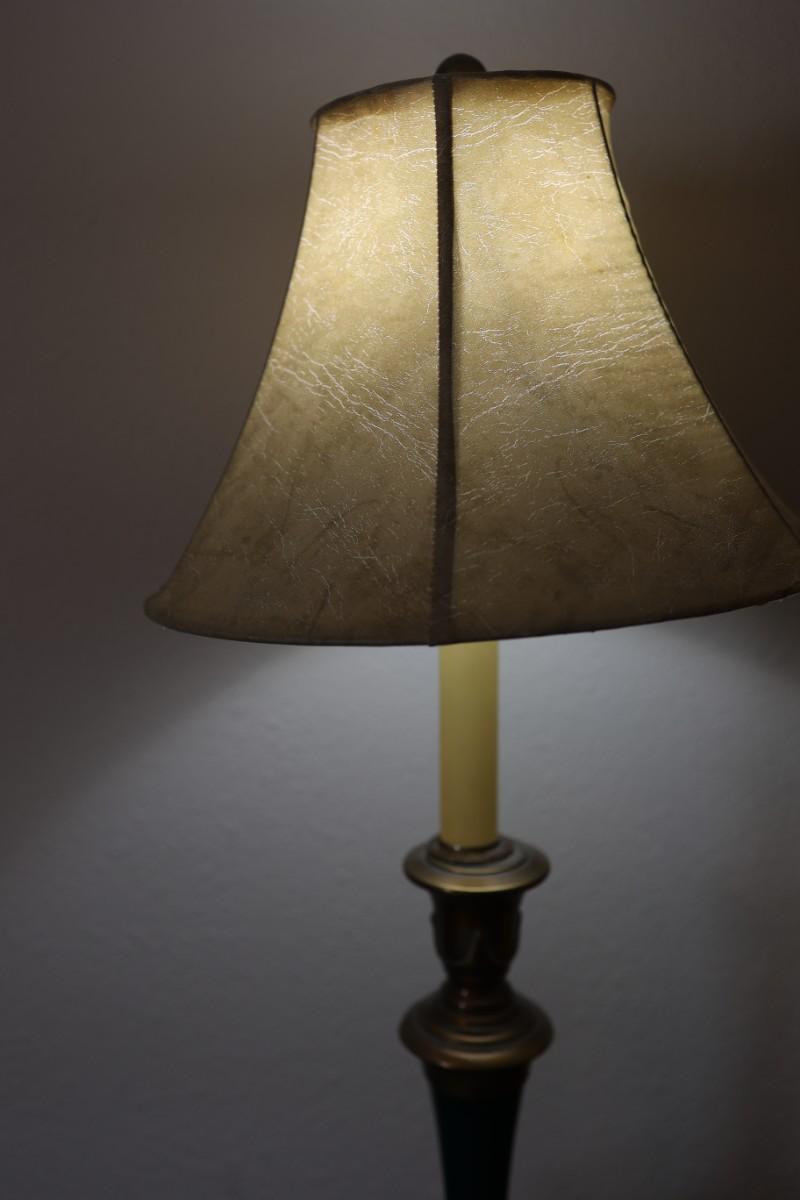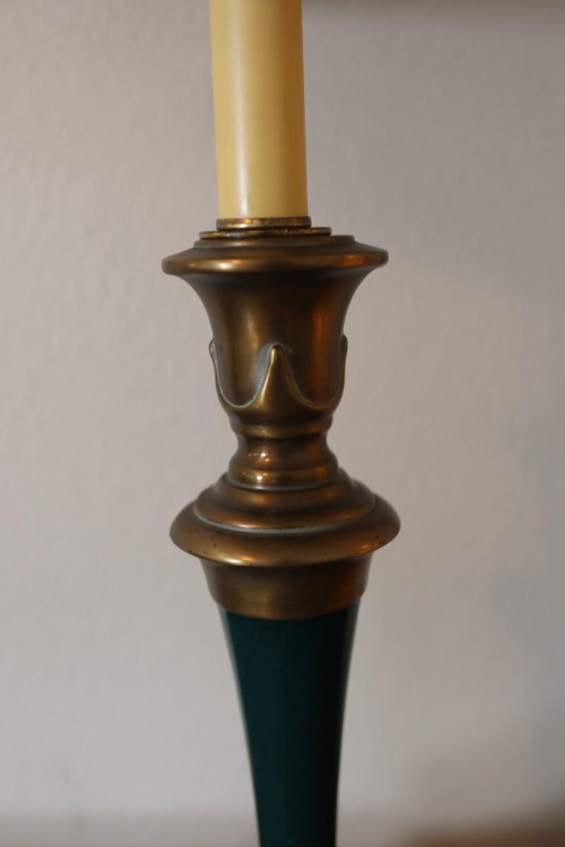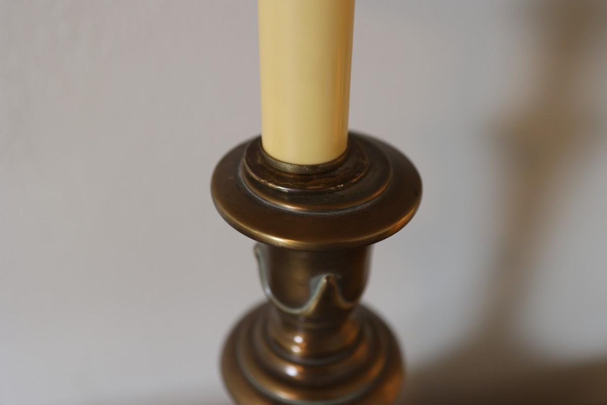 Vintage mid century brass column table lamp with blackened stem and art deco detailing. Brass column is mounted on a square wood base.