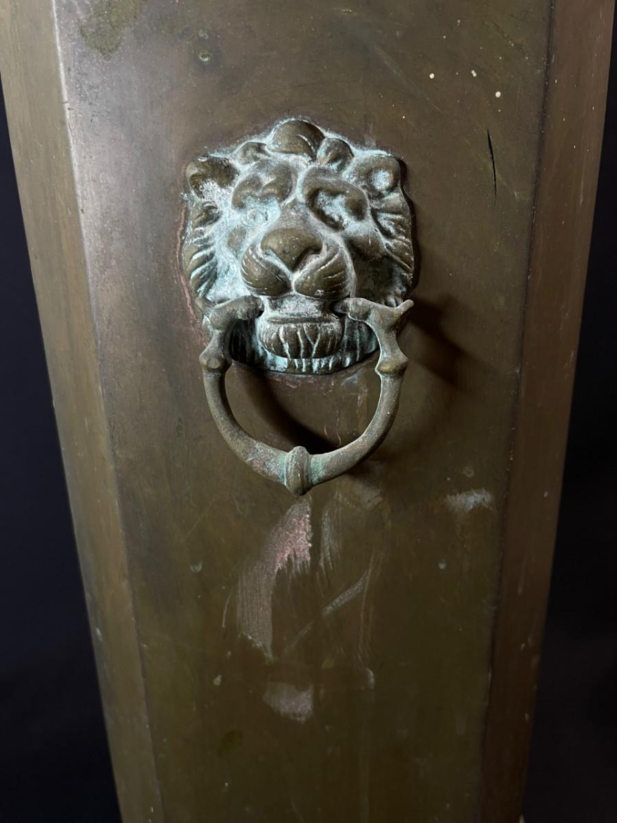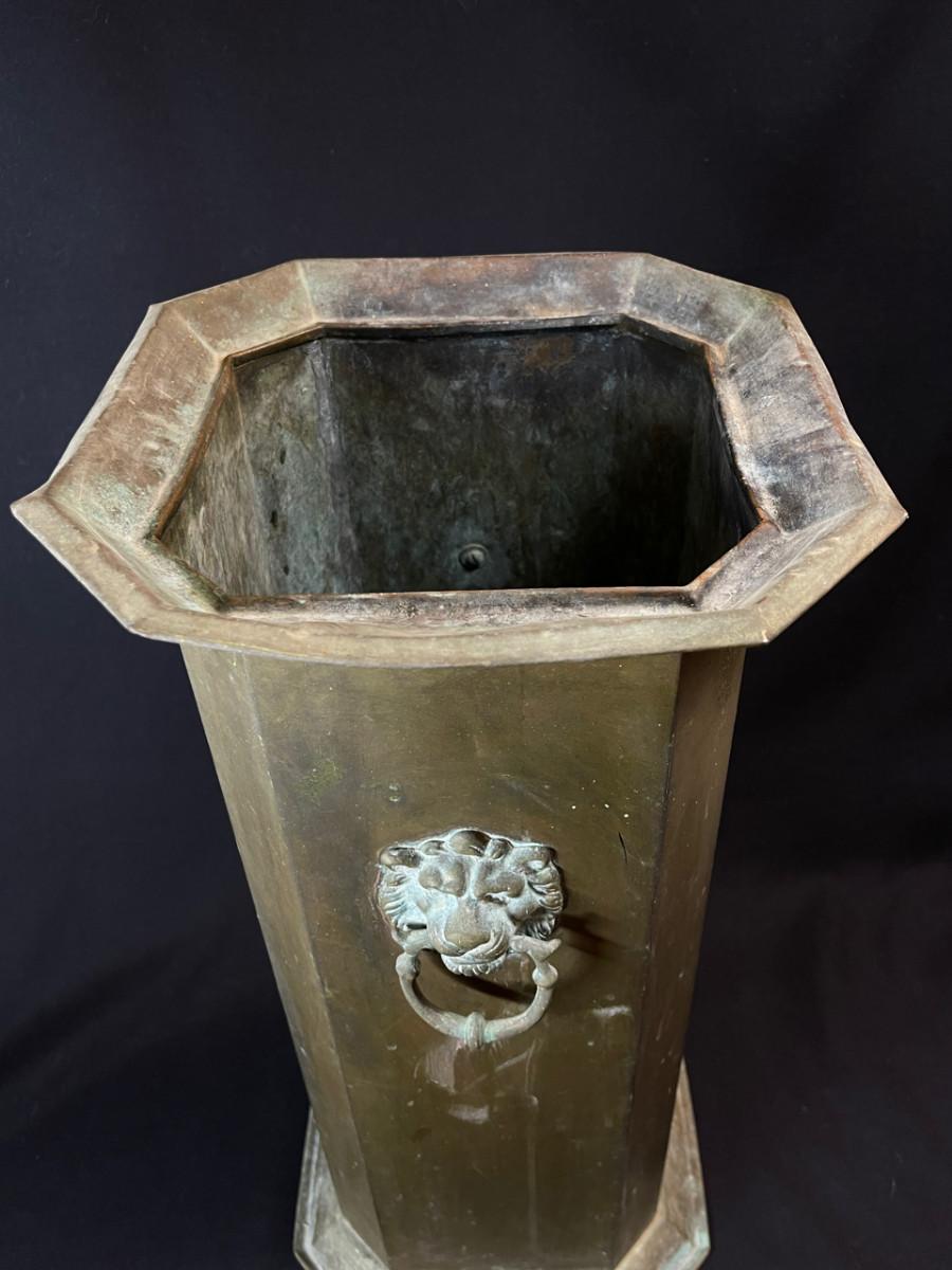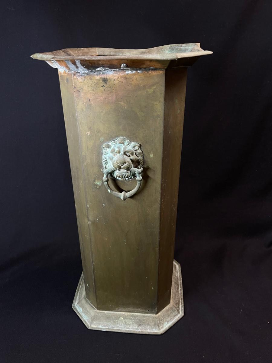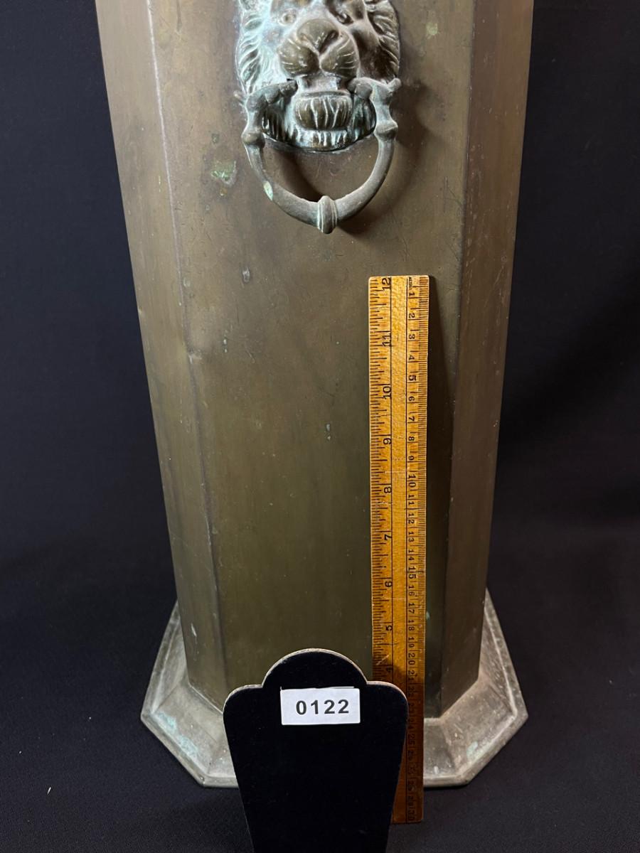The subject item is a mid-century brass umbrella/can stand mounted with lion headed ring handles on with side. The outside walls of the stand have taken on a light verdigris patina that enhances the charm of the piece. See photos for condition.