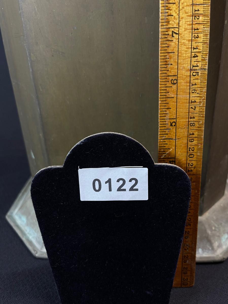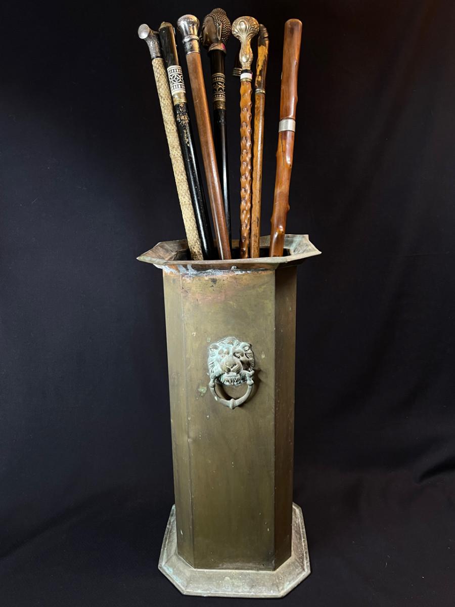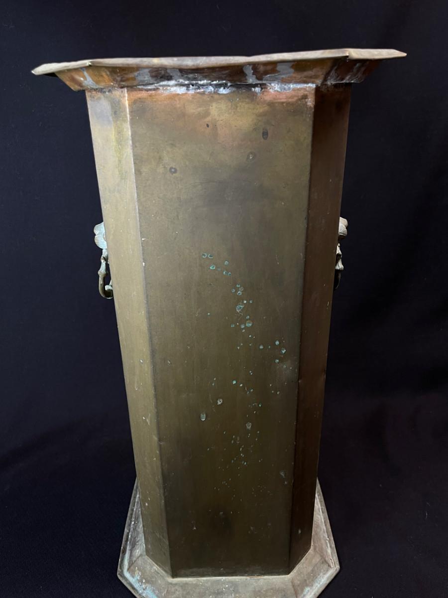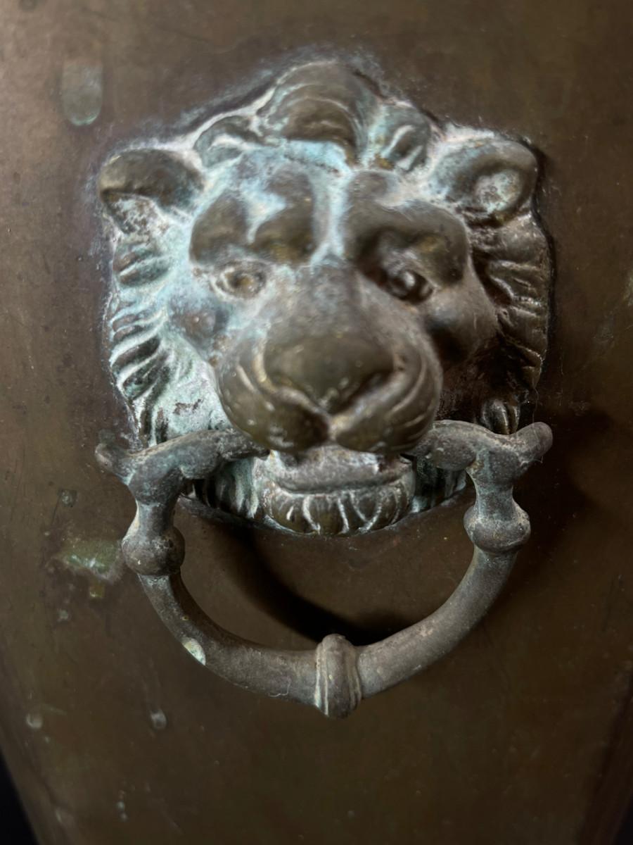 The subject item is a mid-century brass umbrella/can stand mounted with lion headed ring handles on with side. The outside walls of the stand have taken on a light verdigris patina that enhances the charm of the piece. See photos for condition.