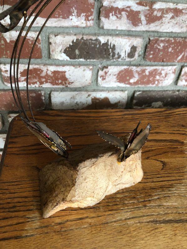 Patina brass duck art sculpture. Ducks in flight, has a very mid century brutalist look with the rough edge design. Attached to a rock as a base.