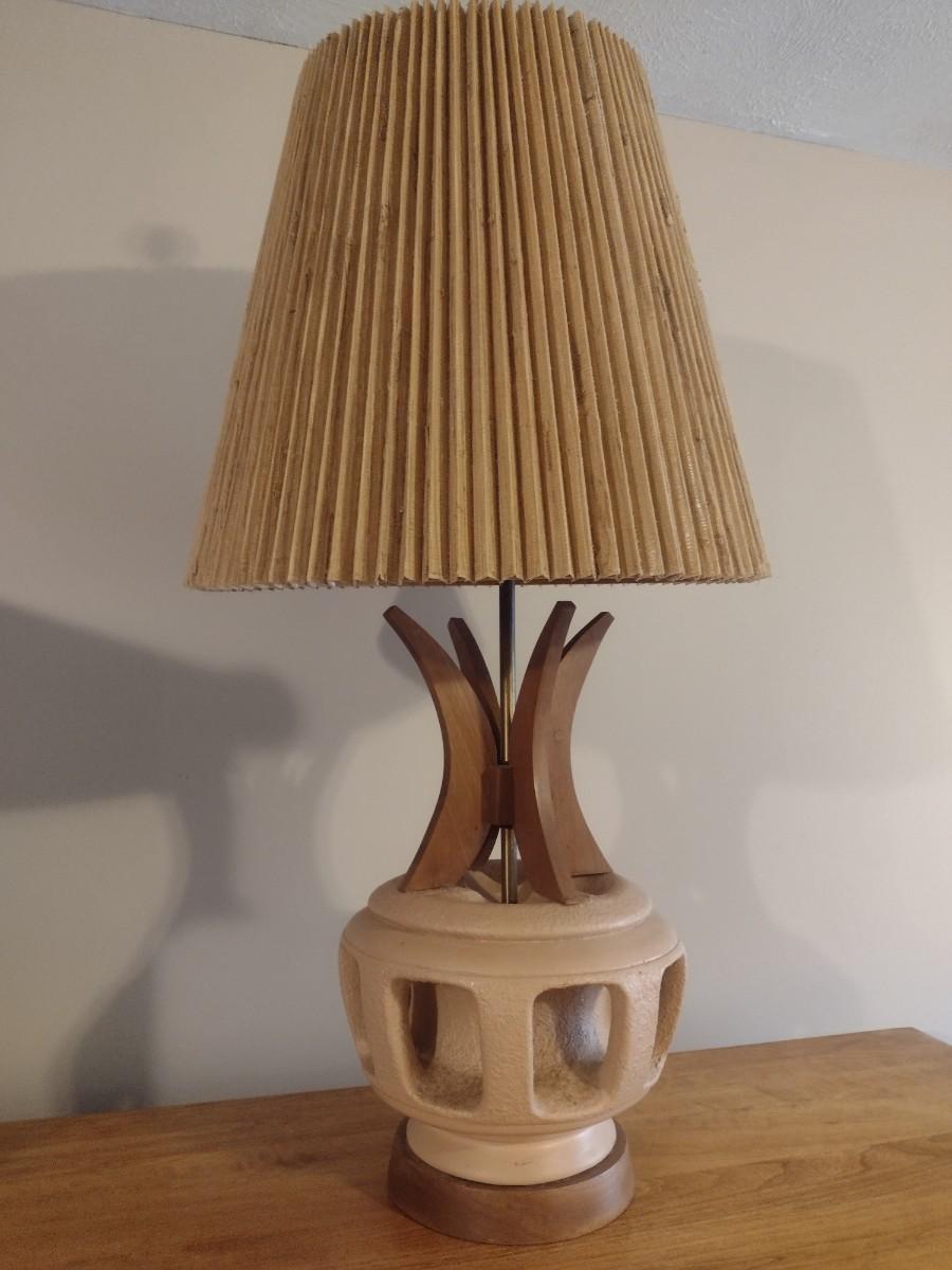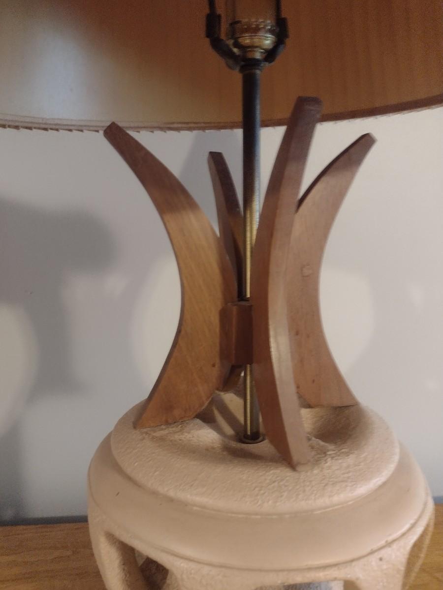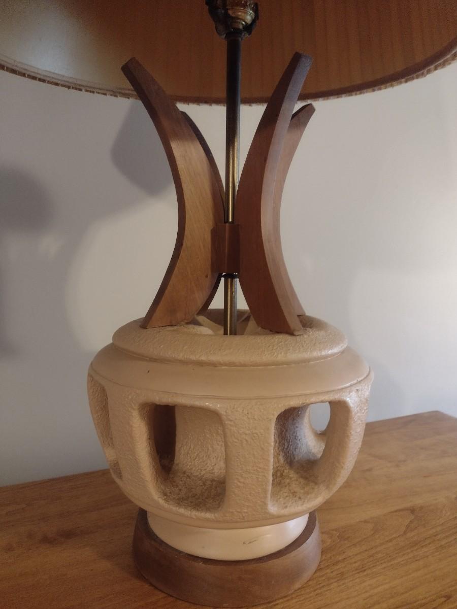 Mid Century Brutalist Chalkware Lamp with Teak Accents and Pleated Lamp Shade