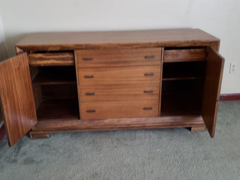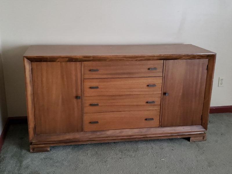 Mid Century Buffet Server. This matches the china cabinet photographed. Solid Wood piece. Has some cosmetic issues consistent with wear and use. Dimensions 62"w x 20"d x 32.5"h. Lot #0038