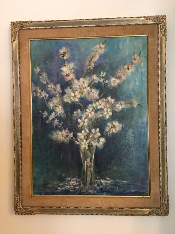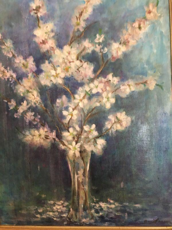 Soft pastel, beautiful white flowers with blue background, in VG conditions, measures 22.5 " X 29" with a view of 17.5" X 23"5".
