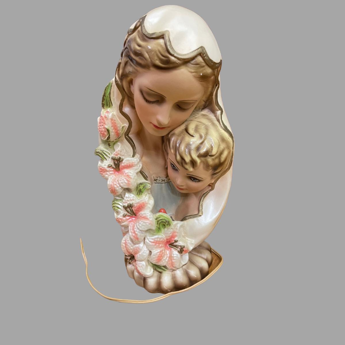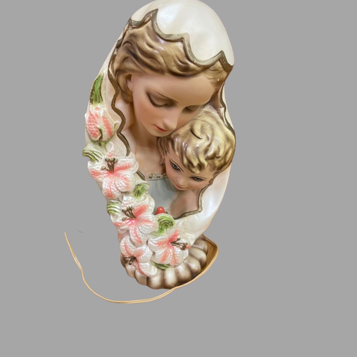 This is a religious Catholic Art Statuary of Madonna and Child. It is chalkware and was used as a night light back in the day. It is stunning. 16"