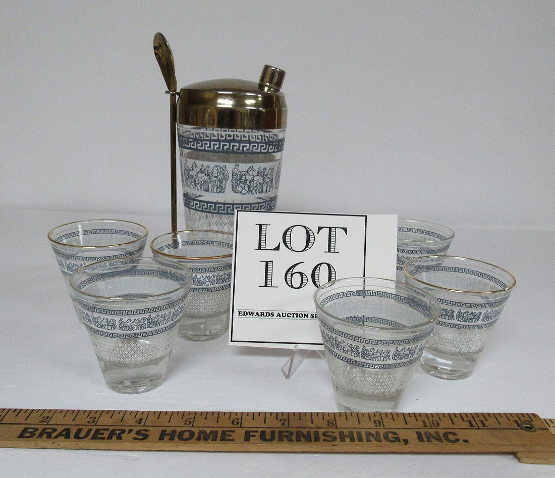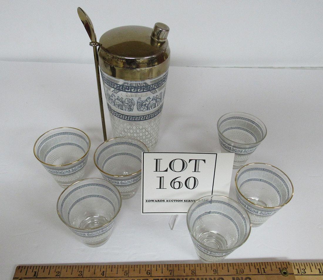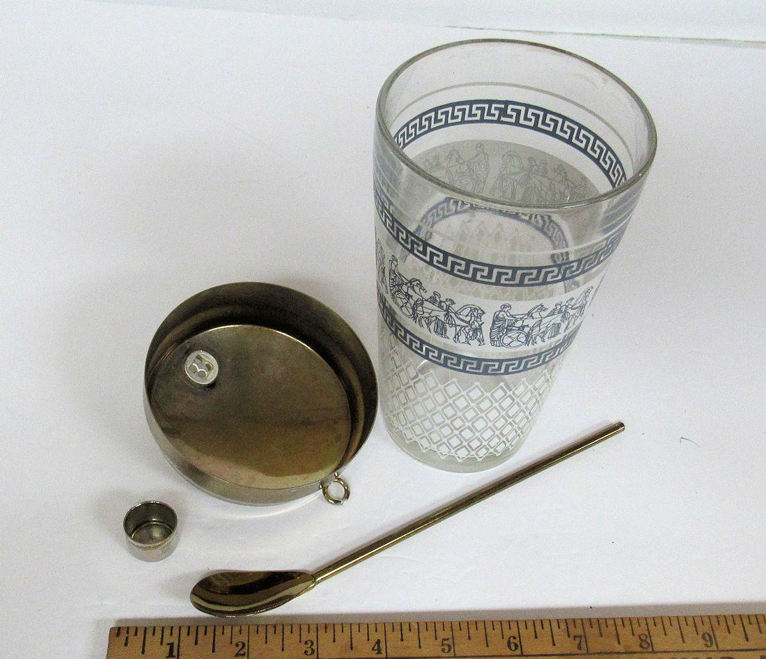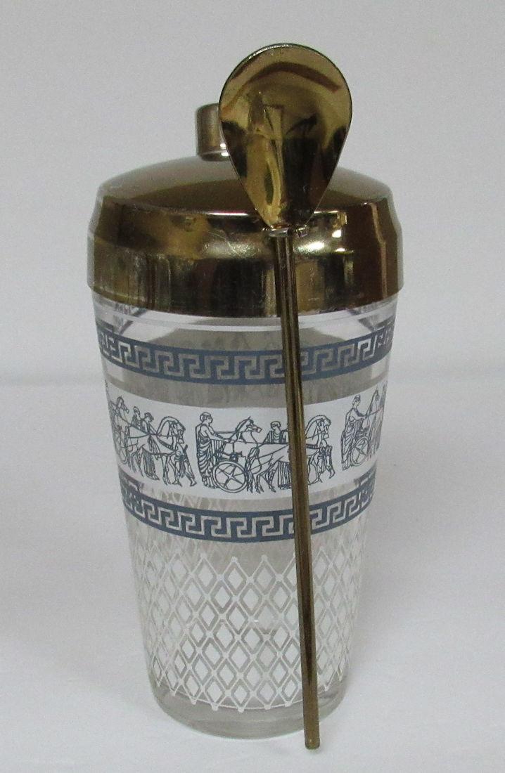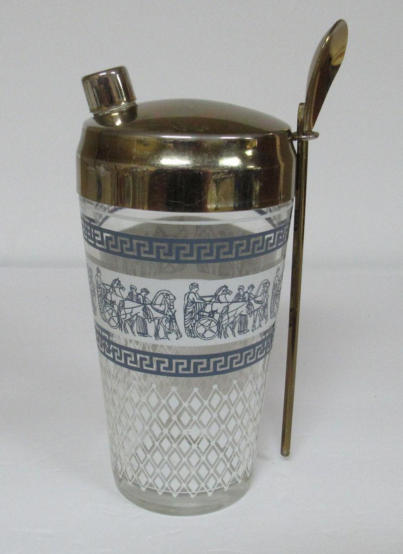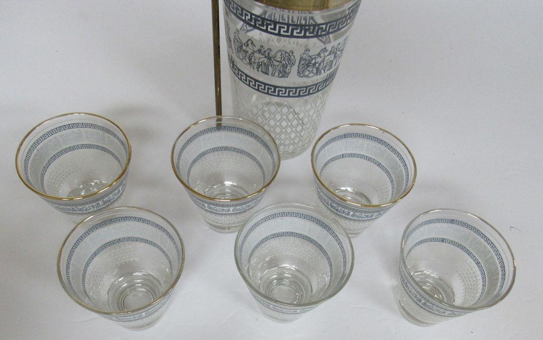 Mid Century Cocktail Shaker and Matching Cocktail Glasses Greek Theme
