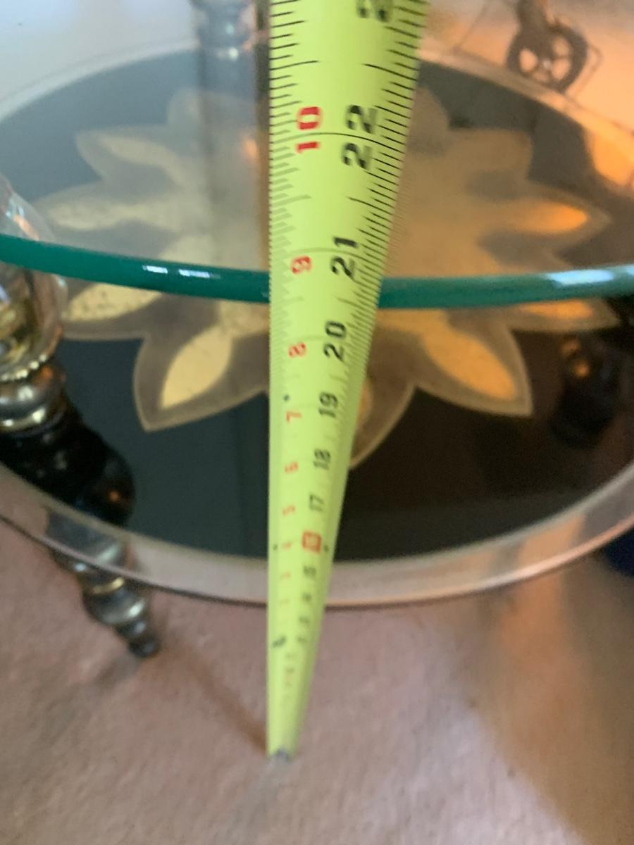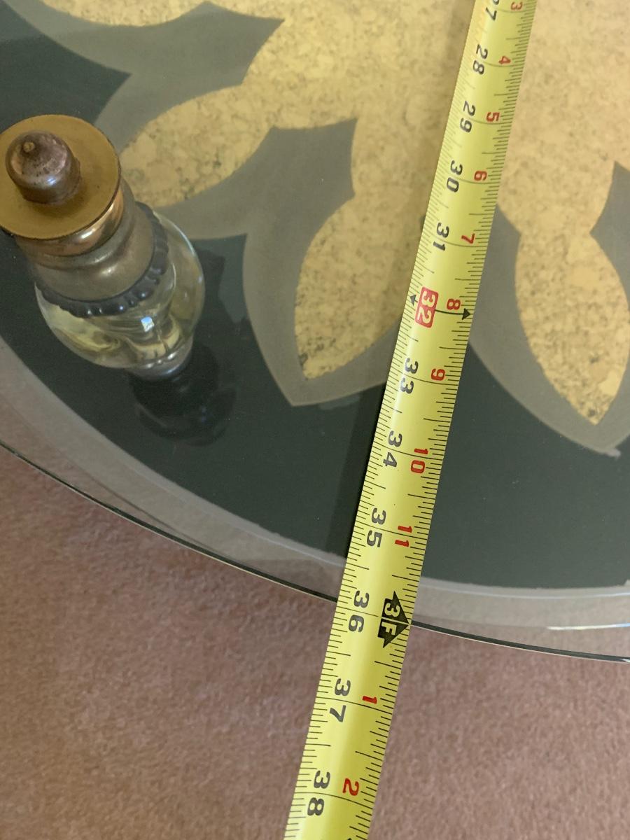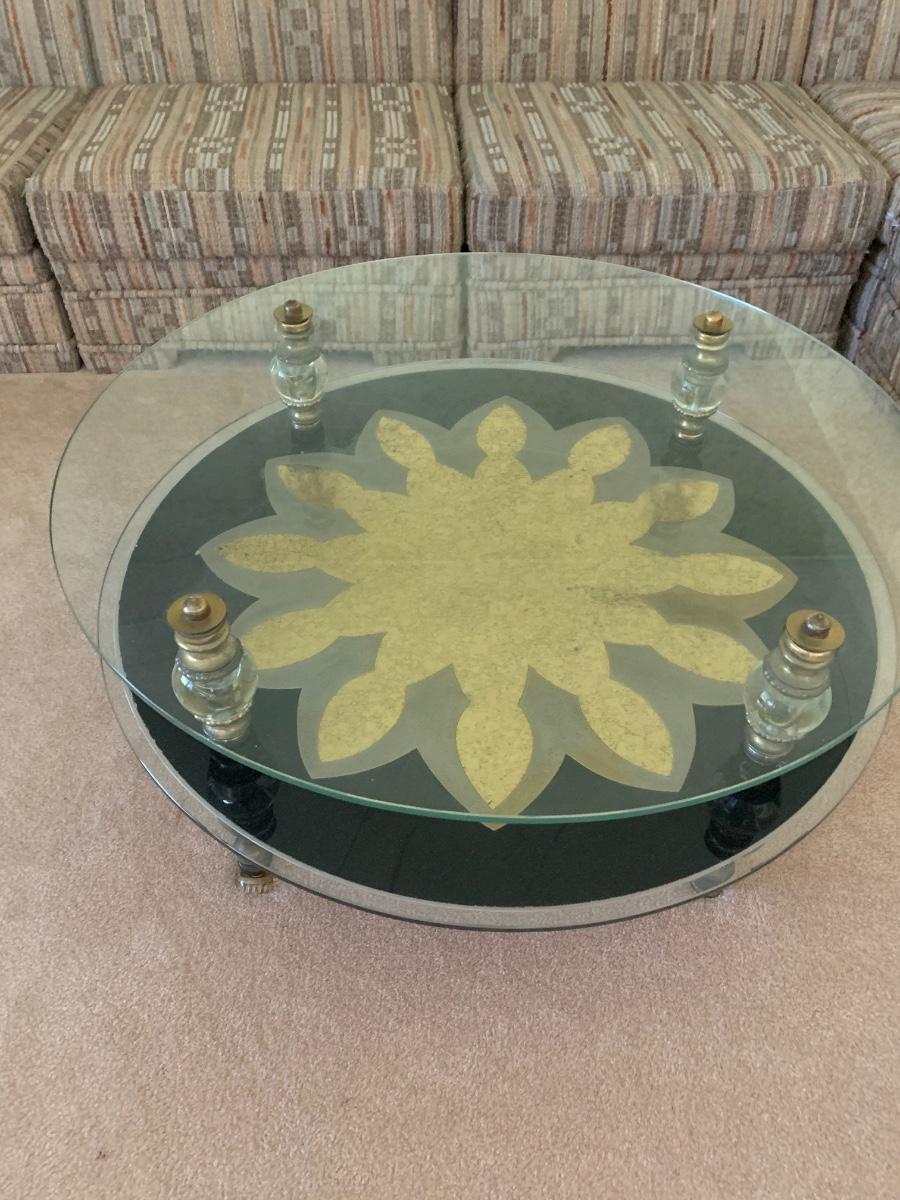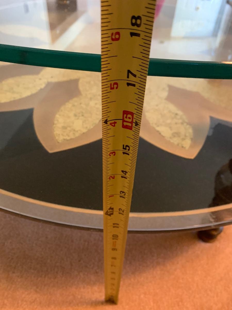Coffee table is 36" in diameter and Two End Tables measure 22 " in diameter each. .See photos for other measurements, content and condition. One end table has slight discoloration as shown in last photo. Fantastic, groovy set - you will not be disappointed!