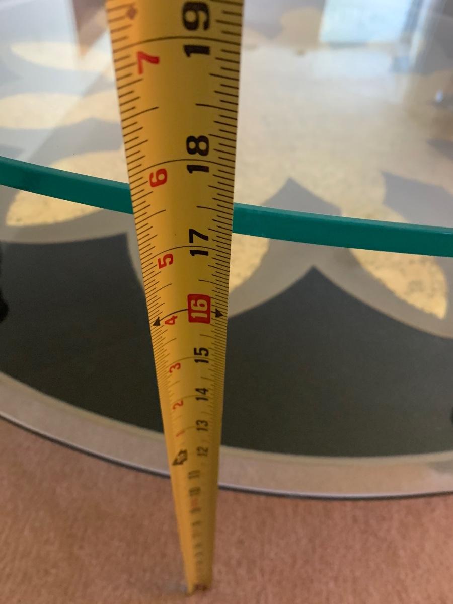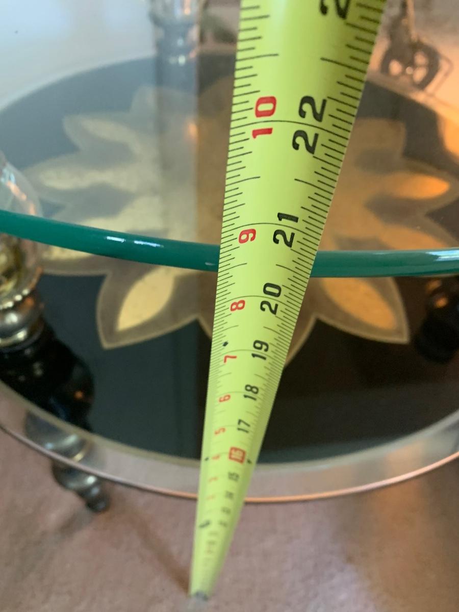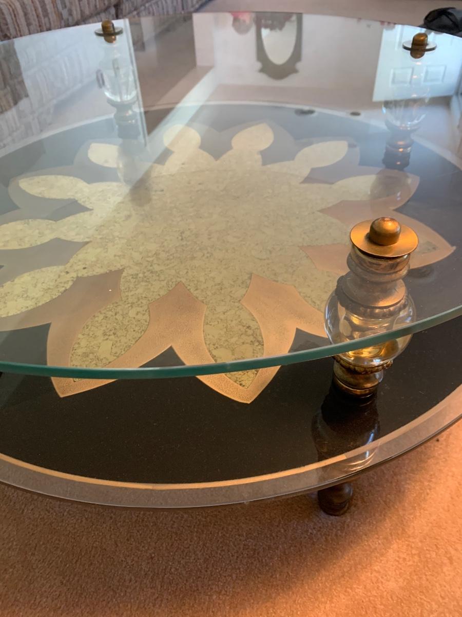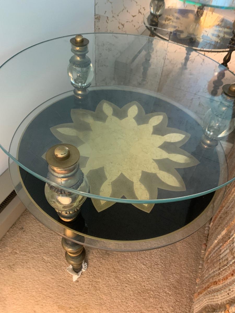 Coffee table is 36" in diameter and Two End Tables measure 22 " in diameter each. .See photos for other measurements, content and condition. One end table has slight discoloration as shown in last photo. Fantastic, groovy set - you will not be disappointed!