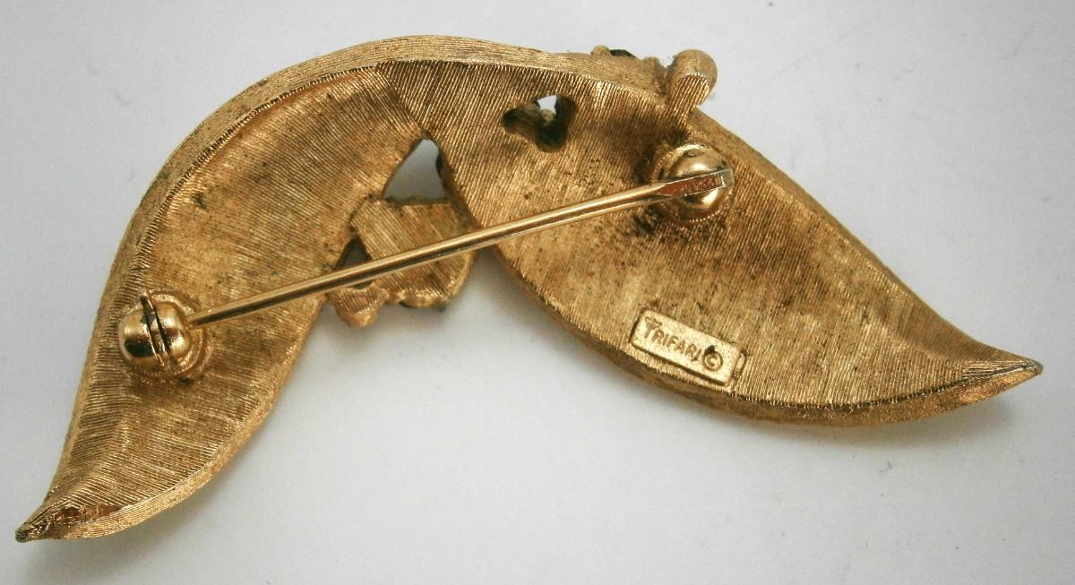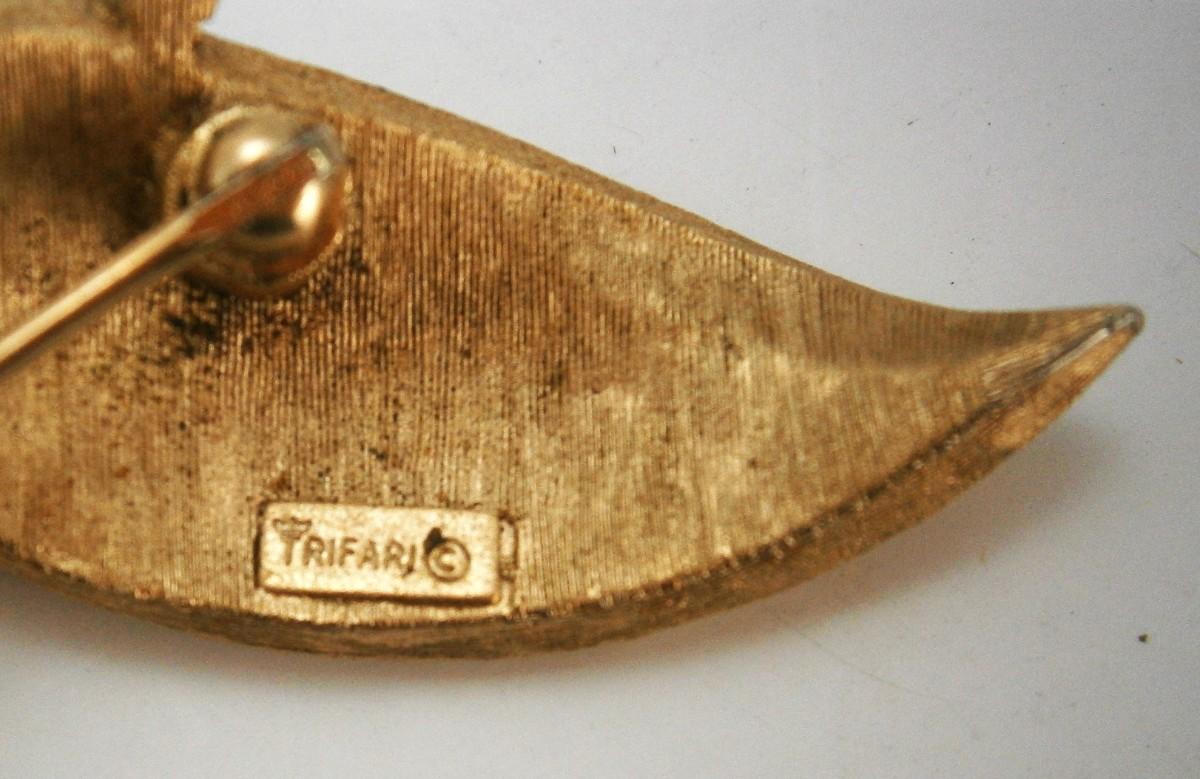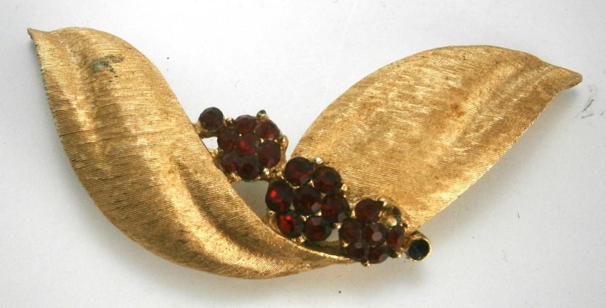 Mid Century Crown Trafari :Pin/Brooch, gold tone metal with red rhinestones, 2 1/4 wide.