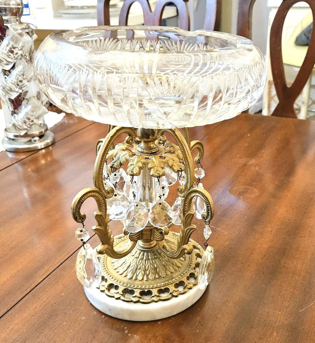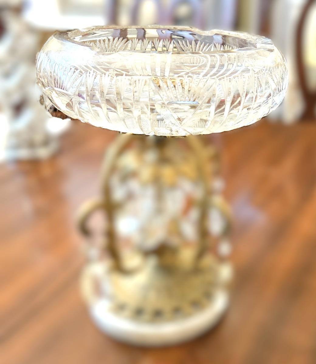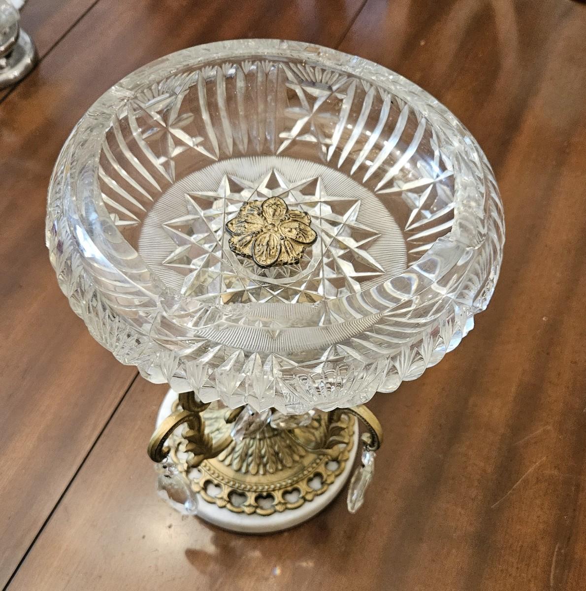 Mid Century Cut Crystal Ashtray with Ornate Metal Base and Marble Element
