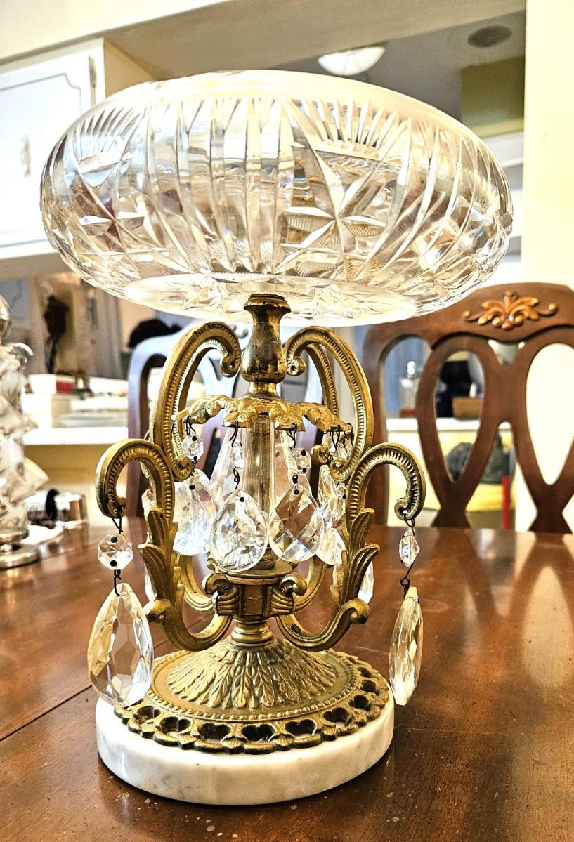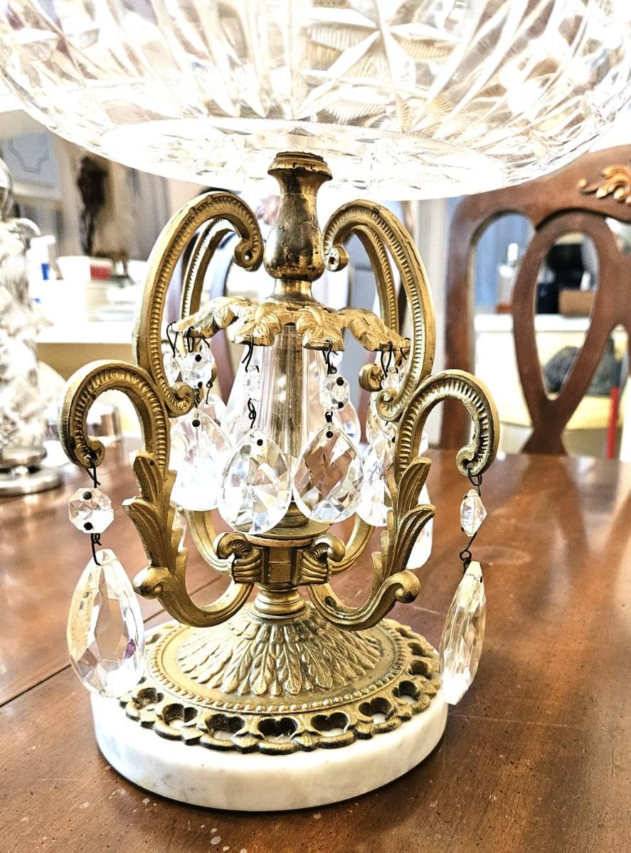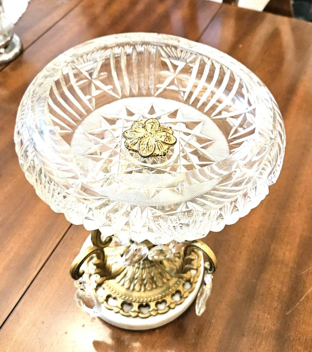 Mid Century Cut Crystal Ashtray with Ornate Metal Base and Marble Element
