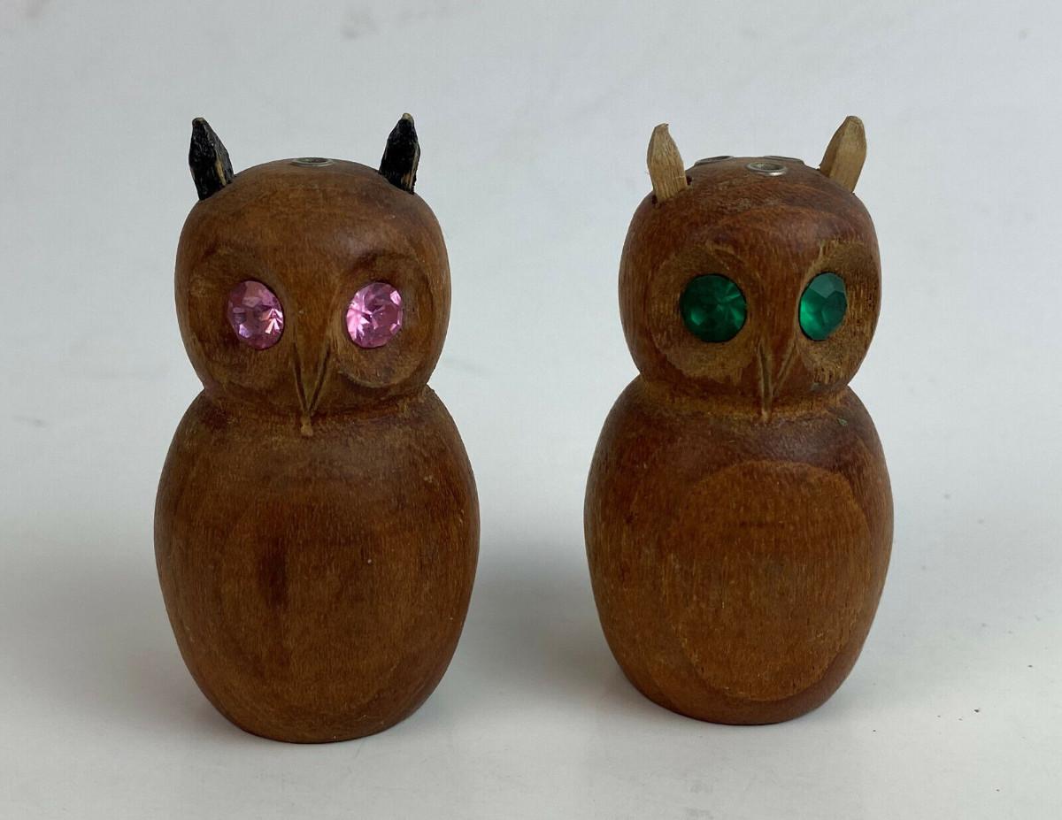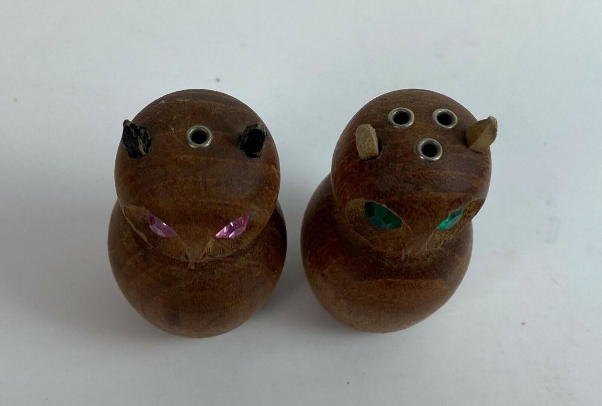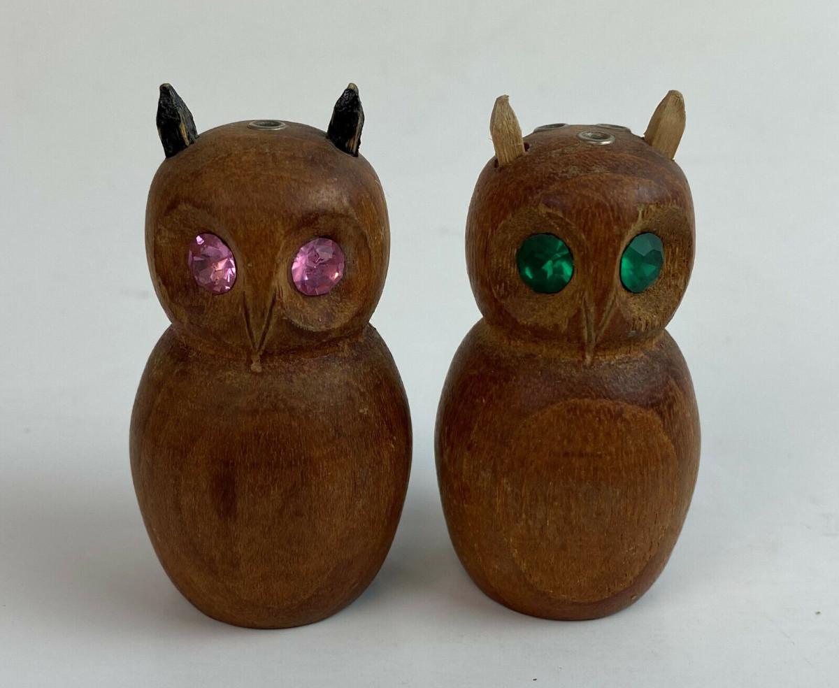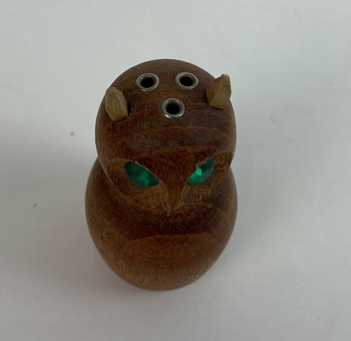 Here are a pair of small carved teak wood figural Owl salt & pepper shakers from the Mid Century...Danish Modern style...Made in Japan...as shown...2.25"/57mm.