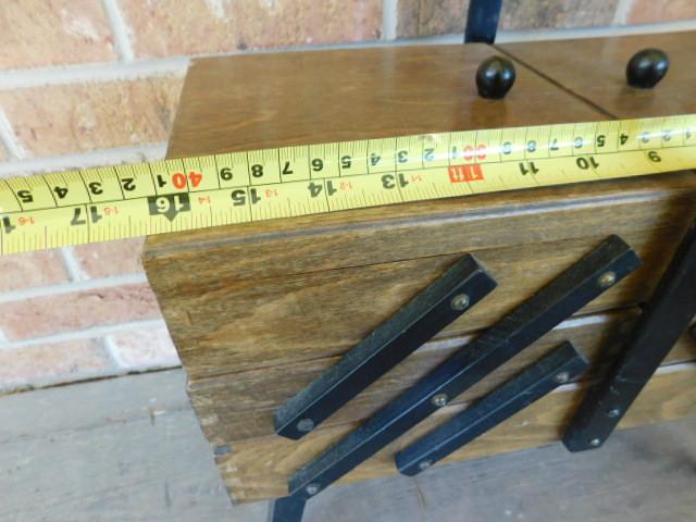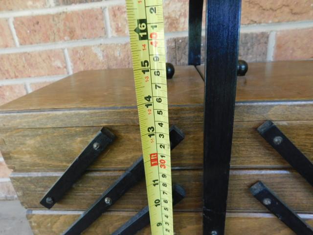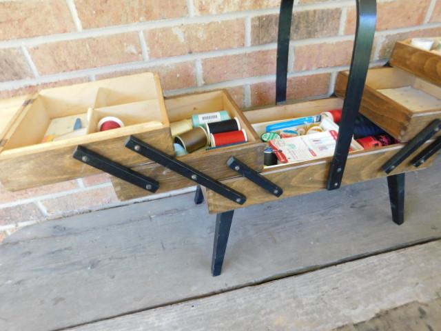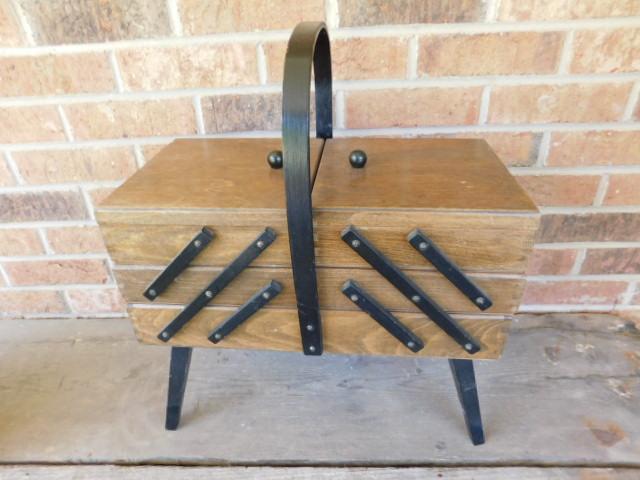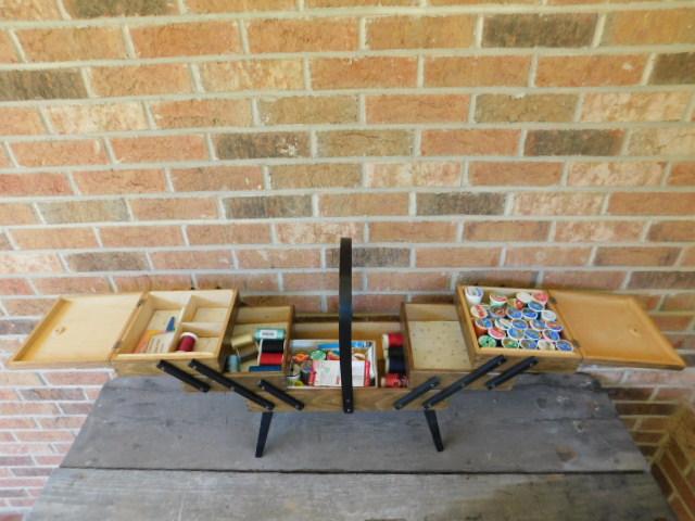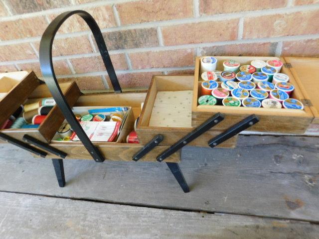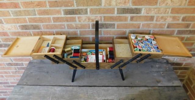 Mid Century Danish Style Accordian Sewing Box and Contents may have wear and scratches