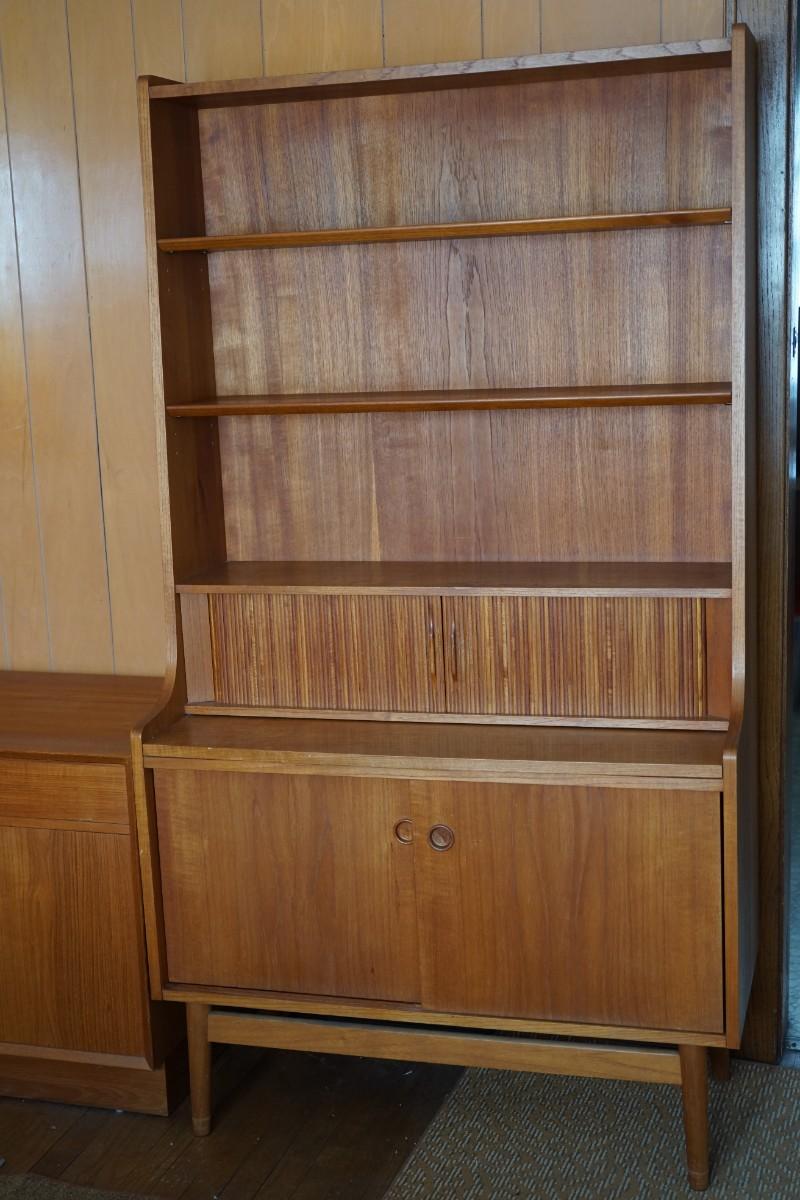 teak cabinet with three bookshelves at the top , tambour door to conceal drawers, and sliding doors below with shelf.