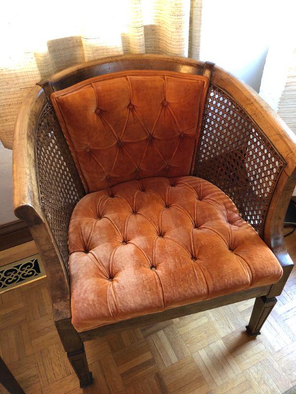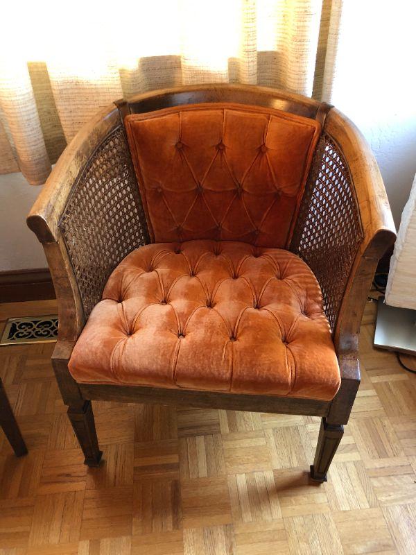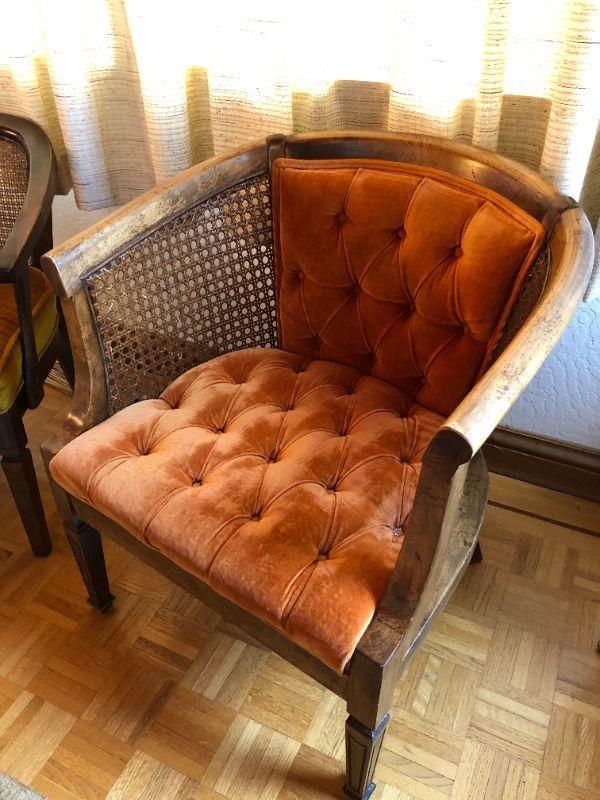 Mid Century Deep Orange Tufted Fabric and Wood Chair