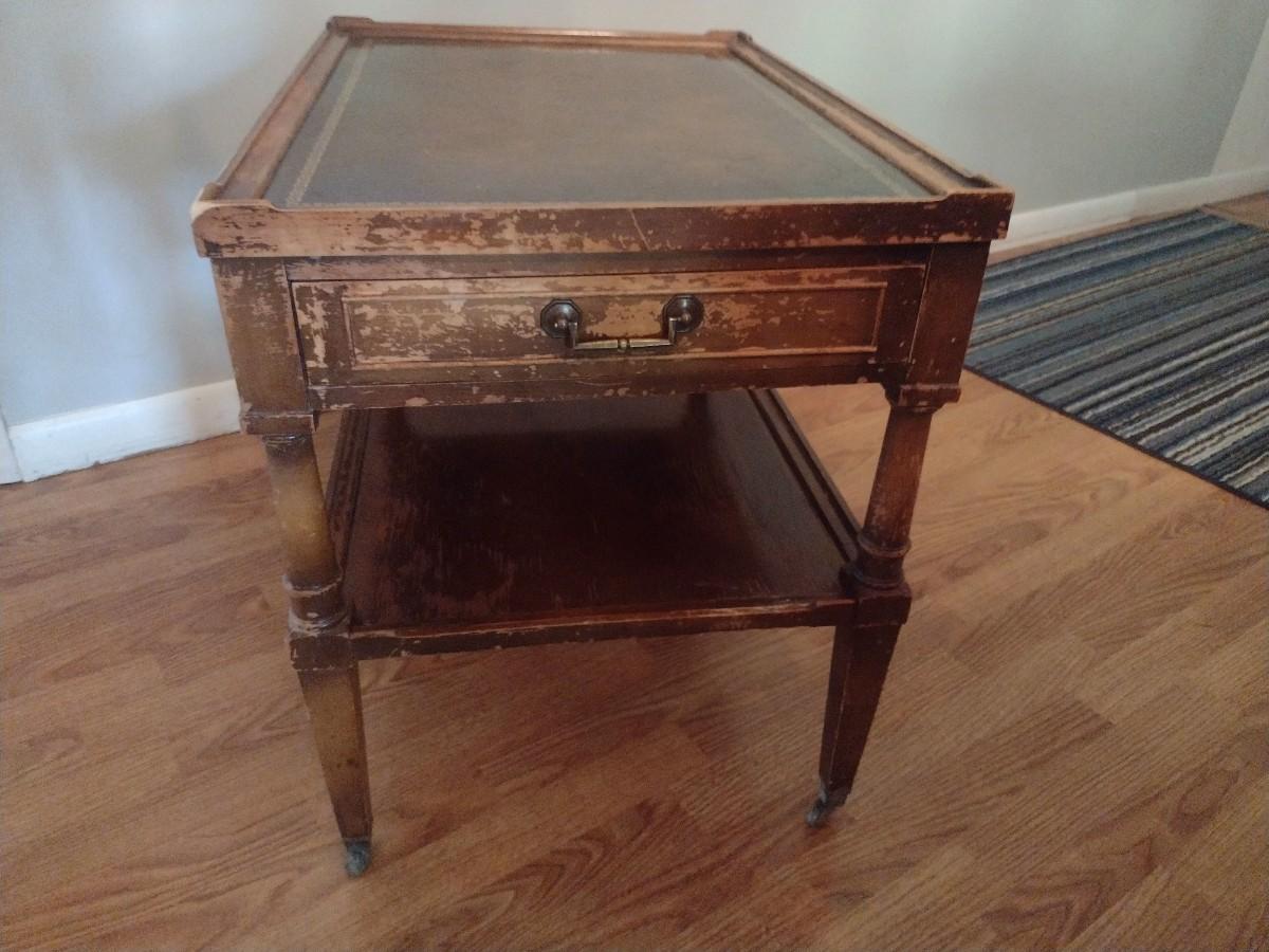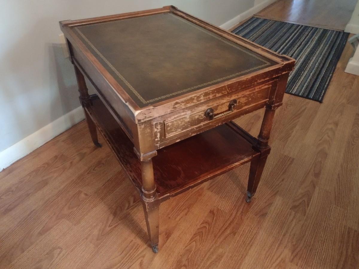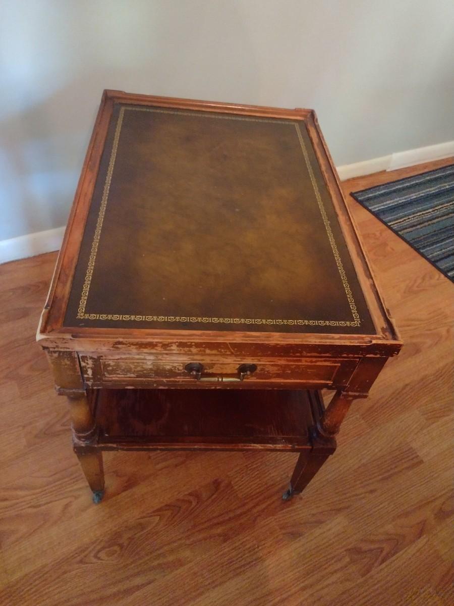 Mid Century Design Leather Top Side Table with Single Drawer. Some of the finish is worn as shown. One castor will need to be repaired.