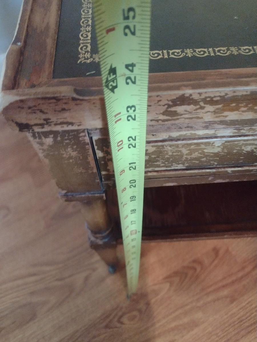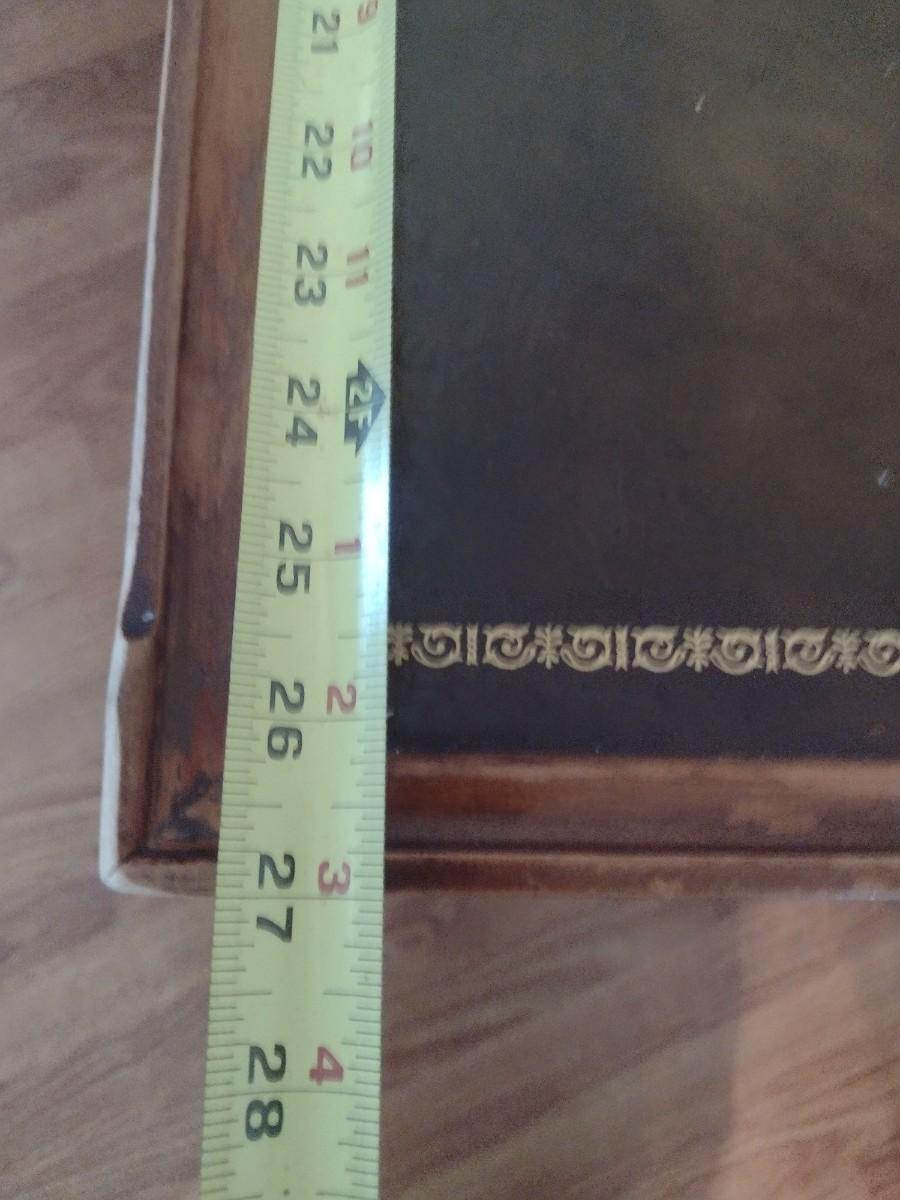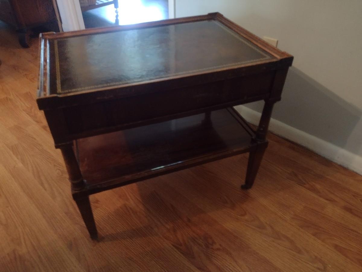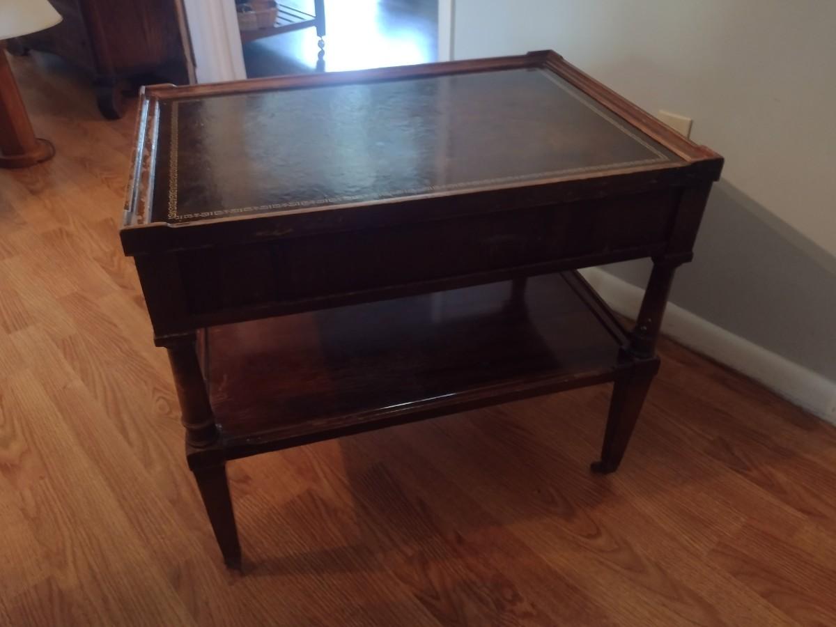 Mid Century Design Leather Top Side Table with Single Drawer. Some of the finish is worn as shown. One castor will need to be repaired.