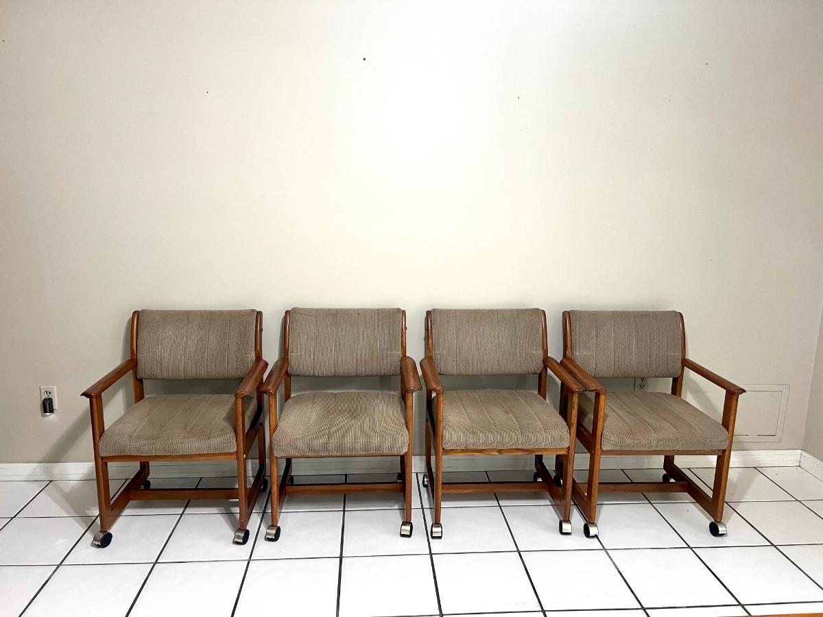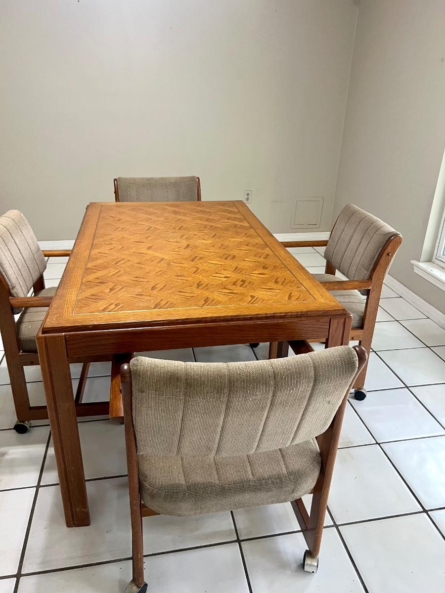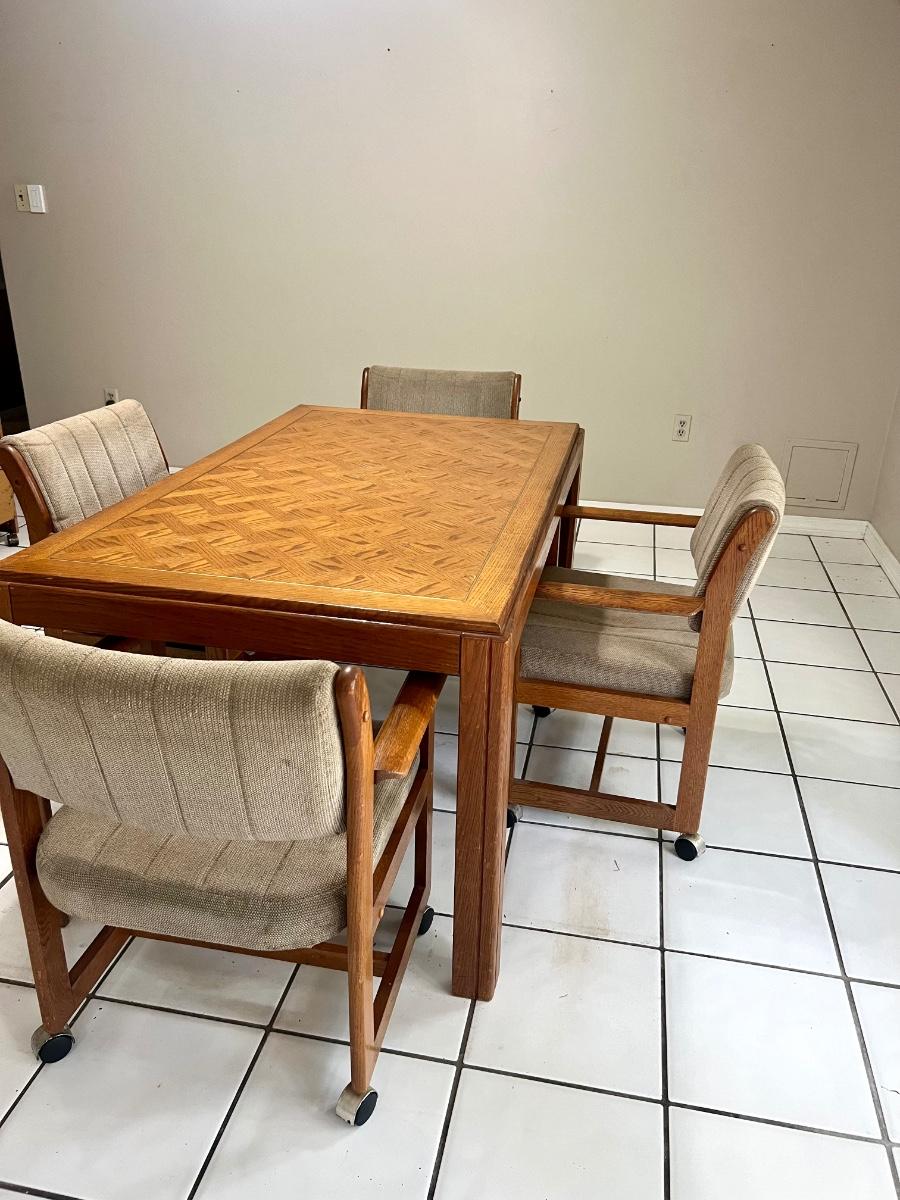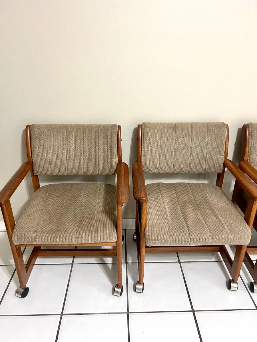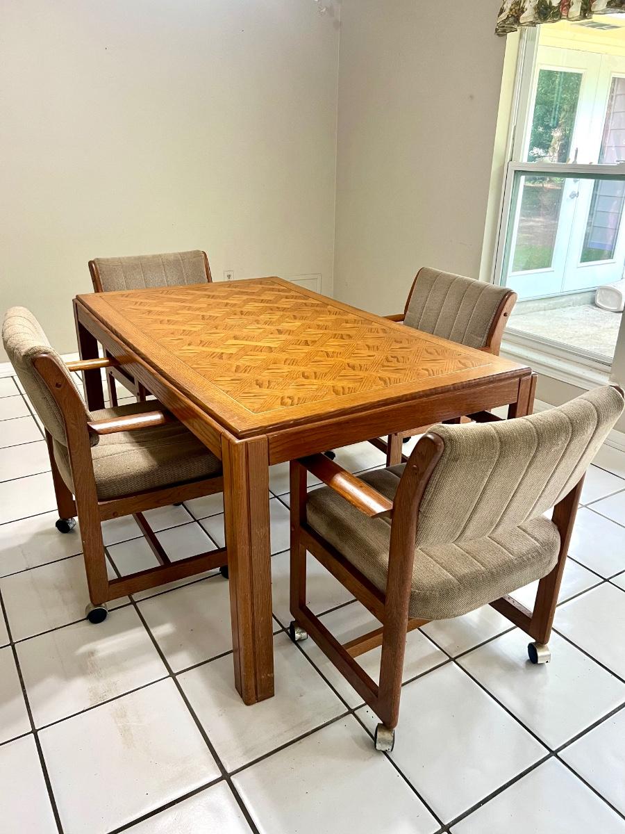 Mid-century modern Dining room table and 4 chairs on wheels. Measures. Chairs are a dark colored fabric and will need to be cleaned, but no tears or rips in the fabric. Does show some signs of use, but can be used as is.