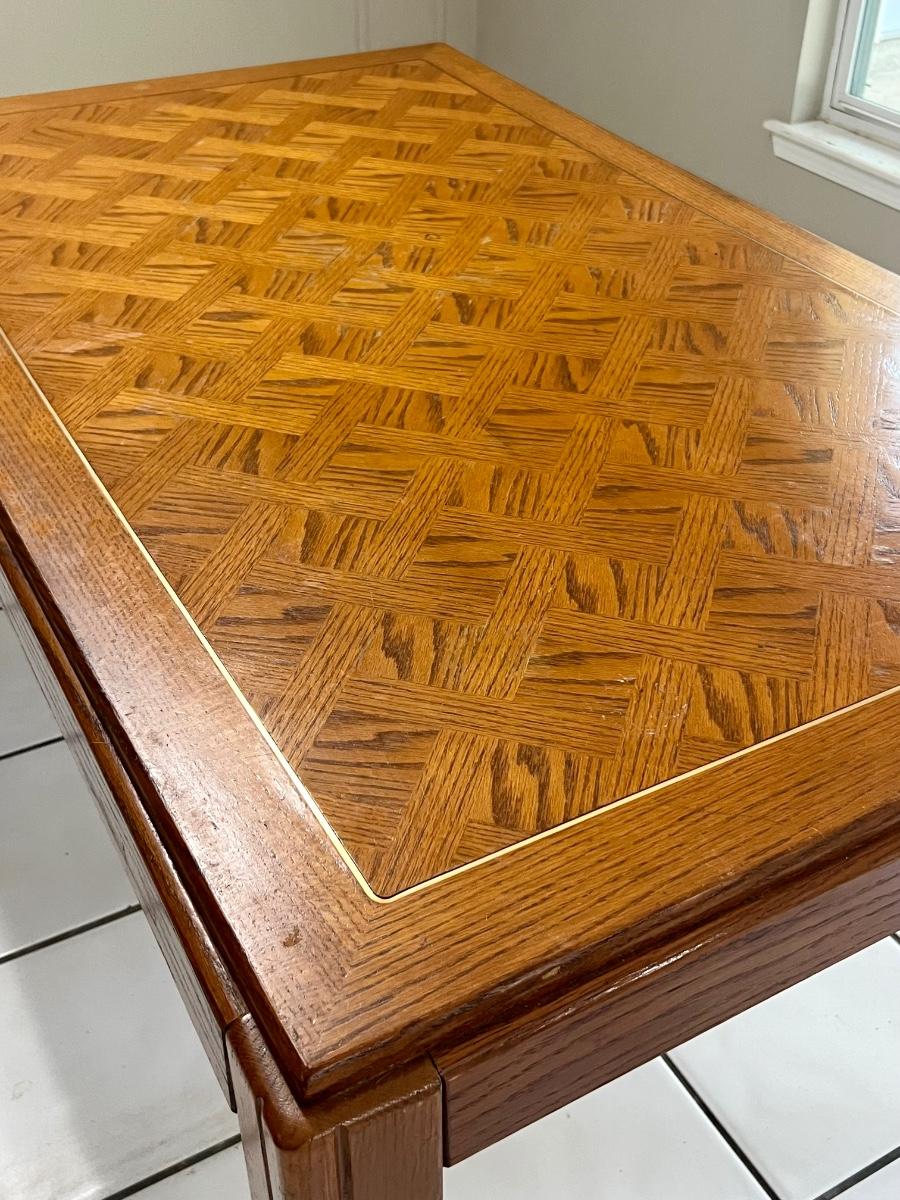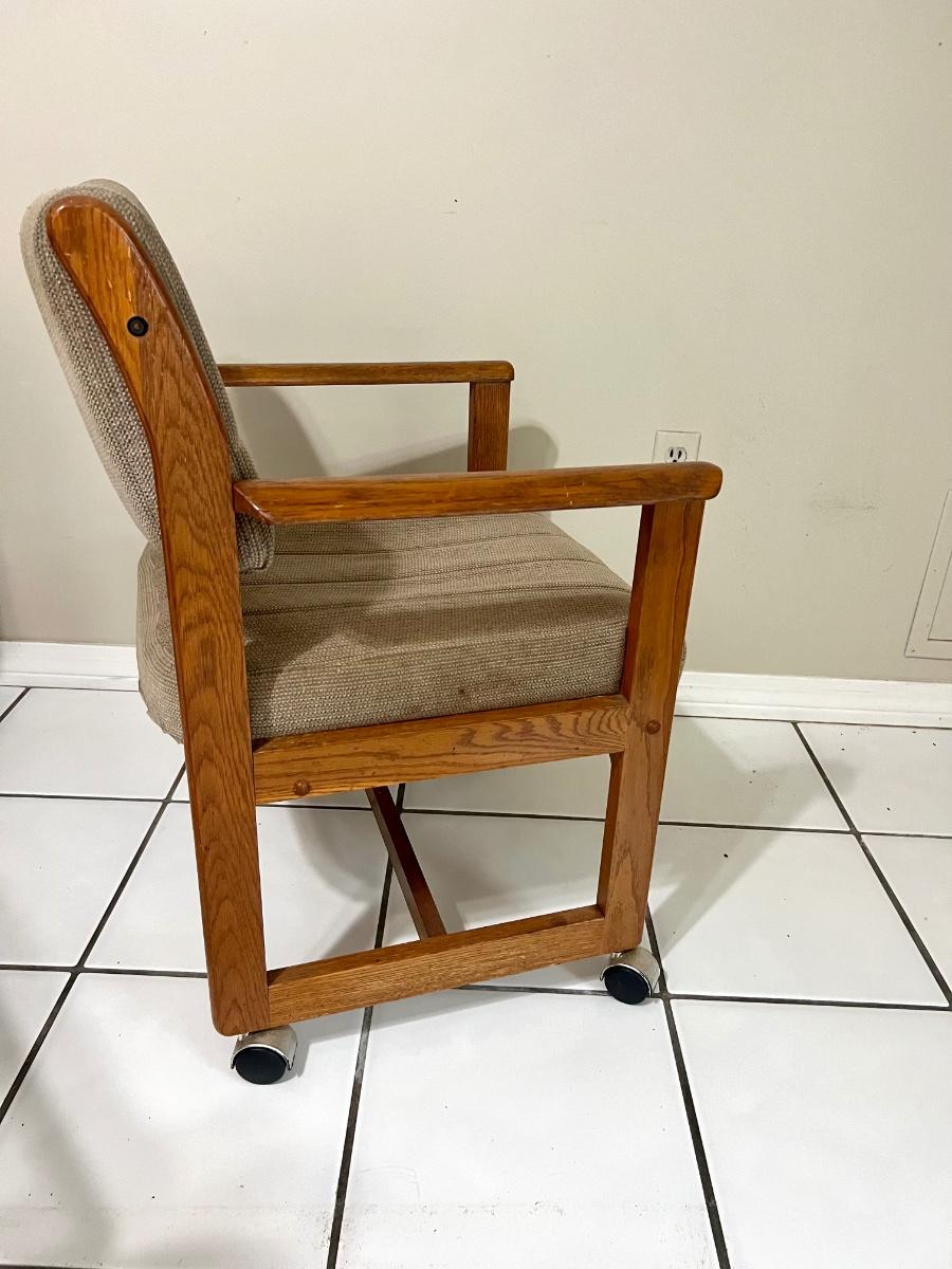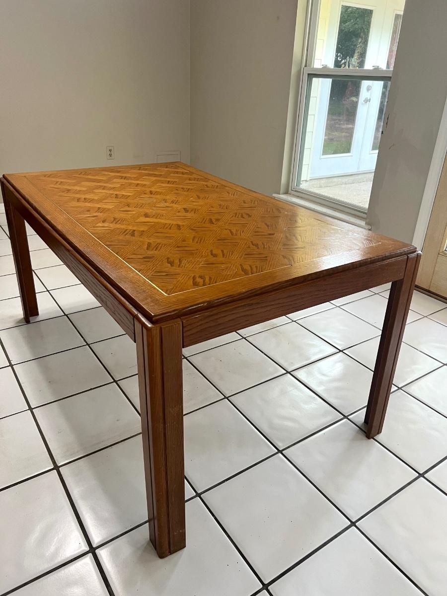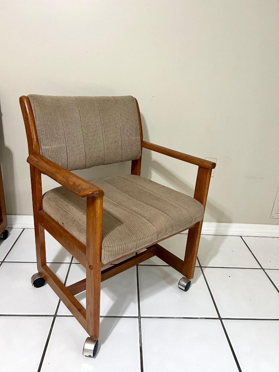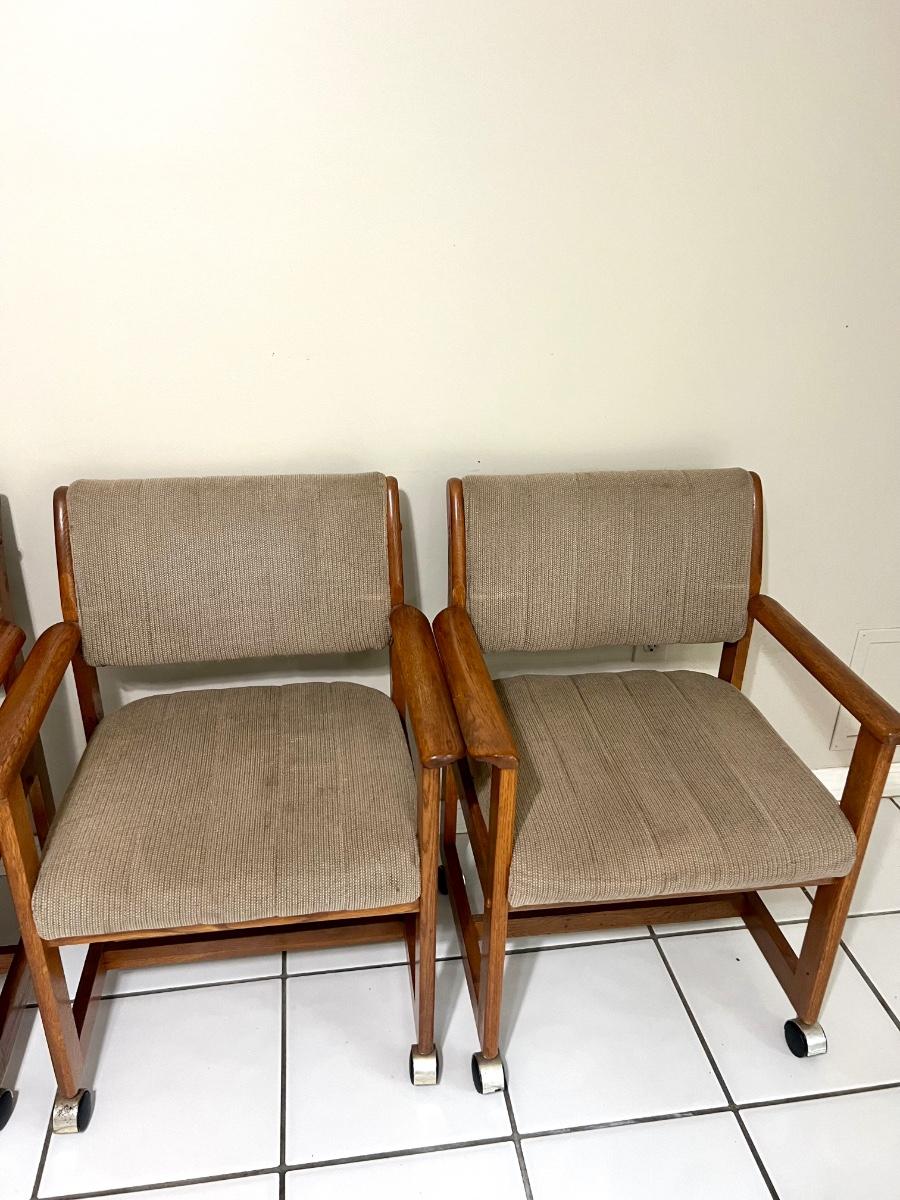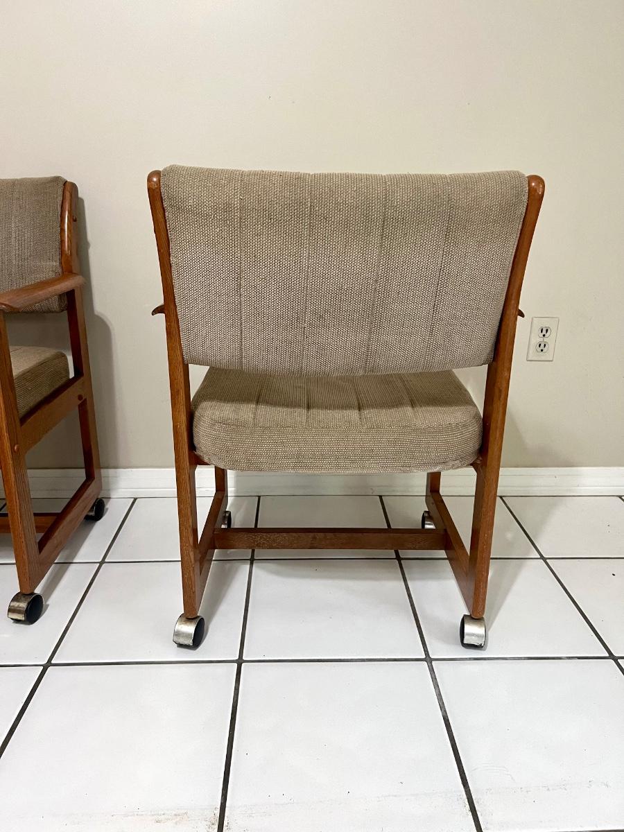 Mid-century modern Dining room table and 4 chairs on wheels. Measures. Chairs are a dark colored fabric and will need to be cleaned, but no tears or rips in the fabric. Does show some signs of use, but can be used as is.