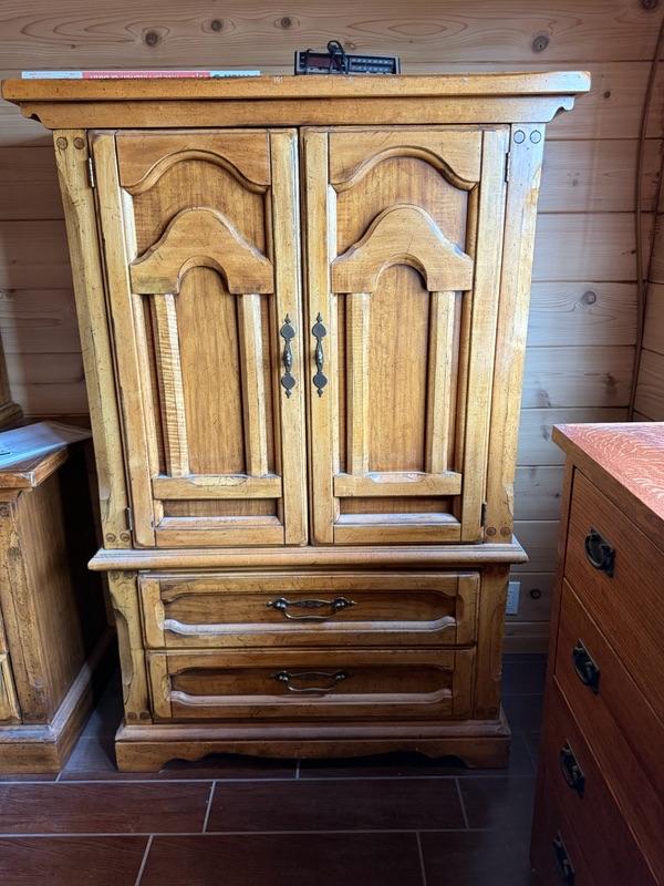 Heavy 1970's era dressers. Tall Dresser with upper cabinet and drawers below. 62" tall x 18" deep