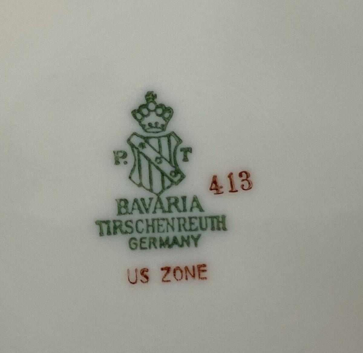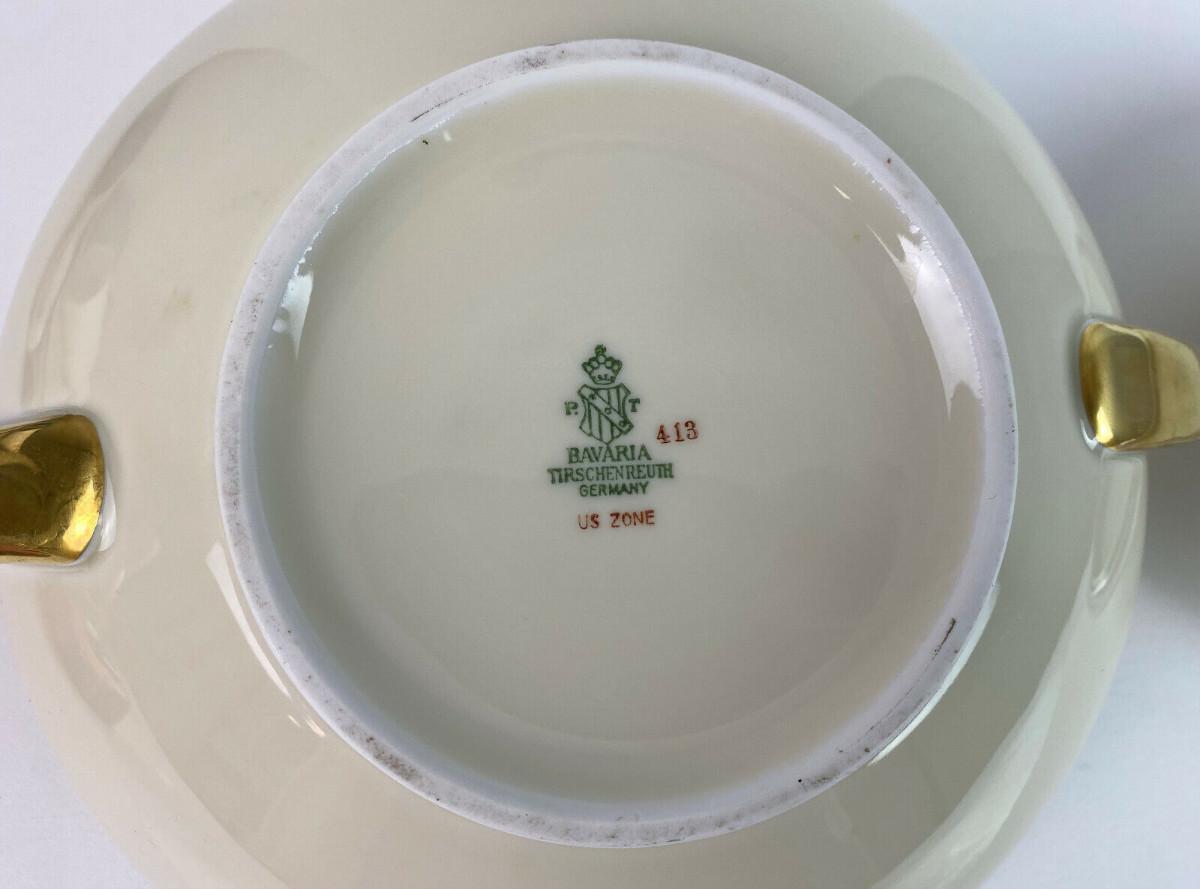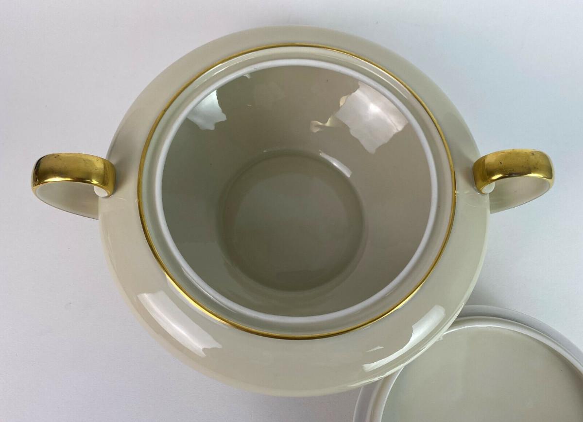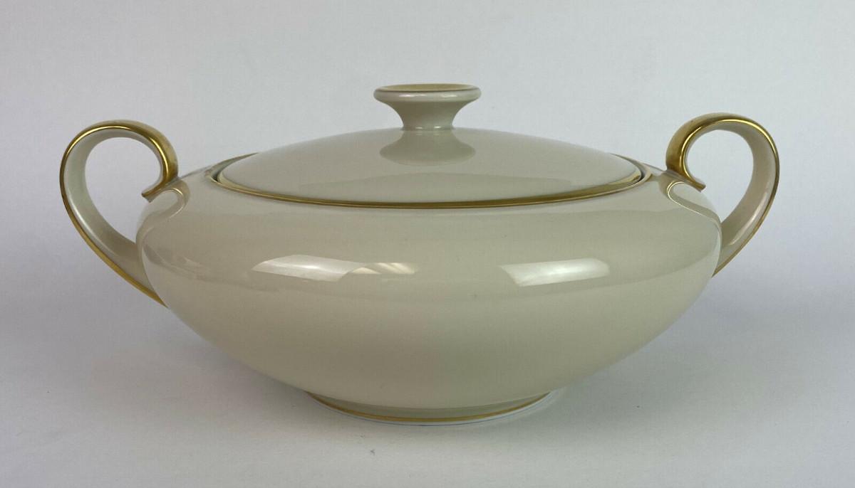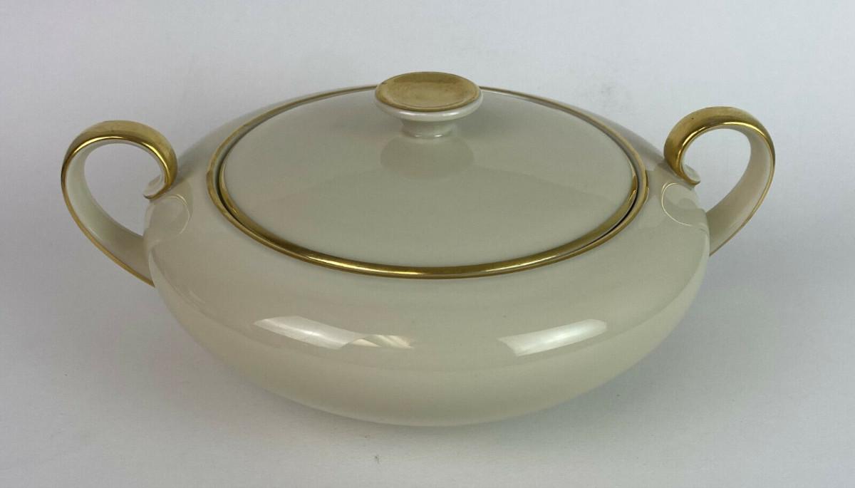 No sign of use on this Mid Century Modern Covered Vegetable Bowl from Tirschenreuth..Clean lines on this elegant ivory porcelain server with gold trim...8.5" diameter...Bears the PT Bavaria Tirschenreuth mark/U.S. Zone...Produced circa 1946-1952....The American zone included Bavaria.