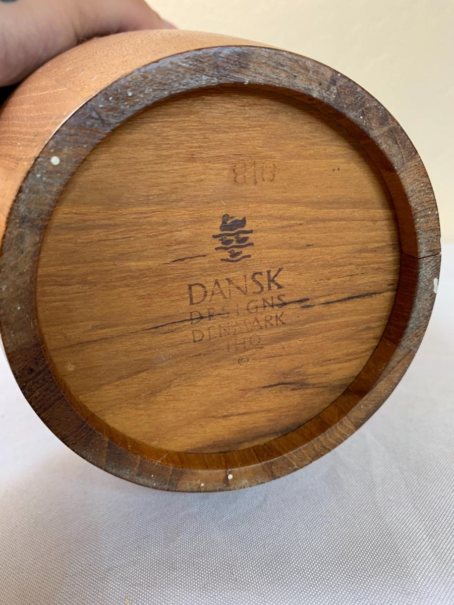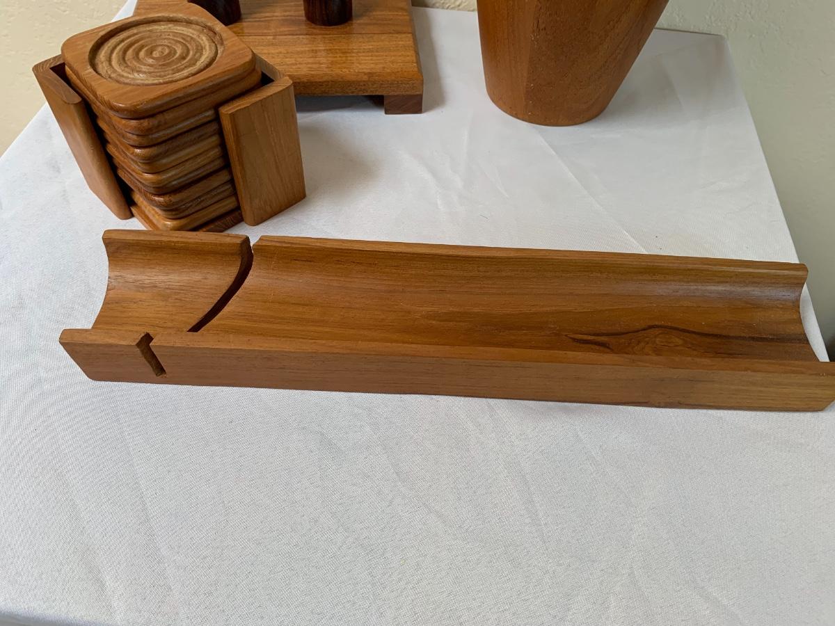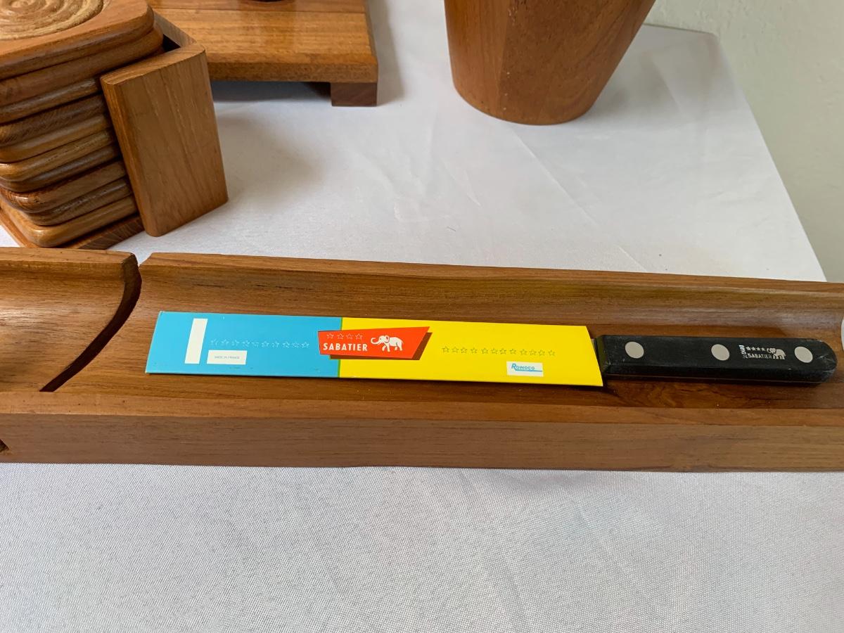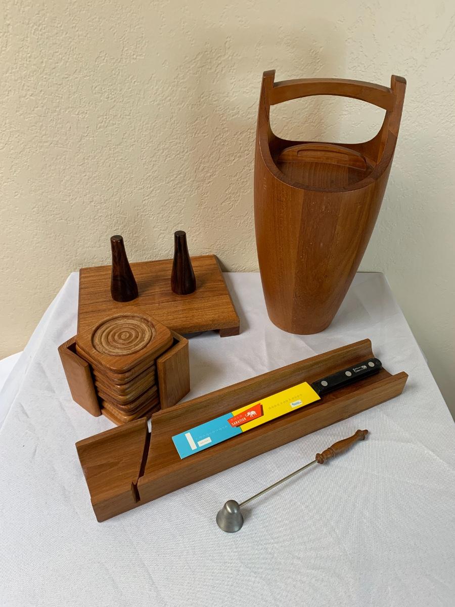 Assortment of mid century kitchen items including one Dansk designs Denmark IHQ 810 piece (ice bucket that is plastic lined), one baguette slicer made by Knolber, teak wood. Knife made in France by Sabatier. Set of coasters (teak wood made by Dolphin), one wood stand and one snuffler all in great condition with some normal wear