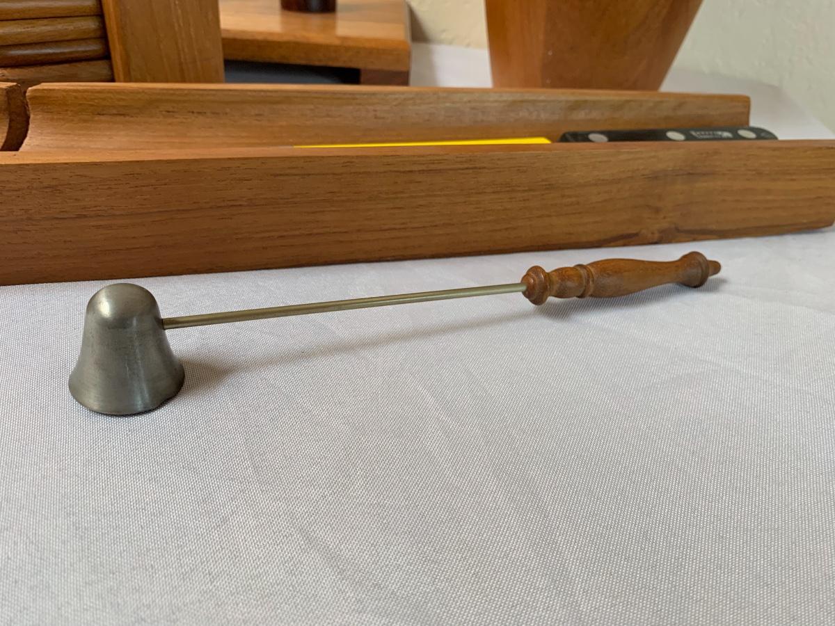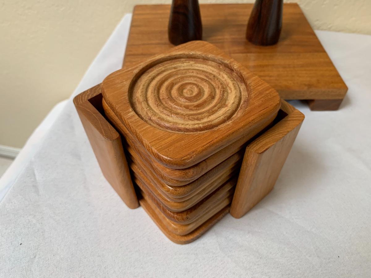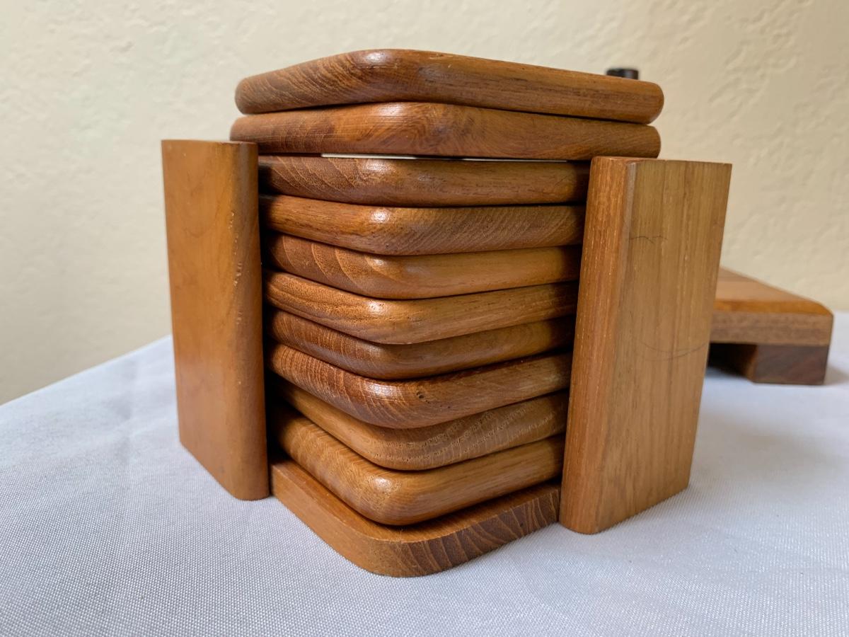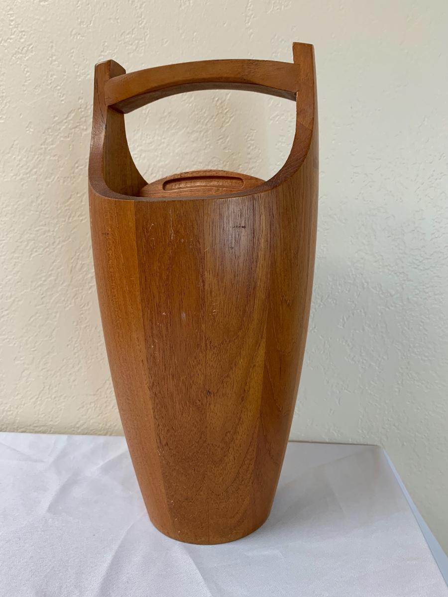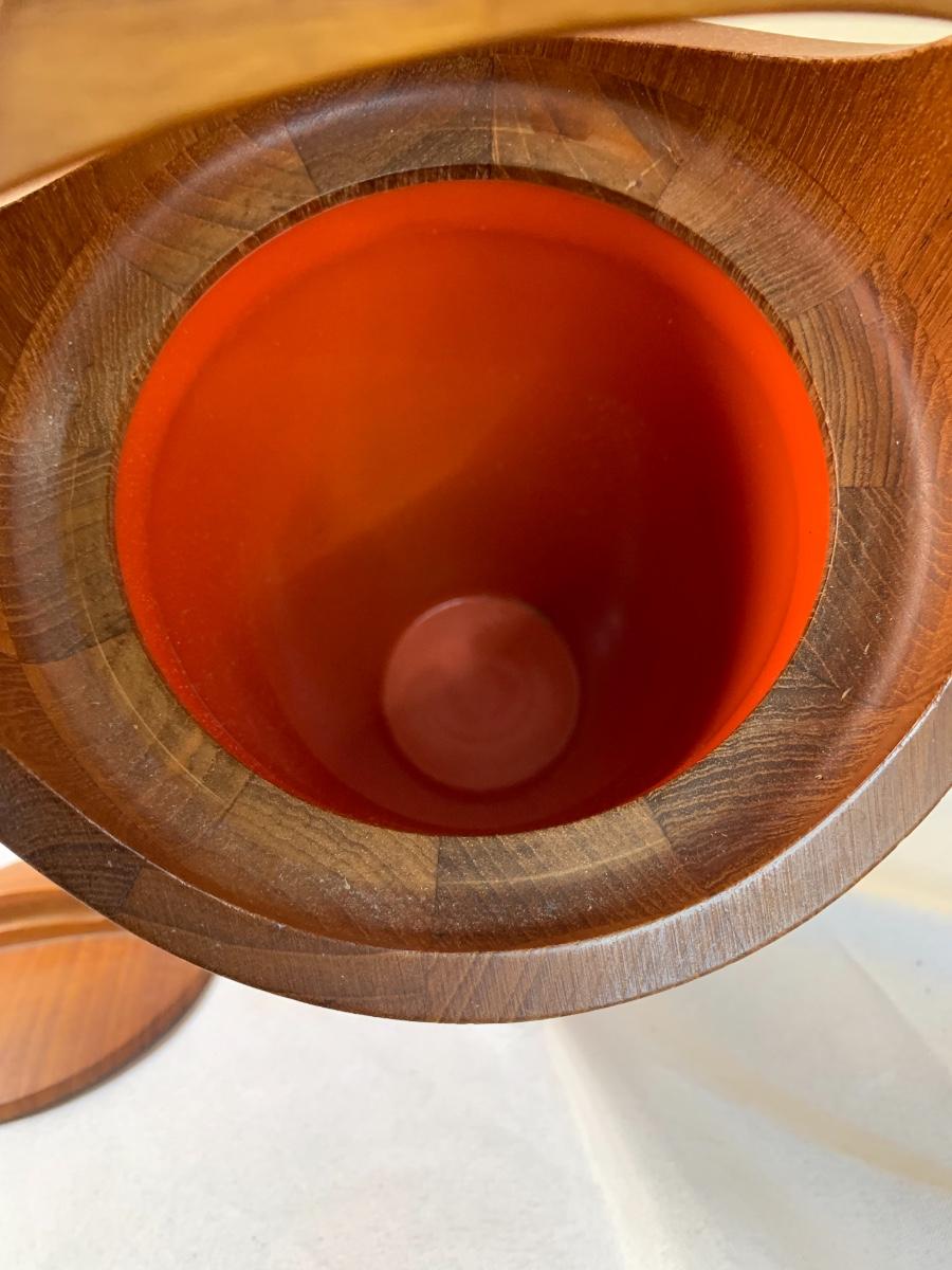 Assortment of mid century kitchen items including one Dansk designs Denmark IHQ 810 piece (ice bucket that is plastic lined), one baguette slicer made by Knolber, teak wood. Knife made in France by Sabatier. Set of coasters (teak wood made by Dolphin), one wood stand and one snuffler all in great condition with some normal wear