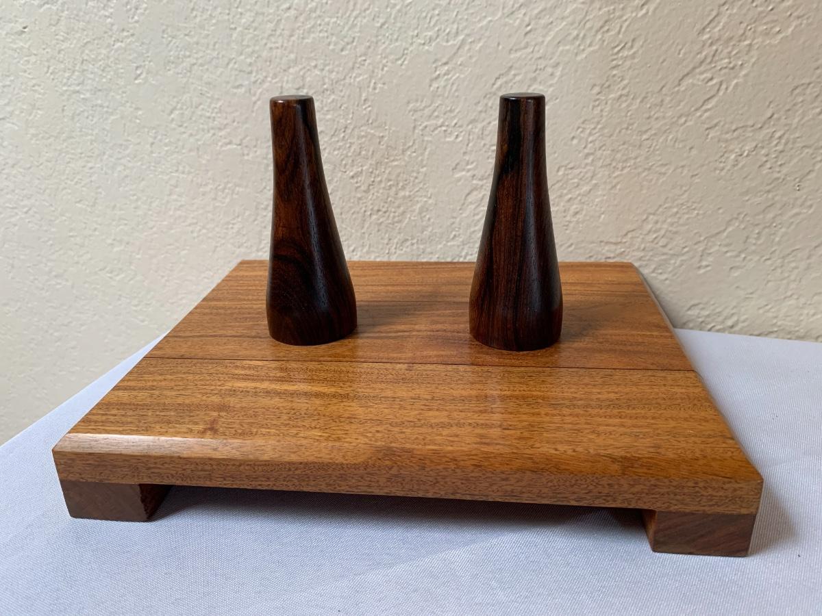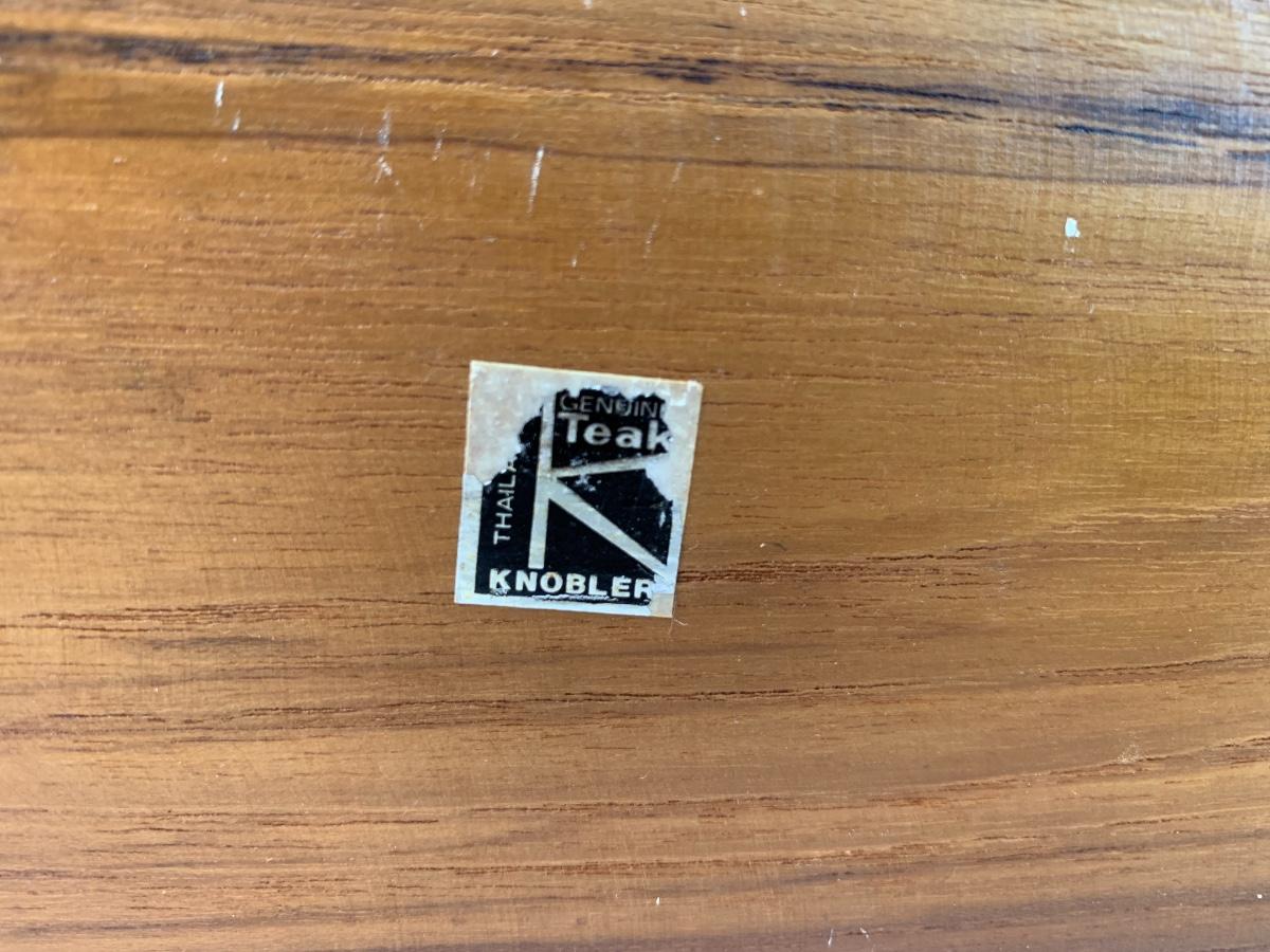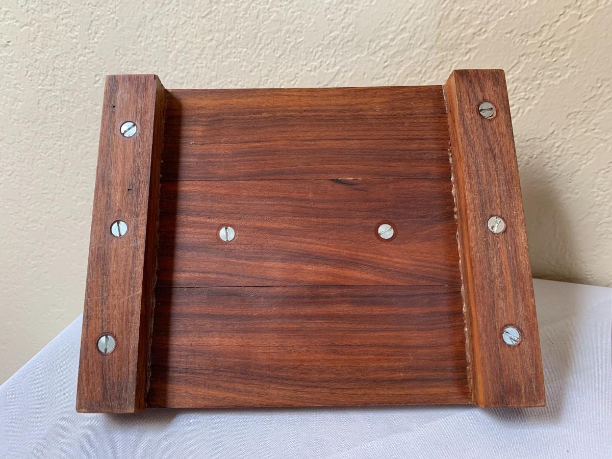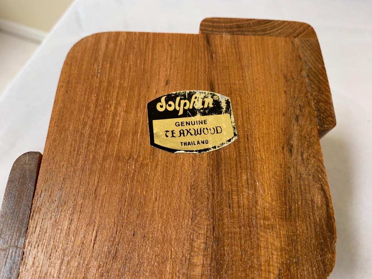 Assortment of mid century kitchen items including one Dansk designs Denmark IHQ 810 piece (ice bucket that is plastic lined), one baguette slicer made by Knolber, teak wood. Knife made in France by Sabatier. Set of coasters (teak wood made by Dolphin), one wood stand and one snuffler all in great condition with some normal wear