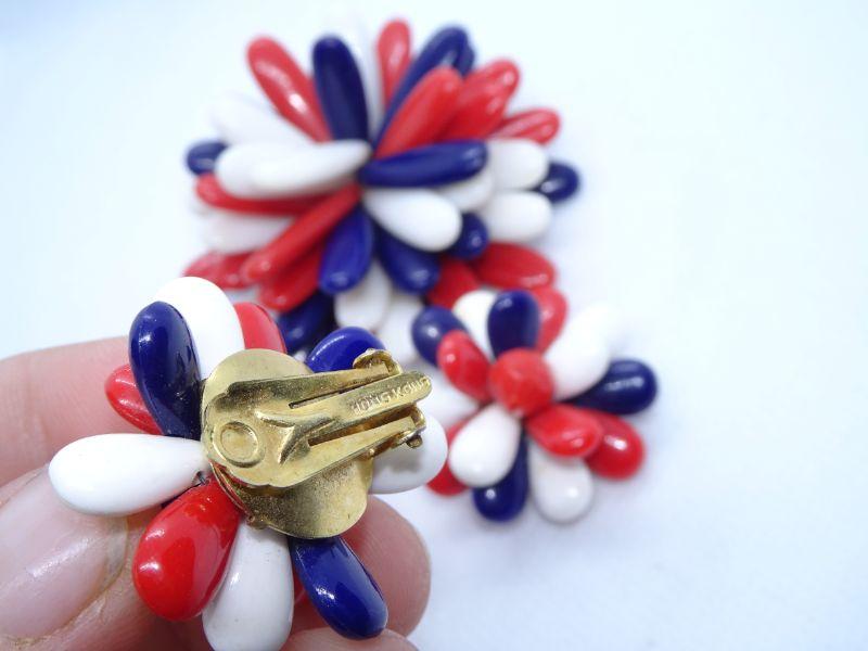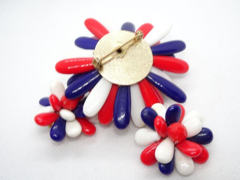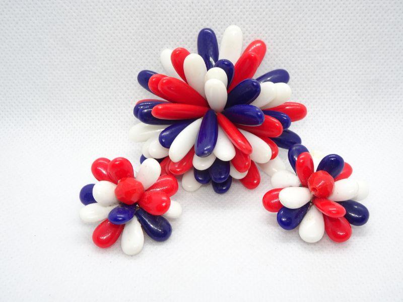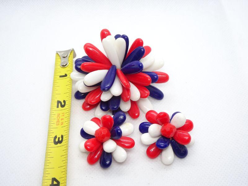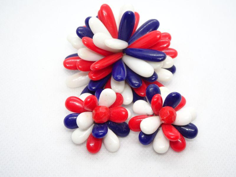 Mid Century Flower Brooch & Clip Earrings, Red, White, Blue, Plastic, Light Weight