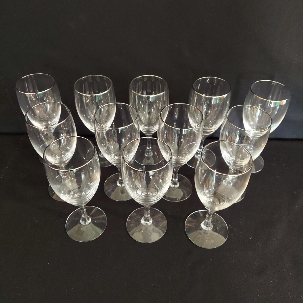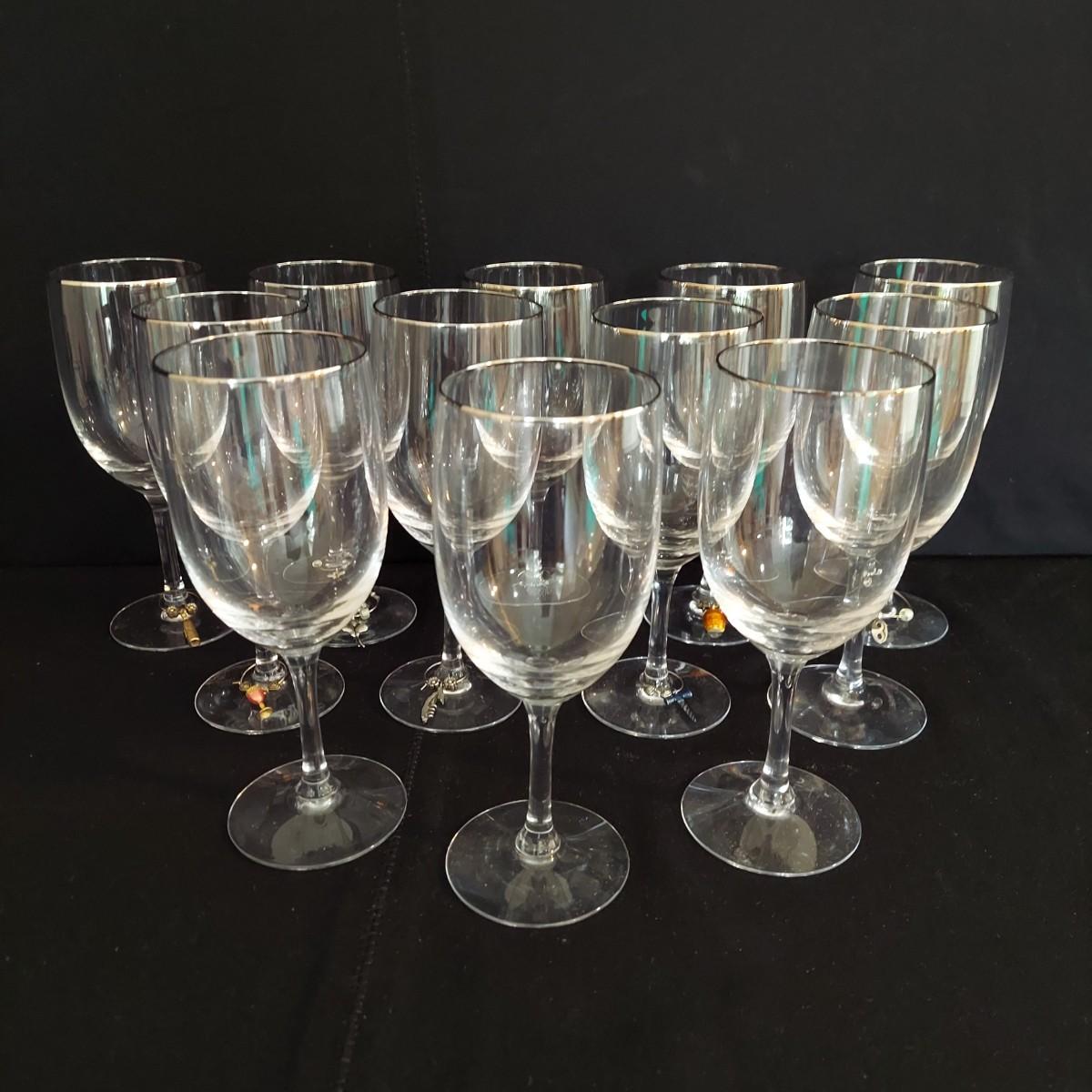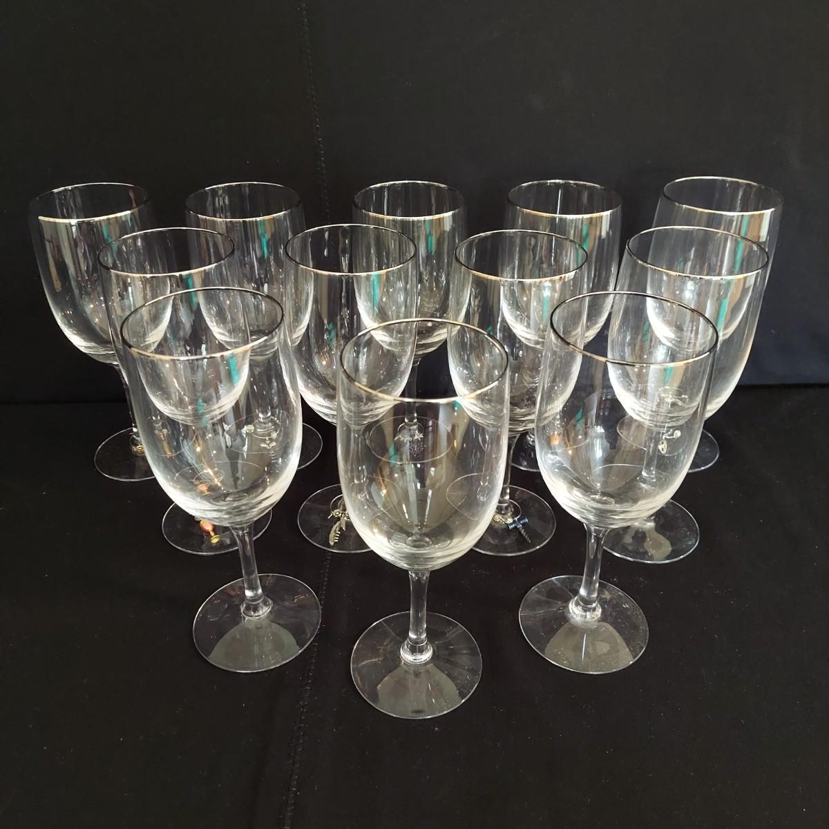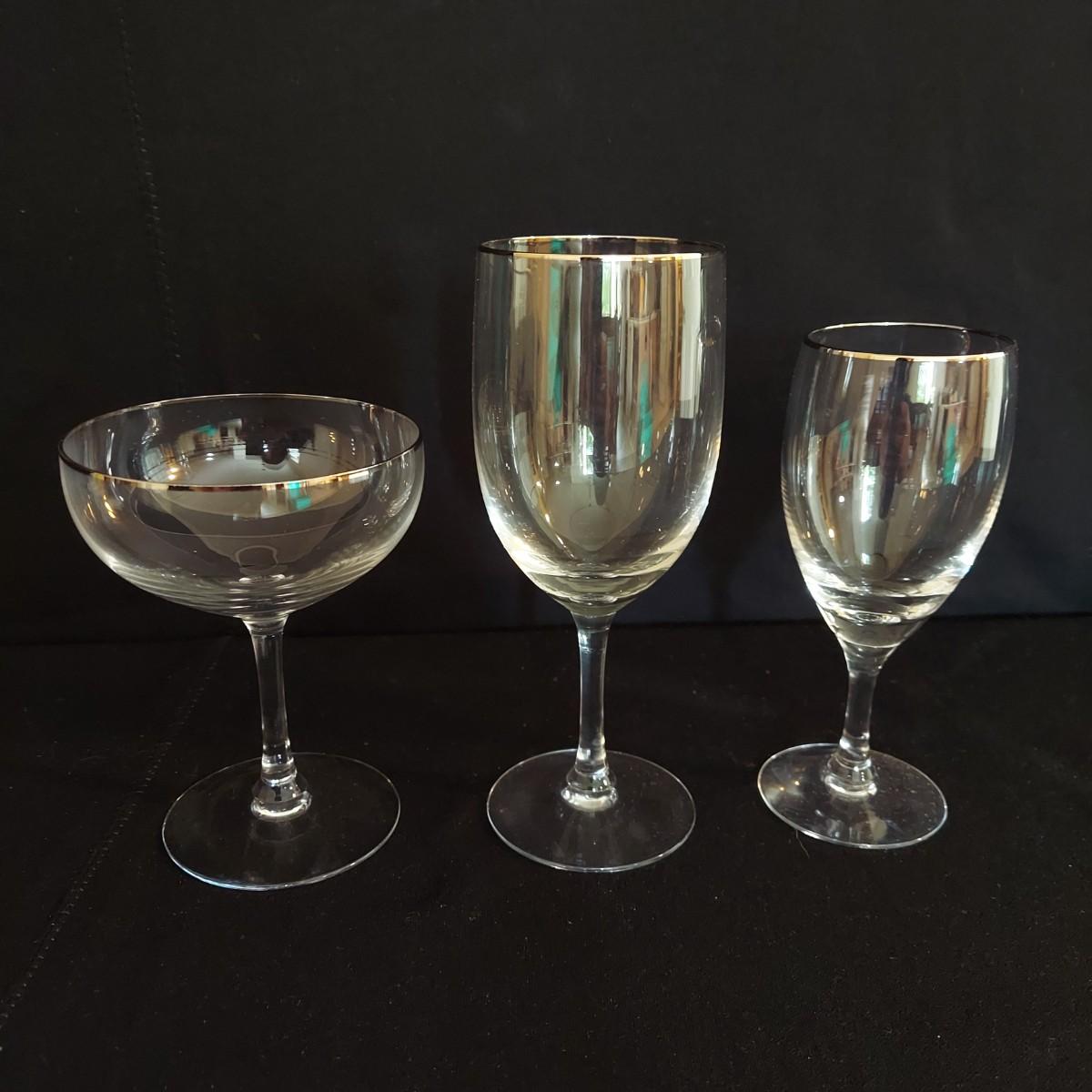 Mid Century Fostoria stemware. It appears to be crystal with a gold trim. There are 36 glasses total: 12 Champagne coupes that are 5" tall, 12 red wine glasses that are 7" tall and 12 white wine glasses that are 6" tall. Some of the red wine glasses have removable wine charms attached. Shipping available. Shipping can be costly. We suggest contacting our preferred local shipping provider, Postage Express, with dimensions and getting an estimate before bidding: (828) 670-5501 or postageexpress@yahoo.com.