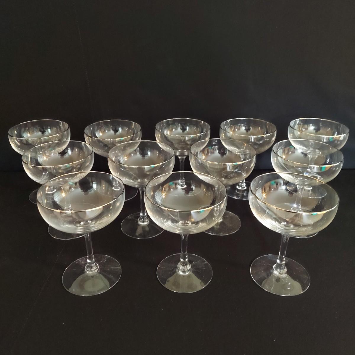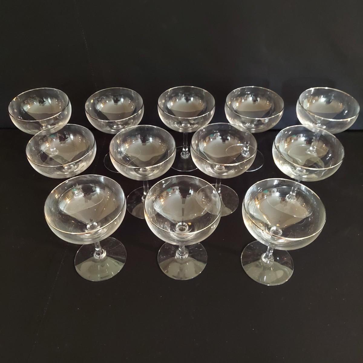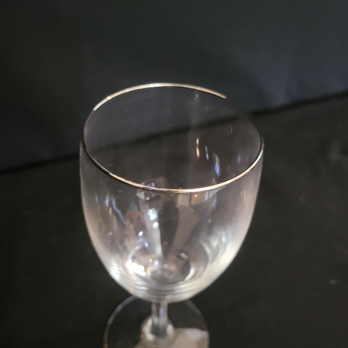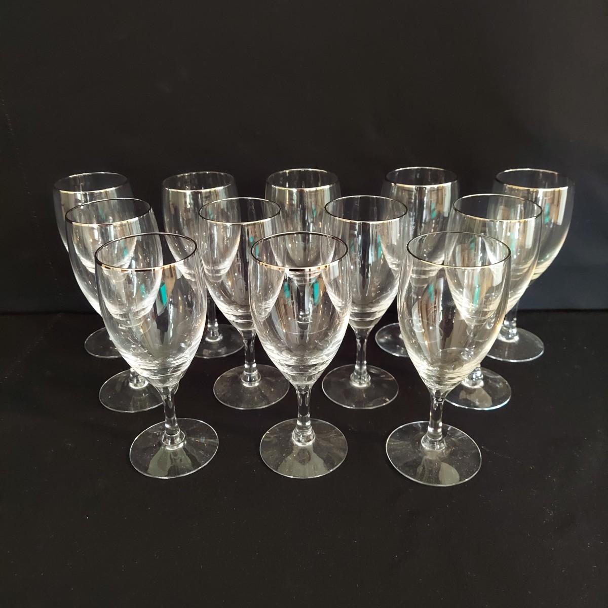Mid Century Fostoria stemware. It appears to be crystal with a gold trim. There are 36 glasses total: 12 Champagne coupes that are 5" tall, 12 red wine glasses that are 7" tall and 12 white wine glasses that are 6" tall. Some of the red wine glasses have removable wine charms attached. Shipping available. Shipping can be costly. We suggest contacting our preferred local shipping provider, Postage Express, with dimensions and getting an estimate before bidding: (828) 670-5501 or postageexpress@yahoo.com.